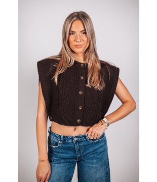 Deze spencer top komt in een gebreide stof, heeft een ronde hals, knoopjes in het midden en een leuk gevlochten patroon.