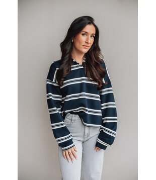 Deze polo heeft een donkerblauwe kleur met witte strepen. Het kraagje en de V-hals geven een stijlvolle uitstraling, terwijl de strepen zorgen voor een trendy touch!