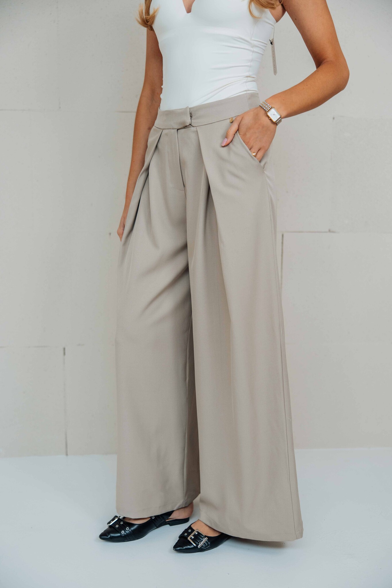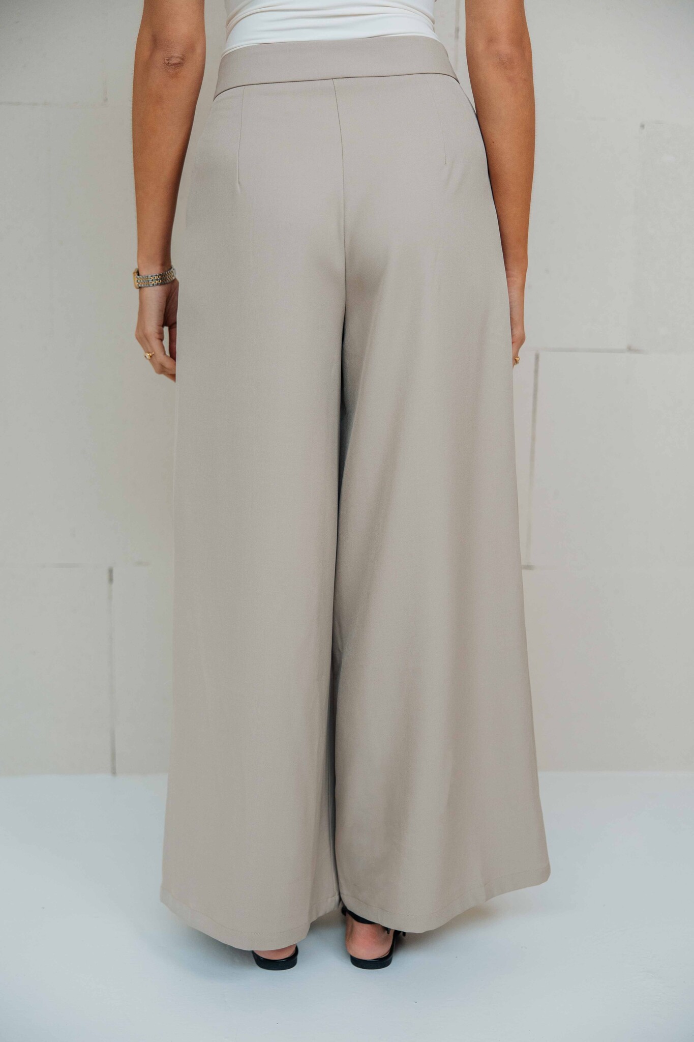 Deze wide leg pantalon heeft een tijdloze uitstraling met schuin lopende plooidetails aan de voorkant. Een perfecte basic die niet mag ontbreken in je garderobe!