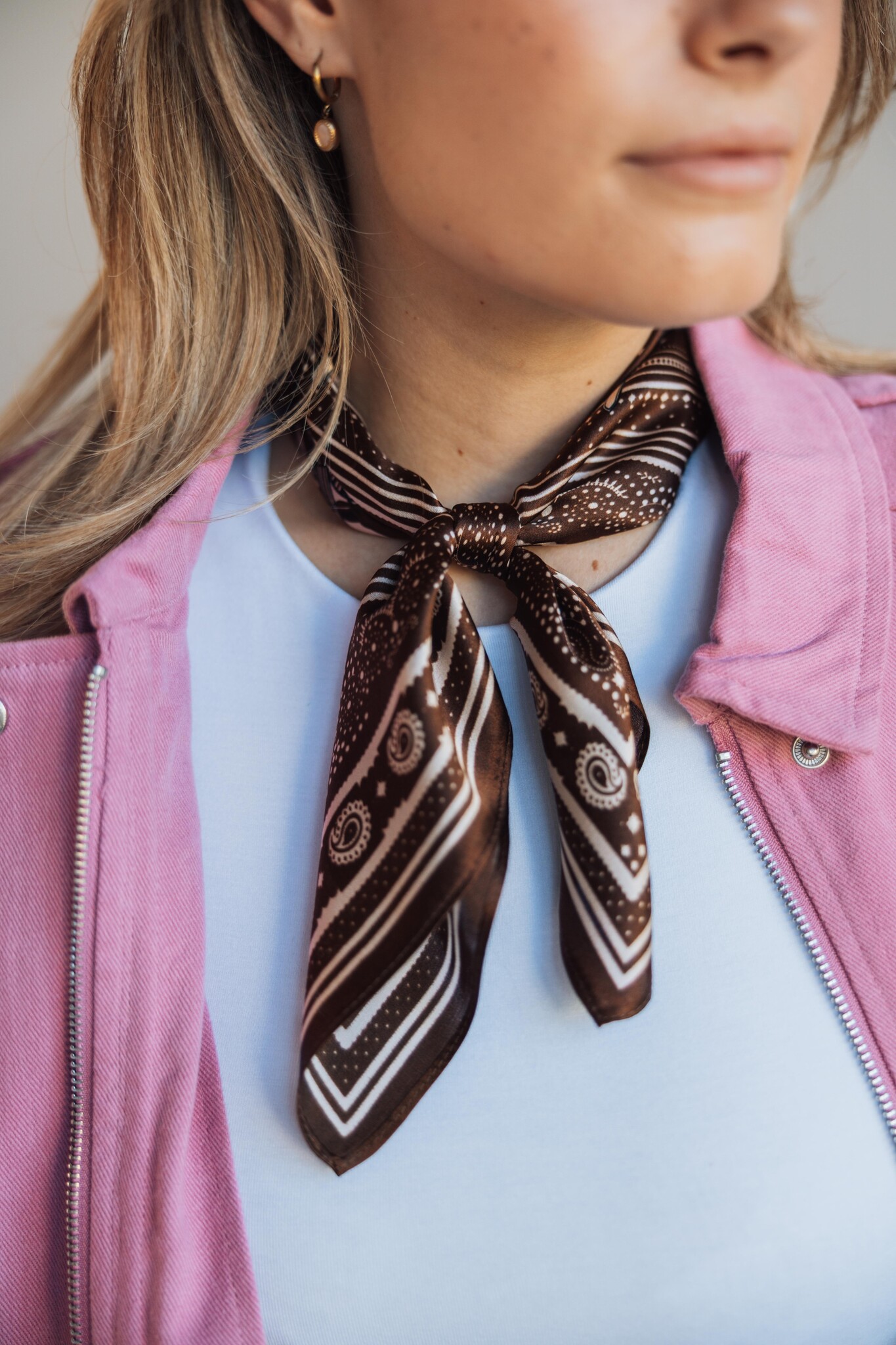 Dit bruine sjaaltje met paisley print is het perfecte accessoire voor elke look. De warme kleur en de sierlijke print geven een stijlvolle vibe. Draag ‘m losjes om je nek, knoop ‘m aan je tas of style als haaraccessoire – één sjaaltje, eindeloze opties!