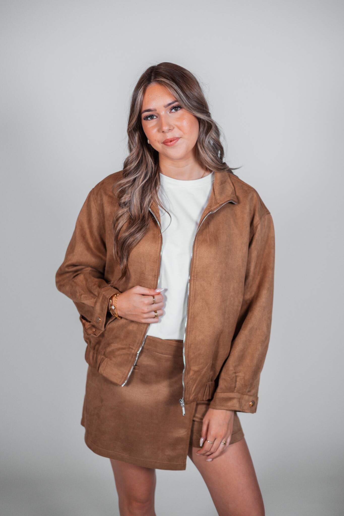 Deze skort heeft een overslag model, een ritssluiting aan de zijkant en is gemaakt van een suède stofje. Combineer het met het bijpassende jasje voor een complete city look.
