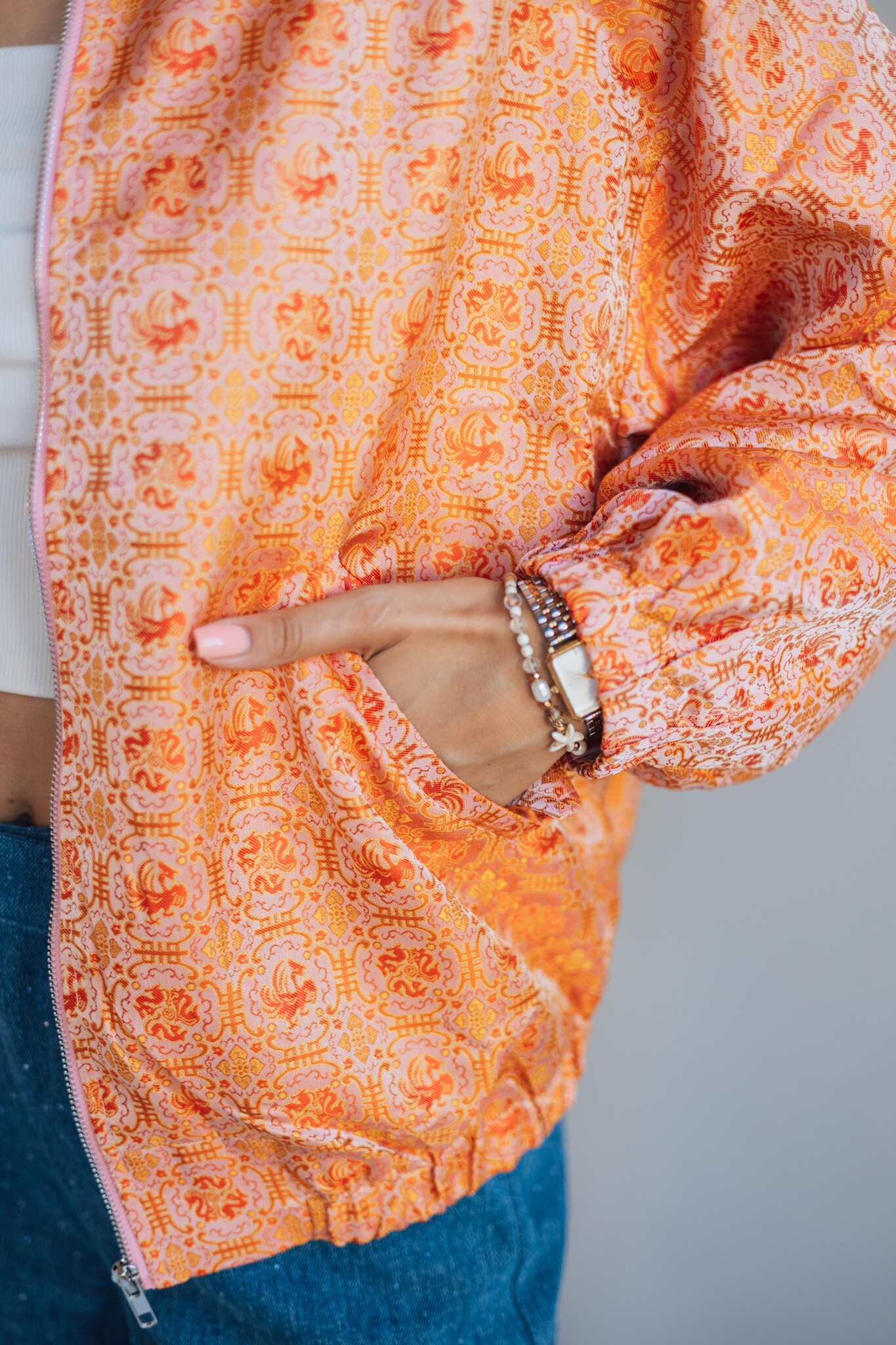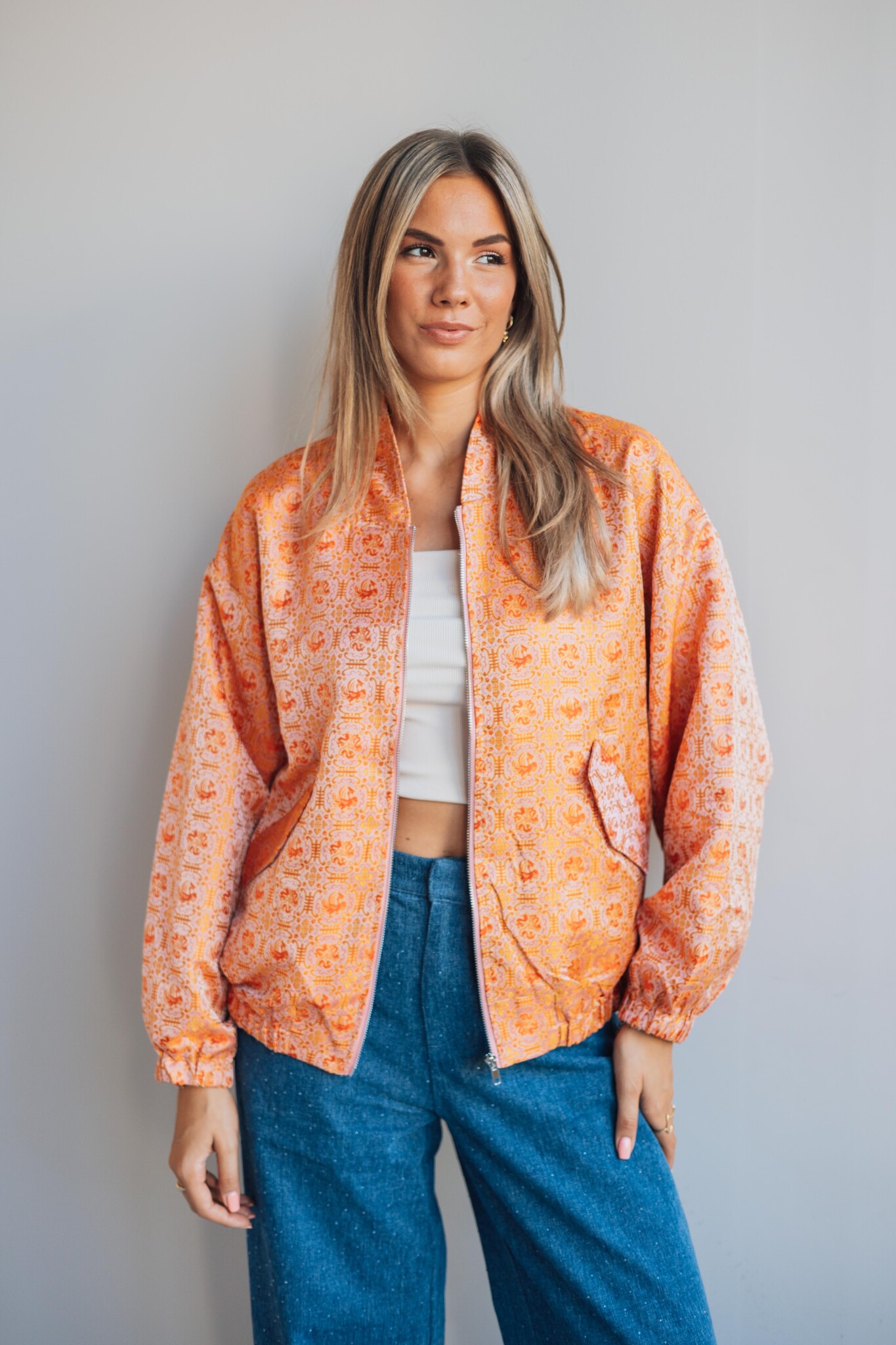 Dit jasje van Studio Amaya valt op door de kleurrijke oranje print, een echte eye-catcher. Voorzien van klep- en steekzakken én elastiek in de manchetten en onderkant, zodat je ‘m makkelijk kunt stylen zoals jij wilt. Bold, fun & super draagbaar!