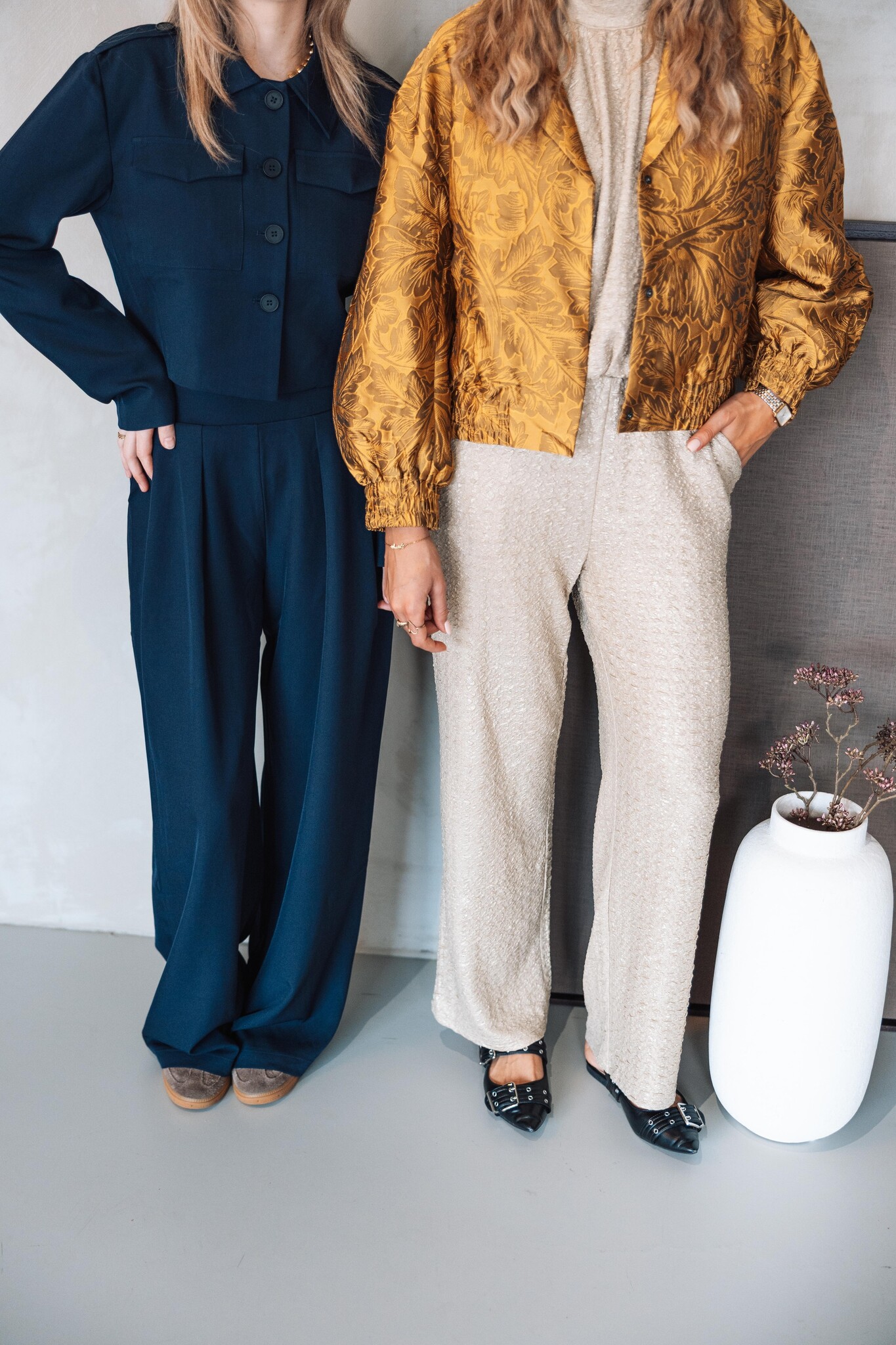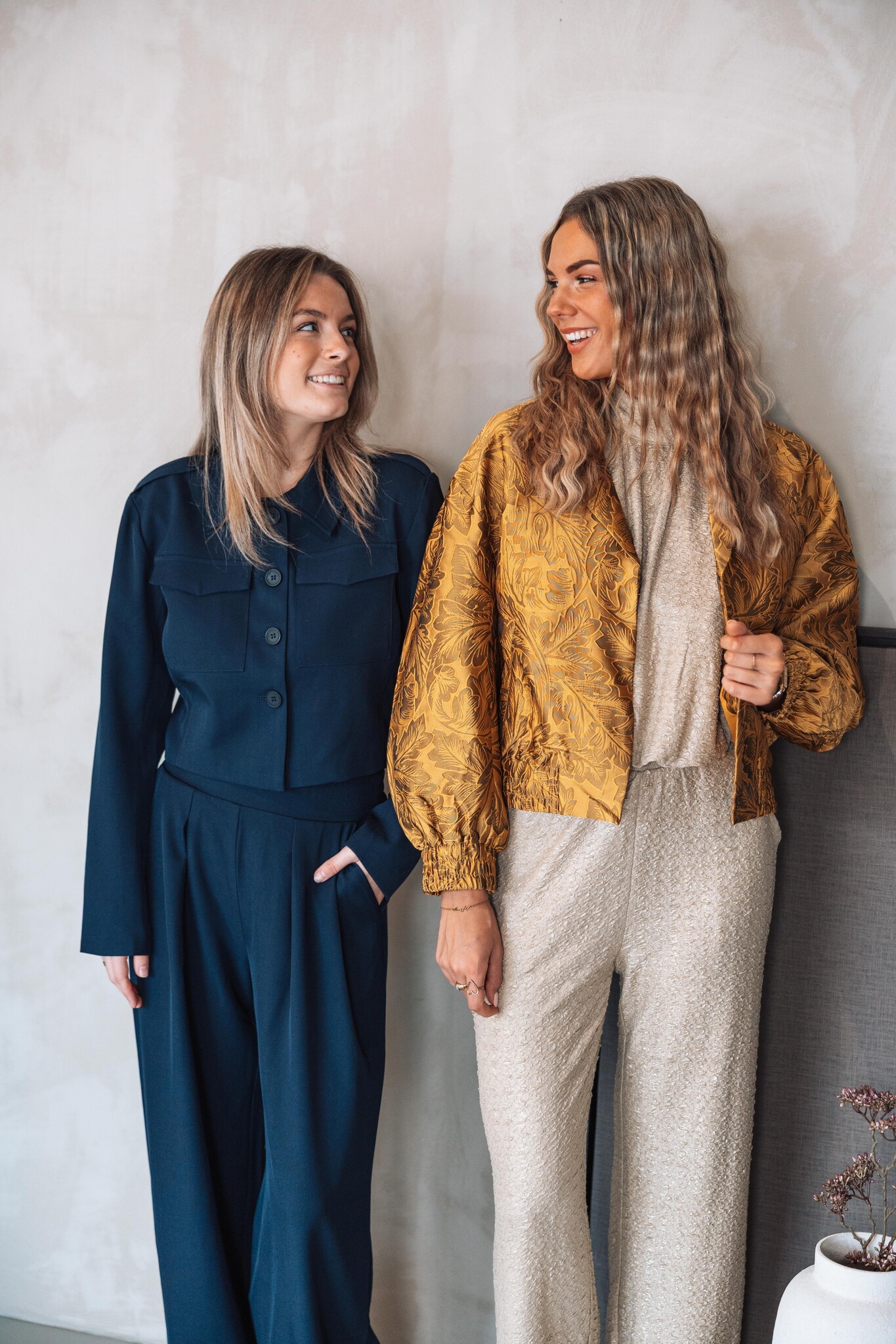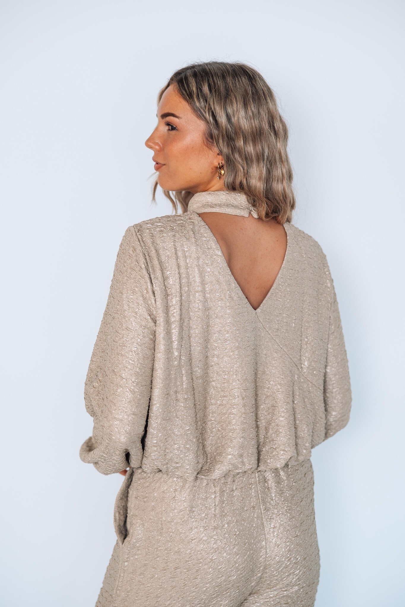 Deze top van Studio Amaya heeft plooidetails, een elastische taille en wijde mouwen. De feestelijke gouden stof en V-open rug maken de top perfect voor party looks.