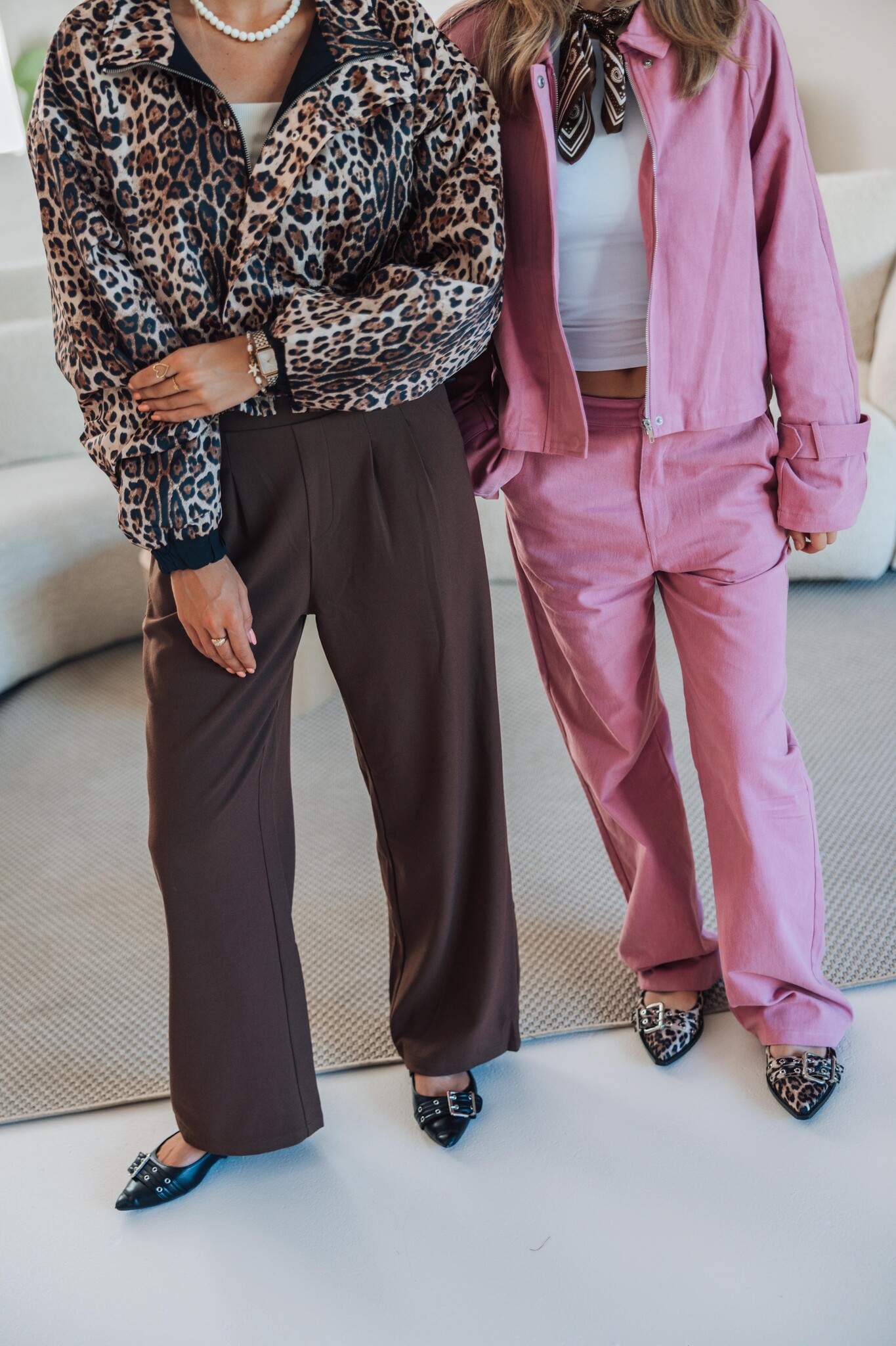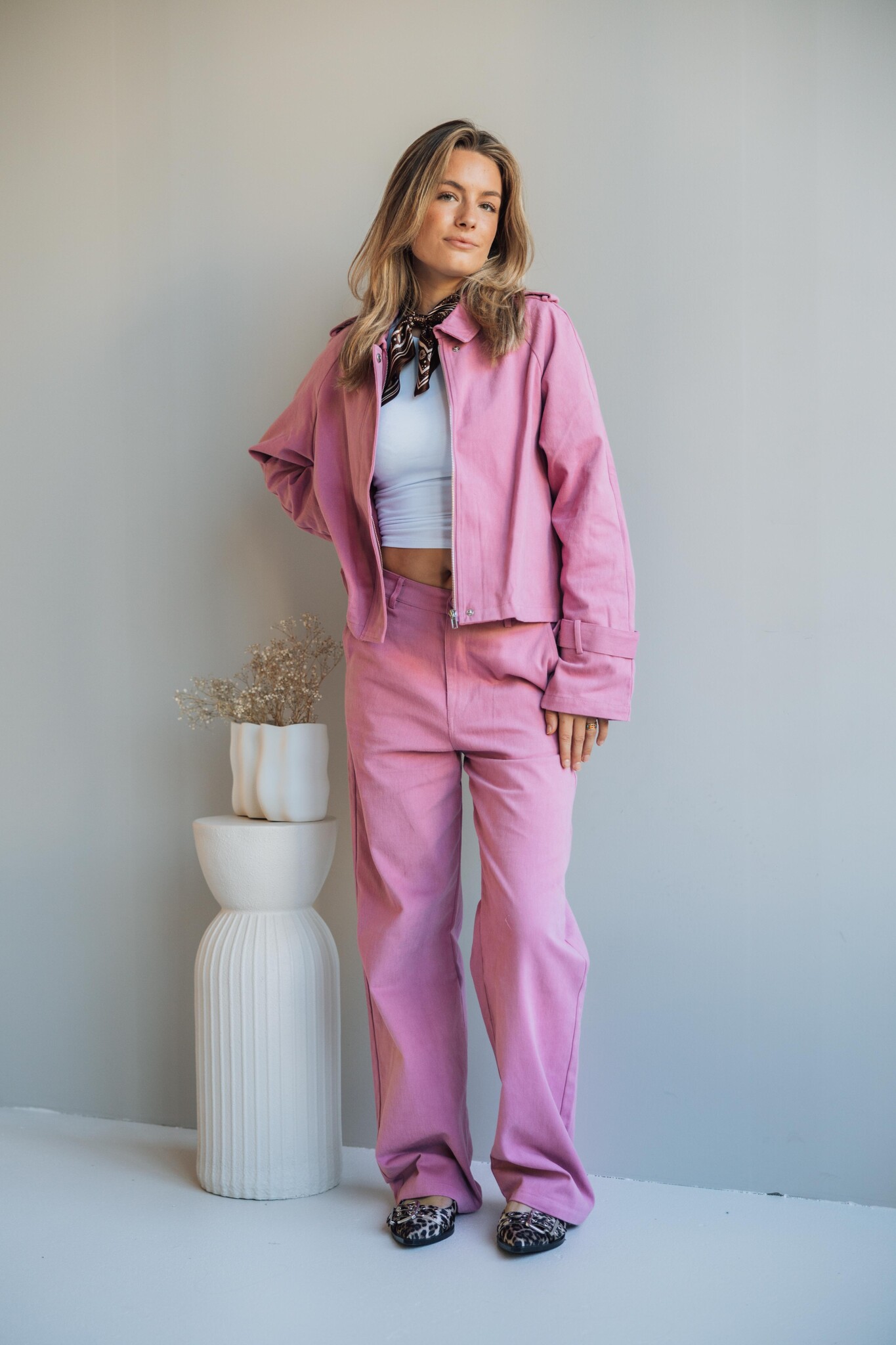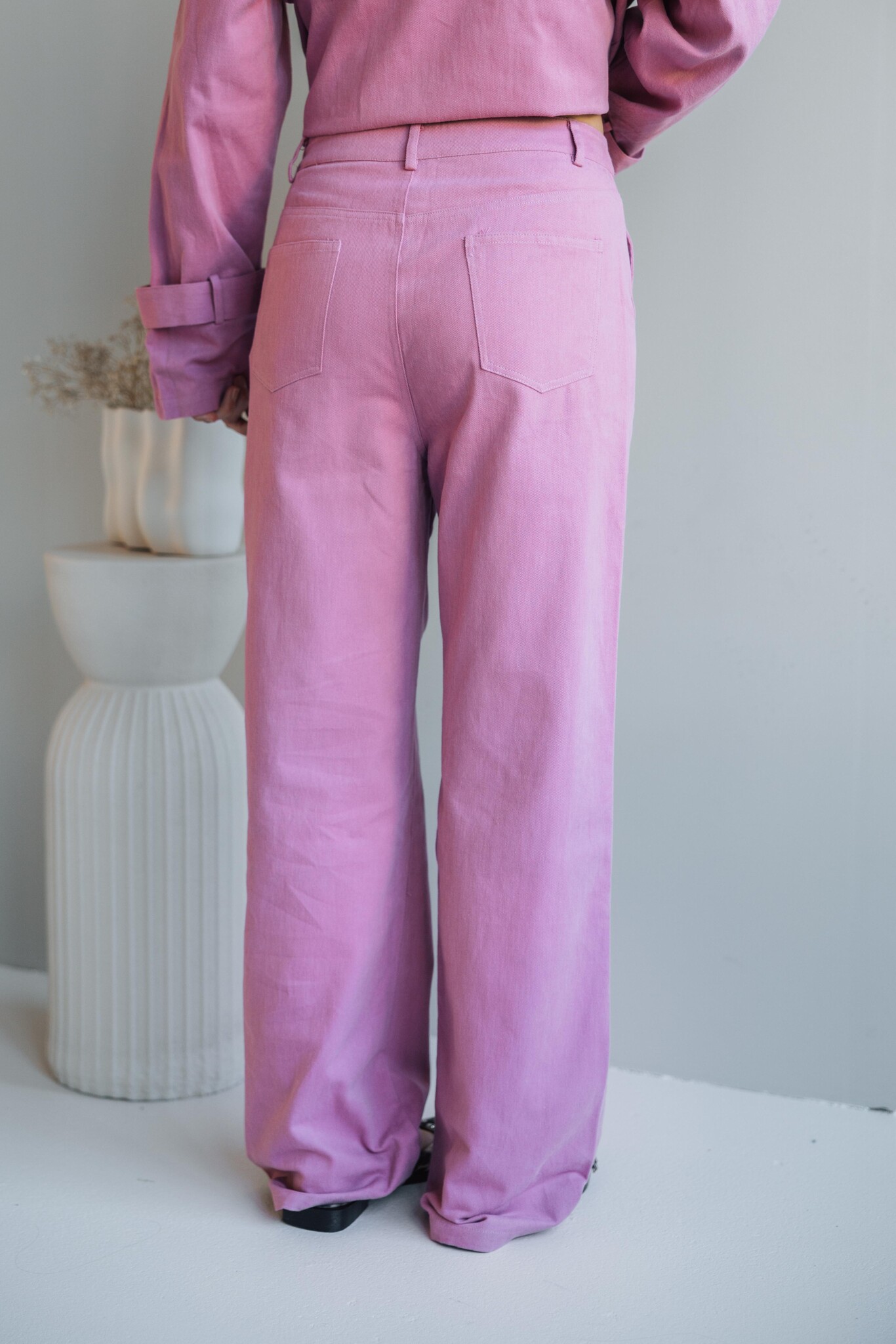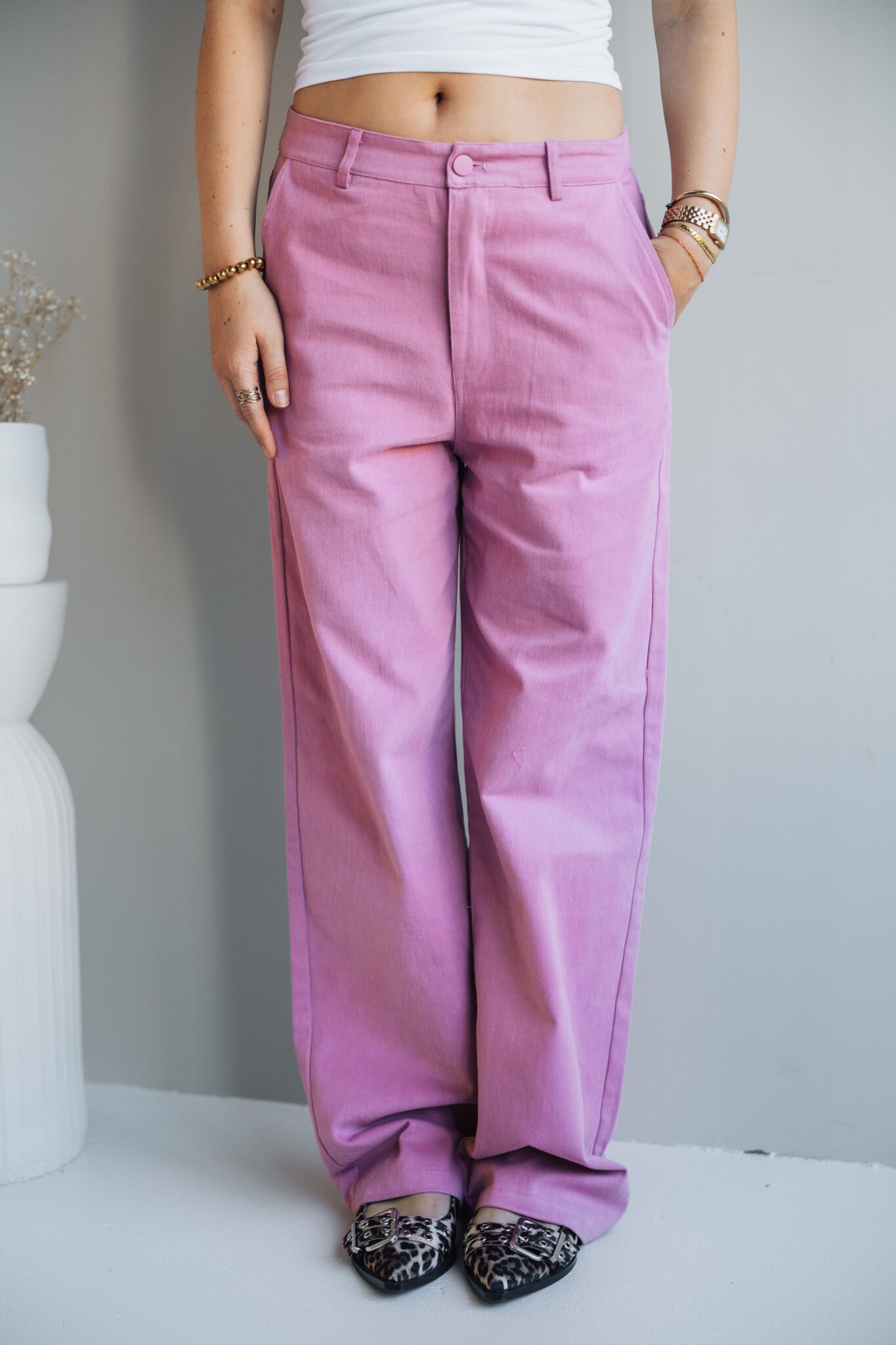 Deze broek van Studio Amaya is een denim, maar dan roze! De taille valt half hoog en de pijpen lopen licht wijd uit. De perfecte broek om je garderobe net even wat speelser te maken.