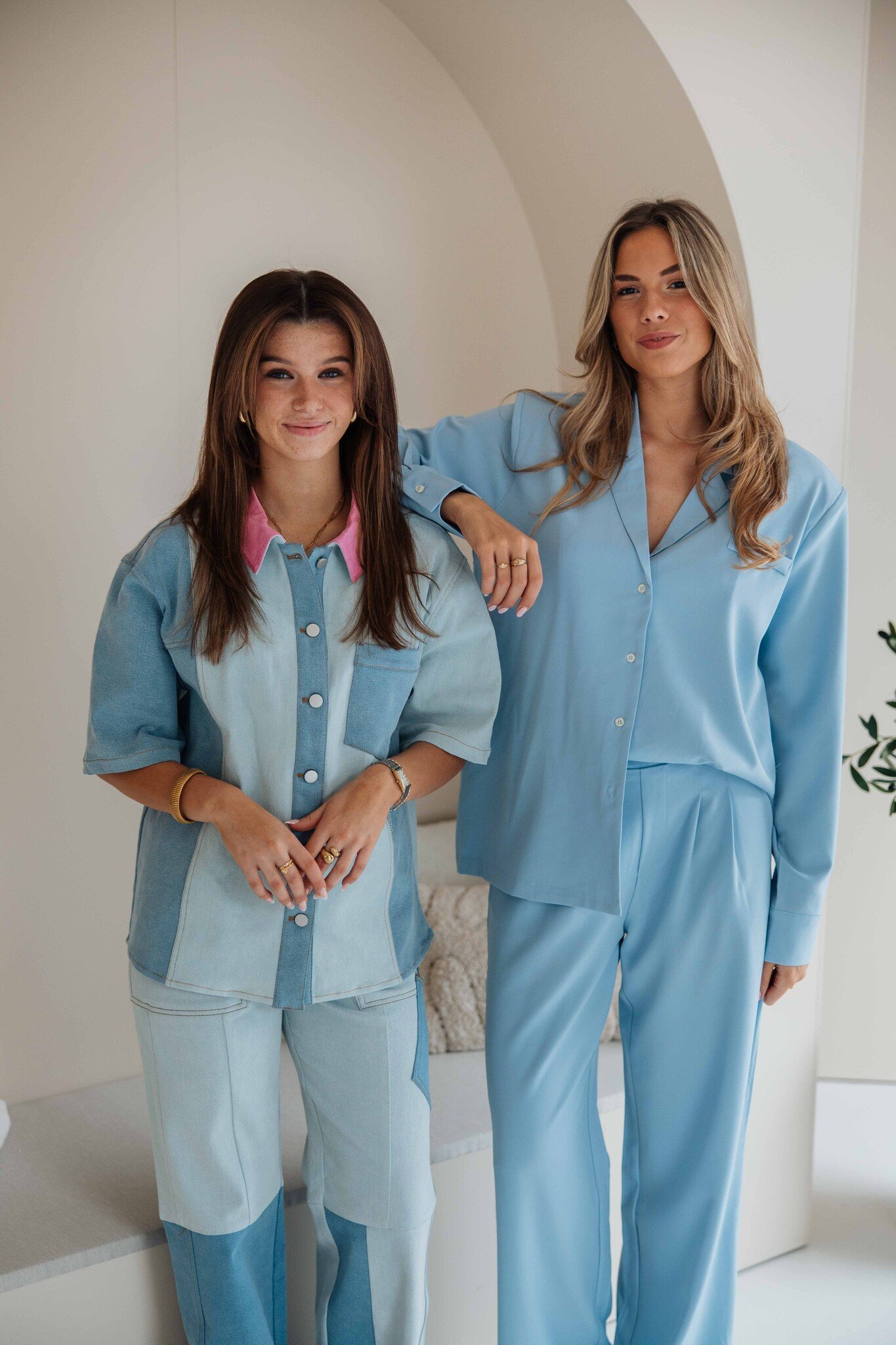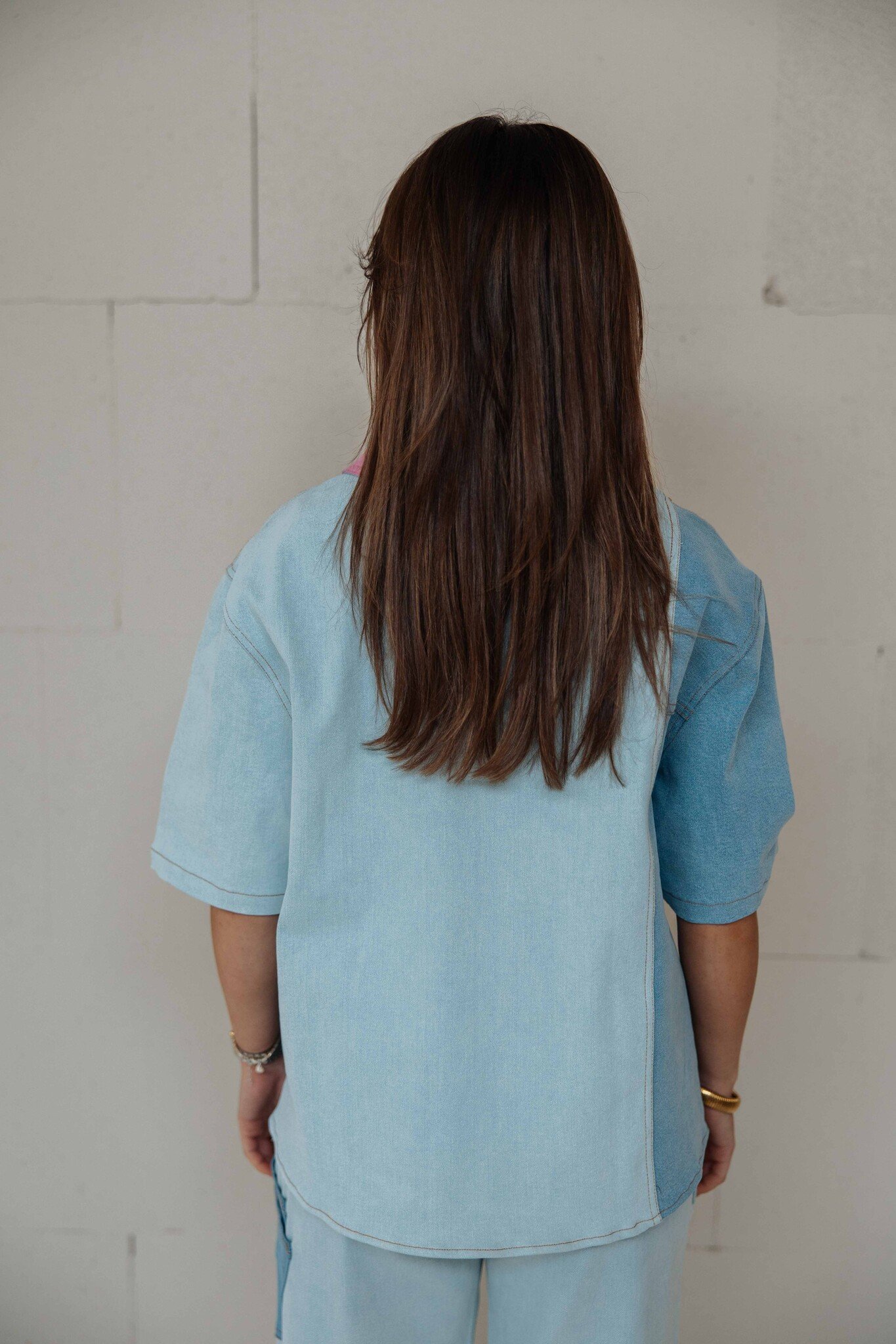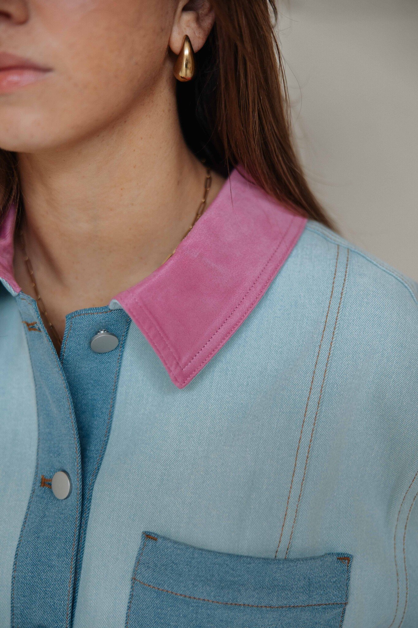 Dit jasje van Studio Amaya is leuk te dragen als blouse en geeft je outfit direct een trendy touch. Met twee verschillende kleuren denim als detail en een roze gekleurd kraagje is dit een echte eyecatcher!