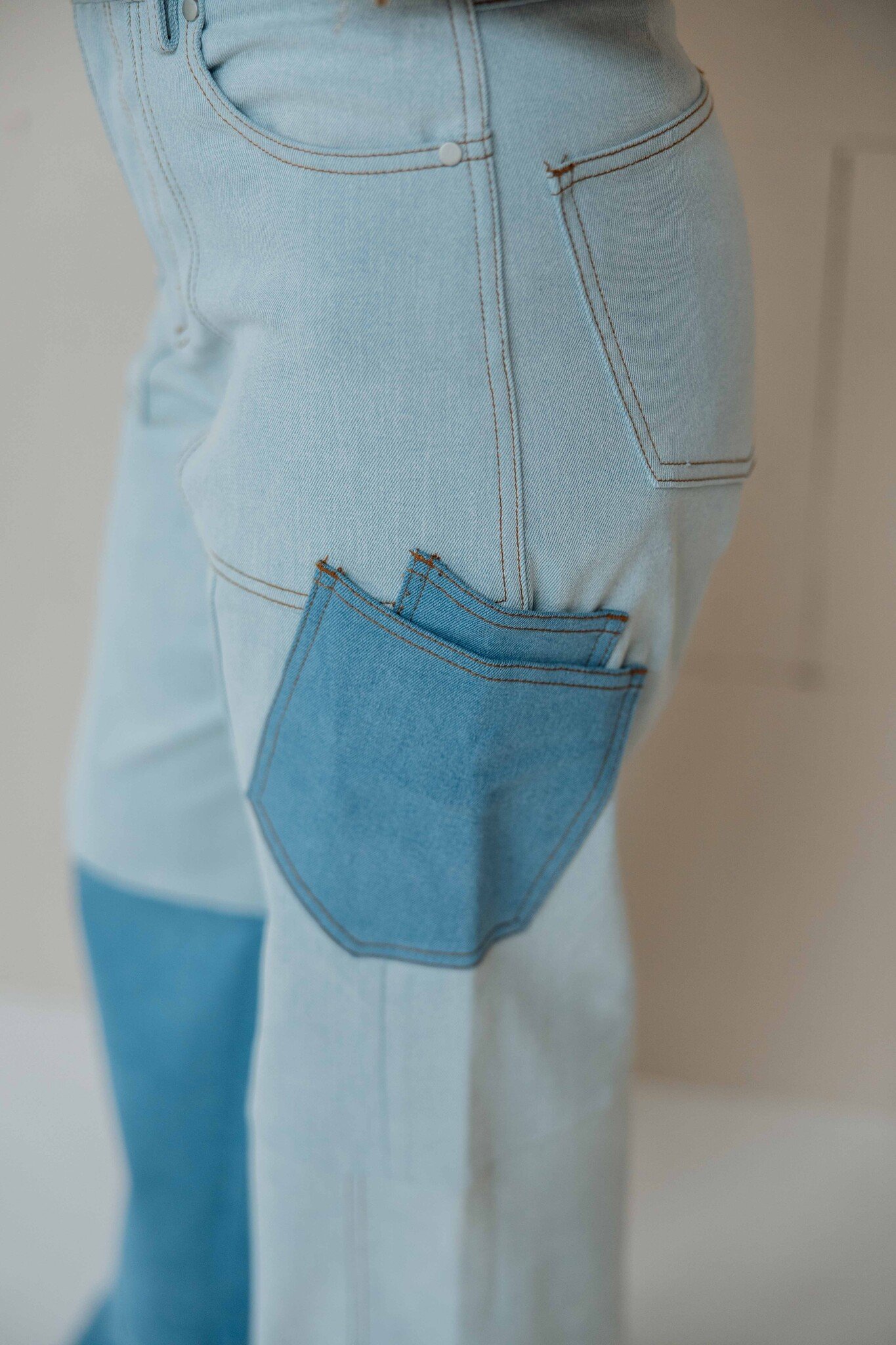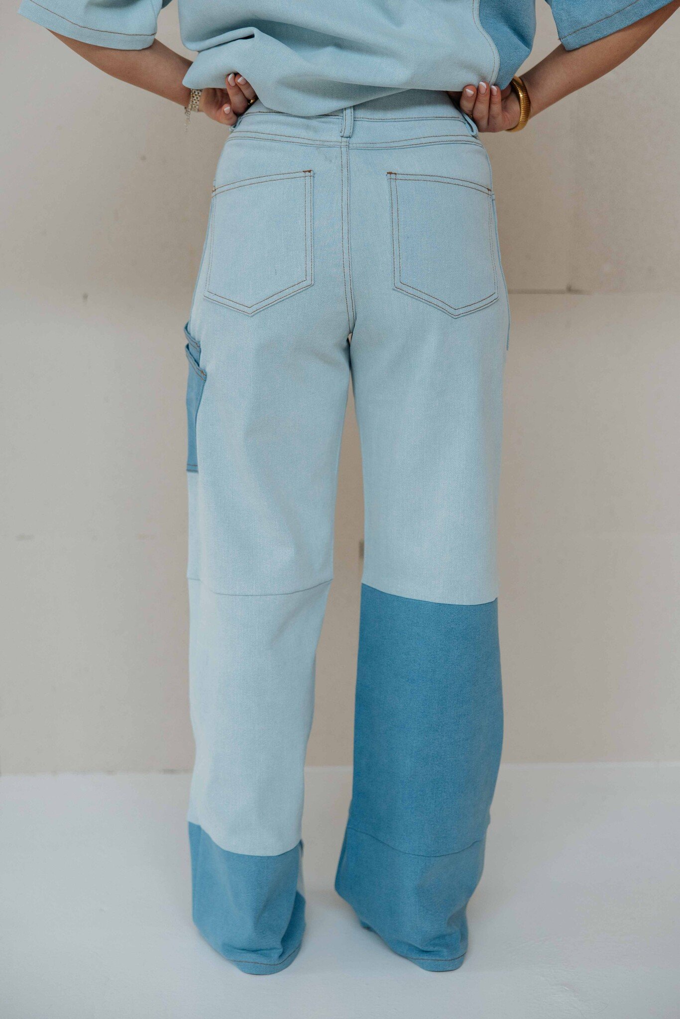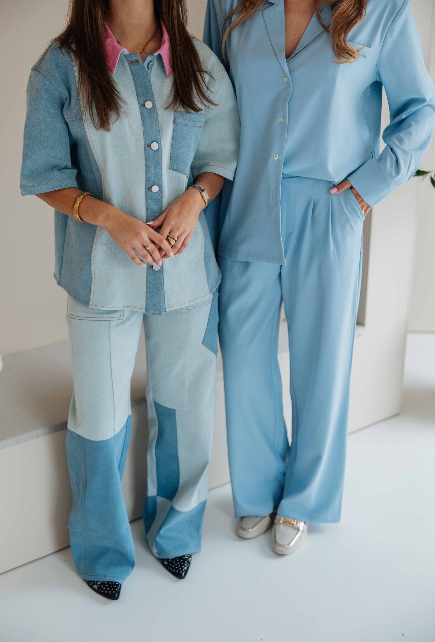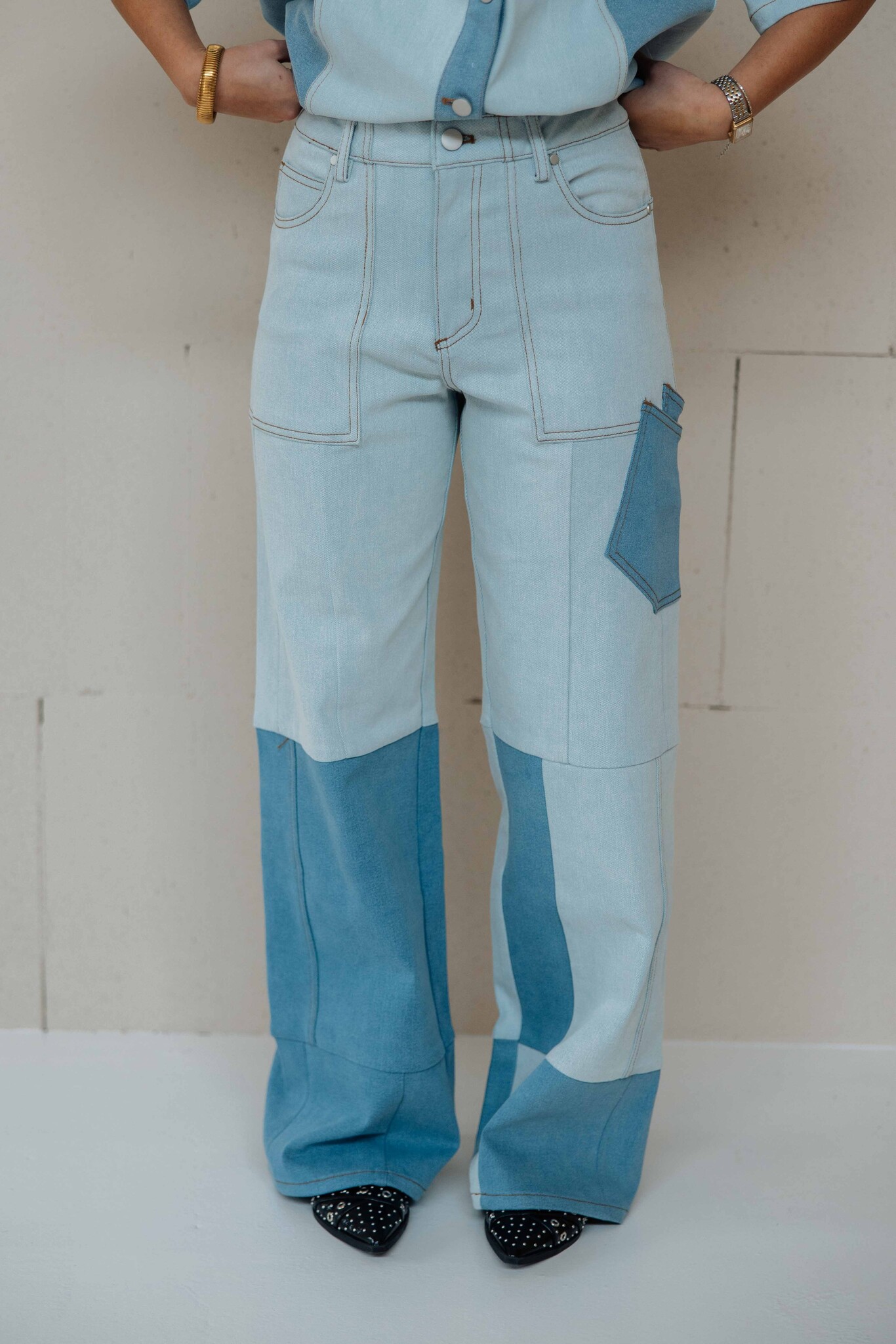 Deze broek van Studio Amaya heeft een hoge taille en wijde pijpen. De denim patches geven deze broek een unieke en trendy uitstraling. Leuk om te combineren met de bijpassende blouse!
