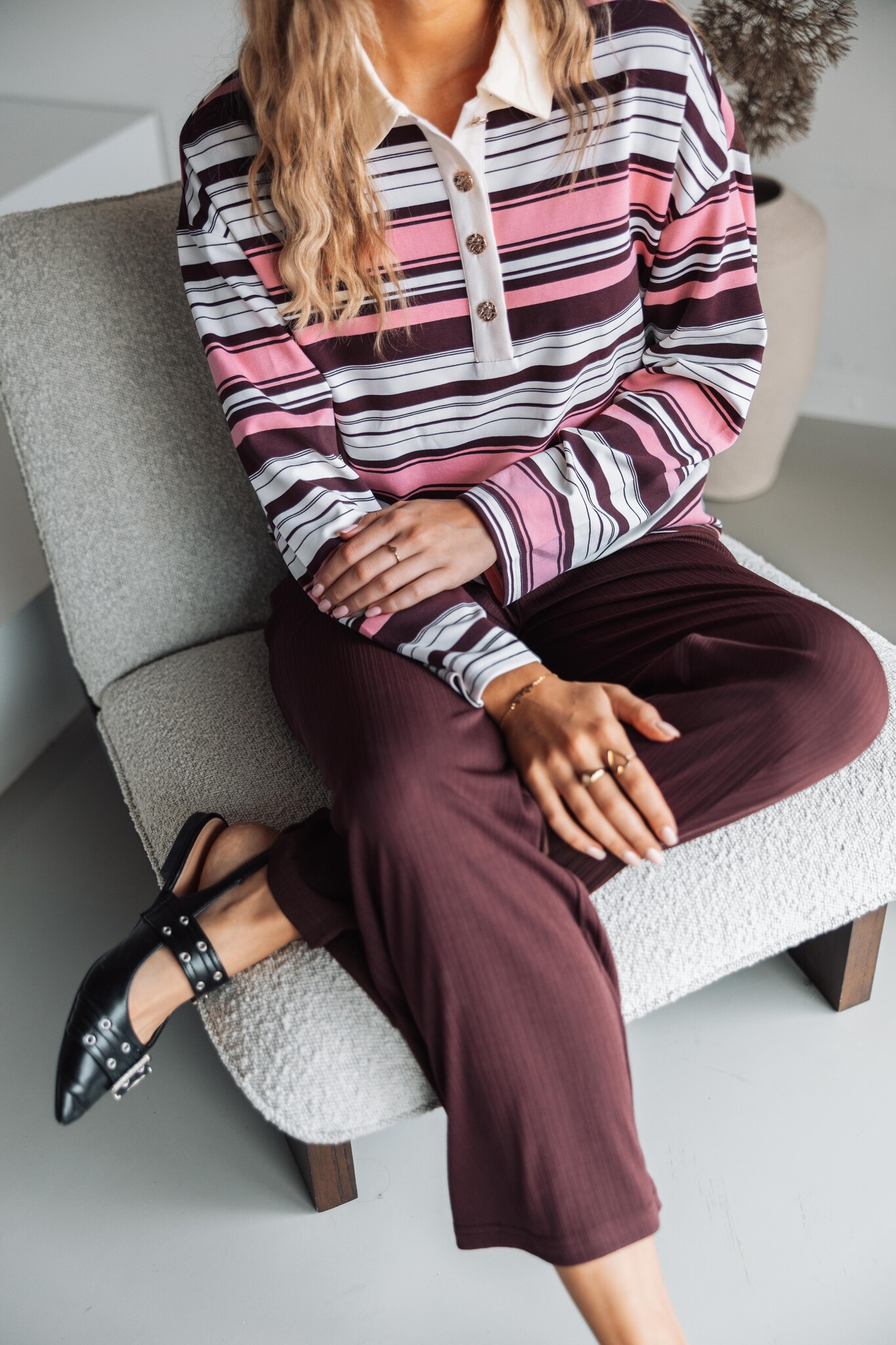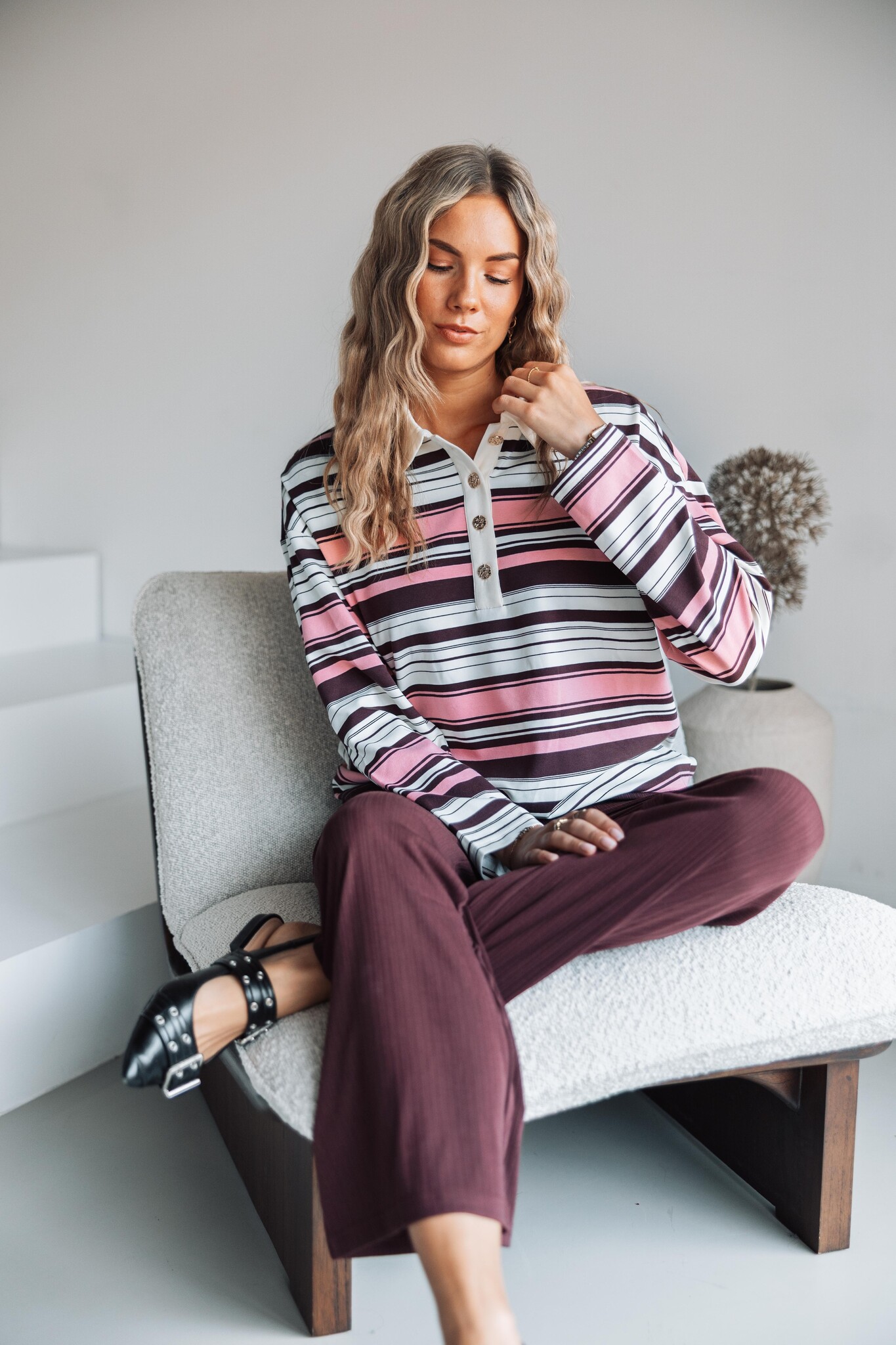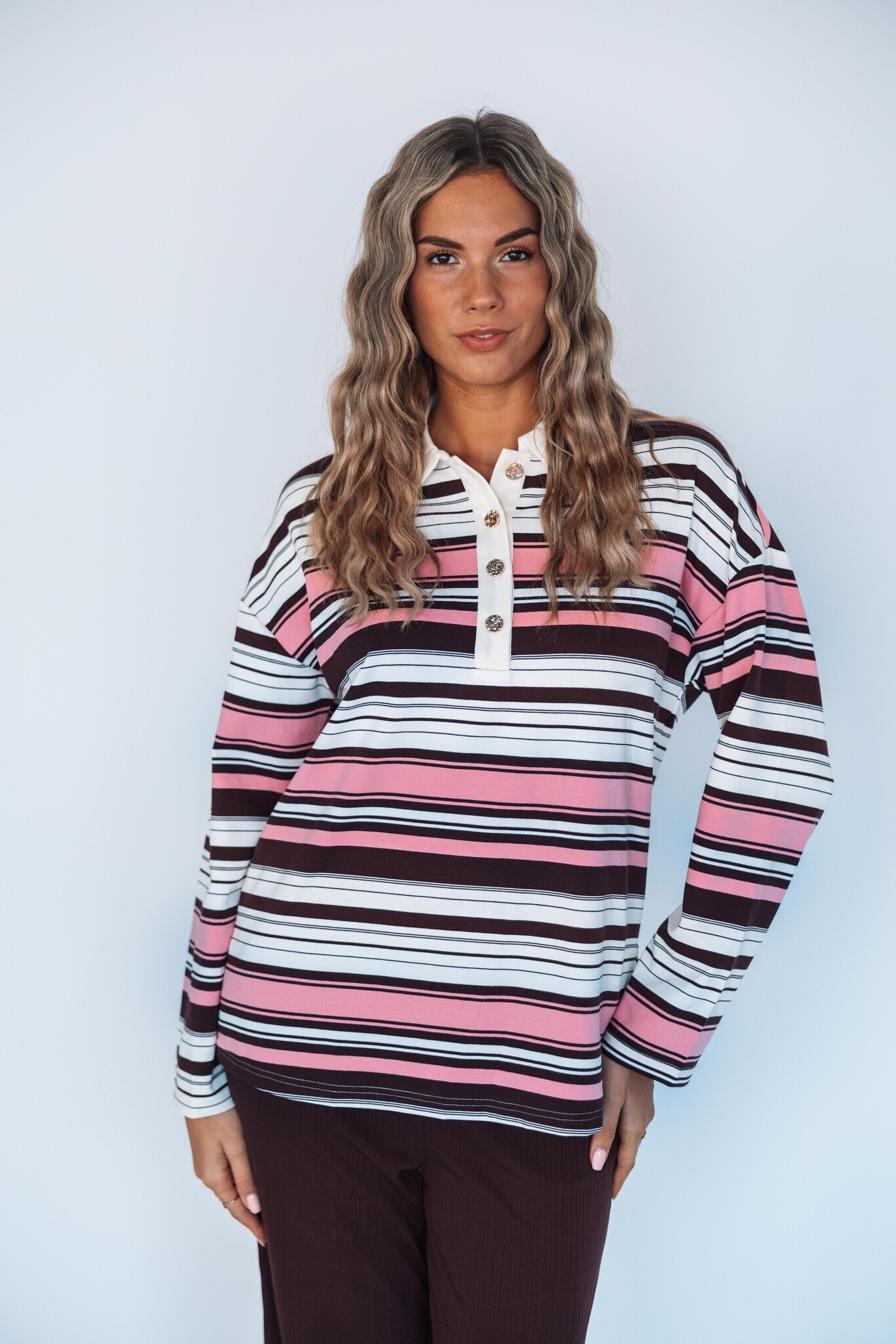 Deze sweater van Studio Amaya is kleurrijk, zacht en comfy. De sweater heeft een losvallende fit, trendy streeppatroon, gouden knopen en lage schoudernaden voor een casual look.