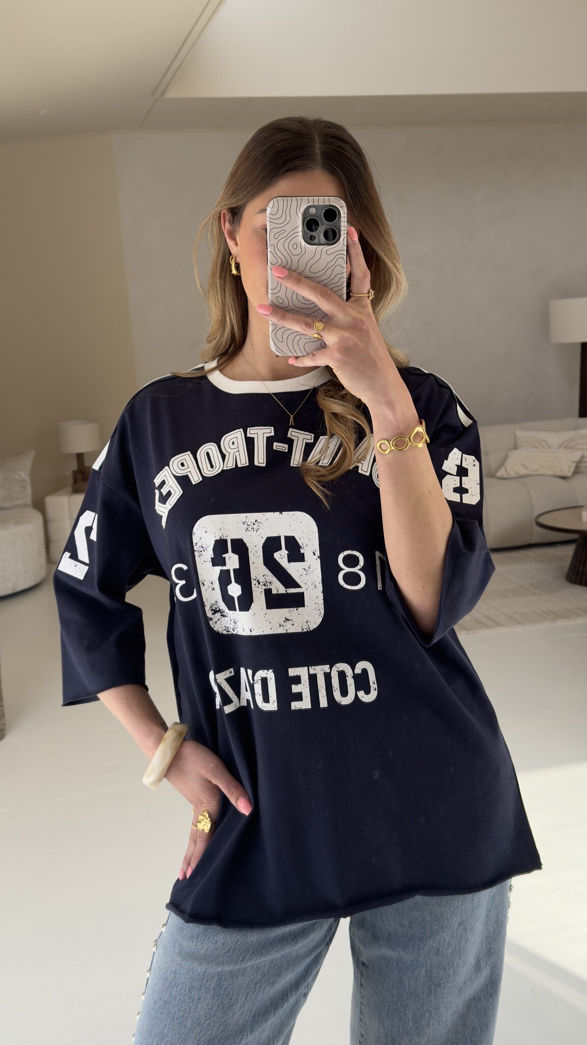 Trend alert! Dit t-shirt heeft een jersey look met een baseball fit en leuke tekst details. Perfect voor het festival seizoen!