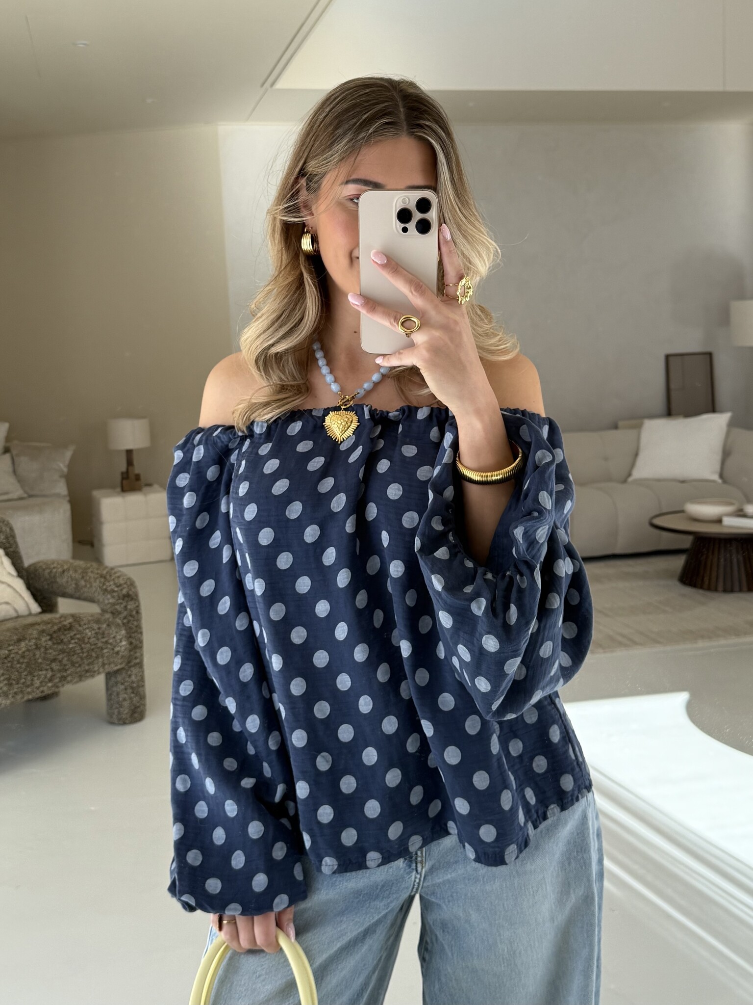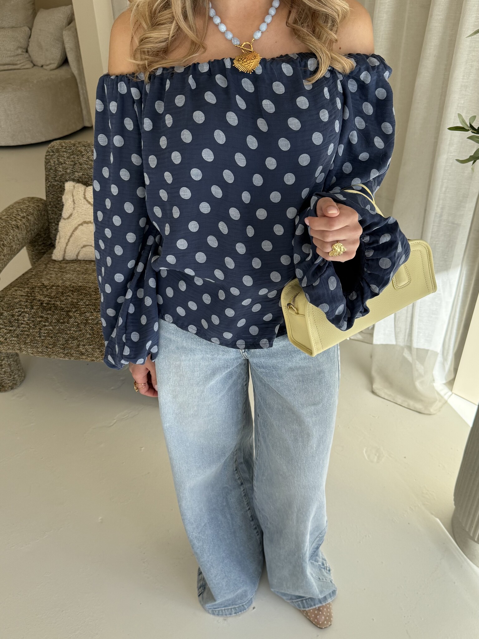 Deze off-shoulder top heeft een speels pofmodel en is uitgevoerd in een trendy polkadot print. De luchtige pasvorm zorgt voor een zomerse uitstraling.