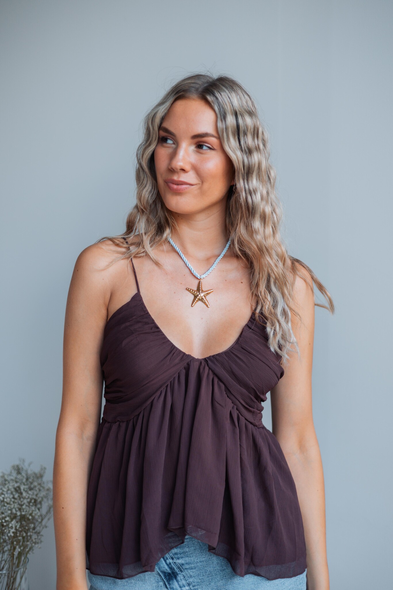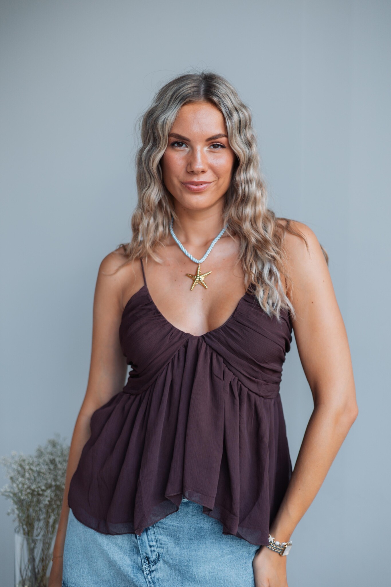 Deze flowy top is lekker luchtig, heeft verstelbare spaghetti bandjes, is gevoerd en heeft een diepe v-hals.