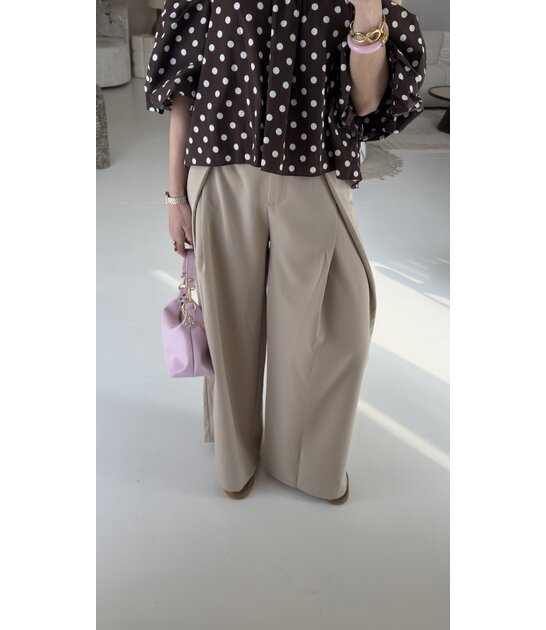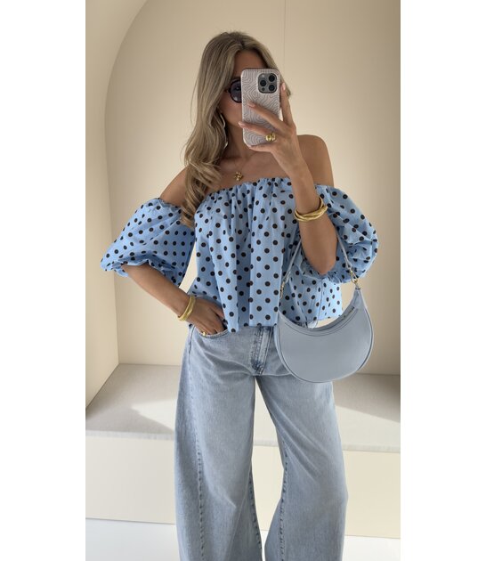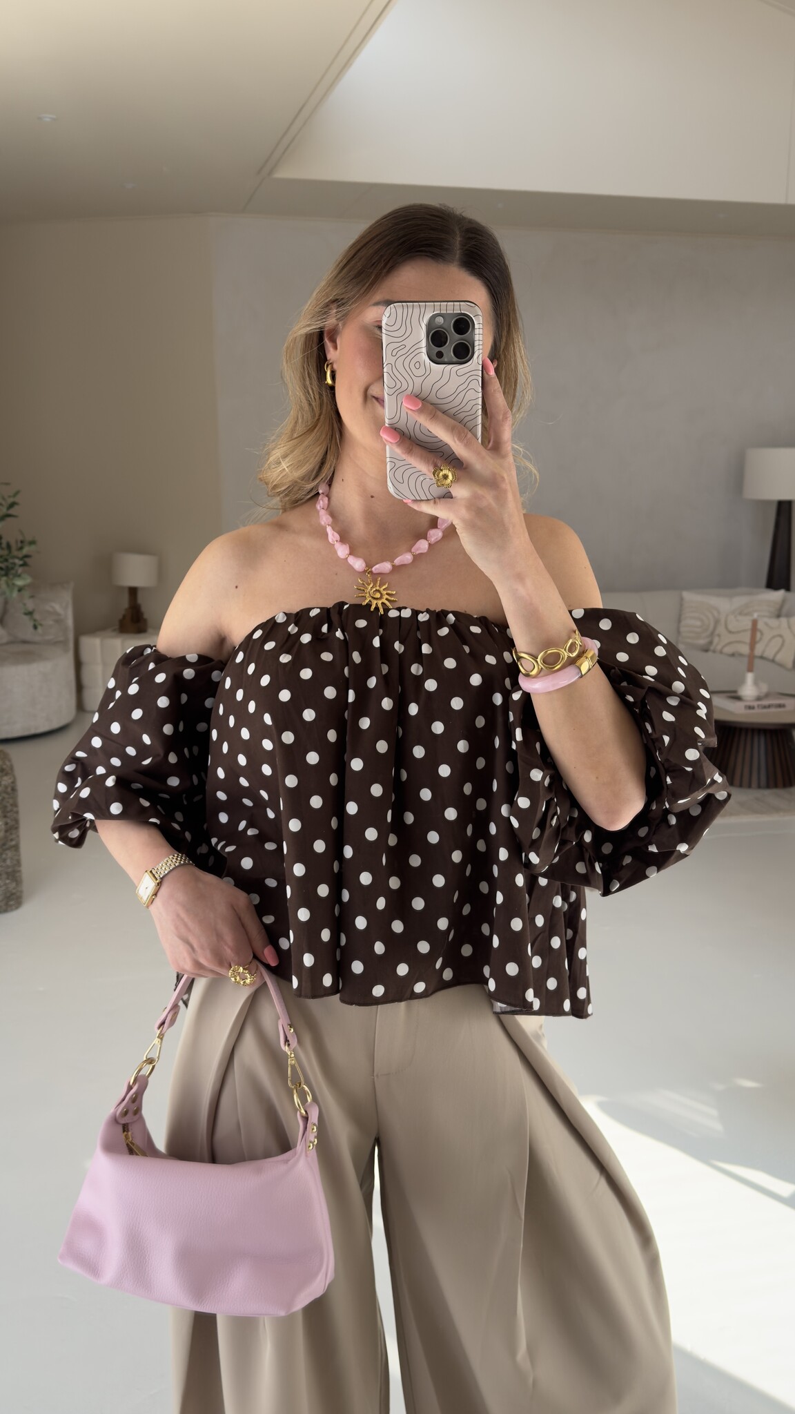 Deze off-shoulder top in een bruine kleur heeft een speels pofmodel en is uitgevoerd in een trendy polkadot print. De luchtige pasvorm zorgt voor een zomerse uitstraling.