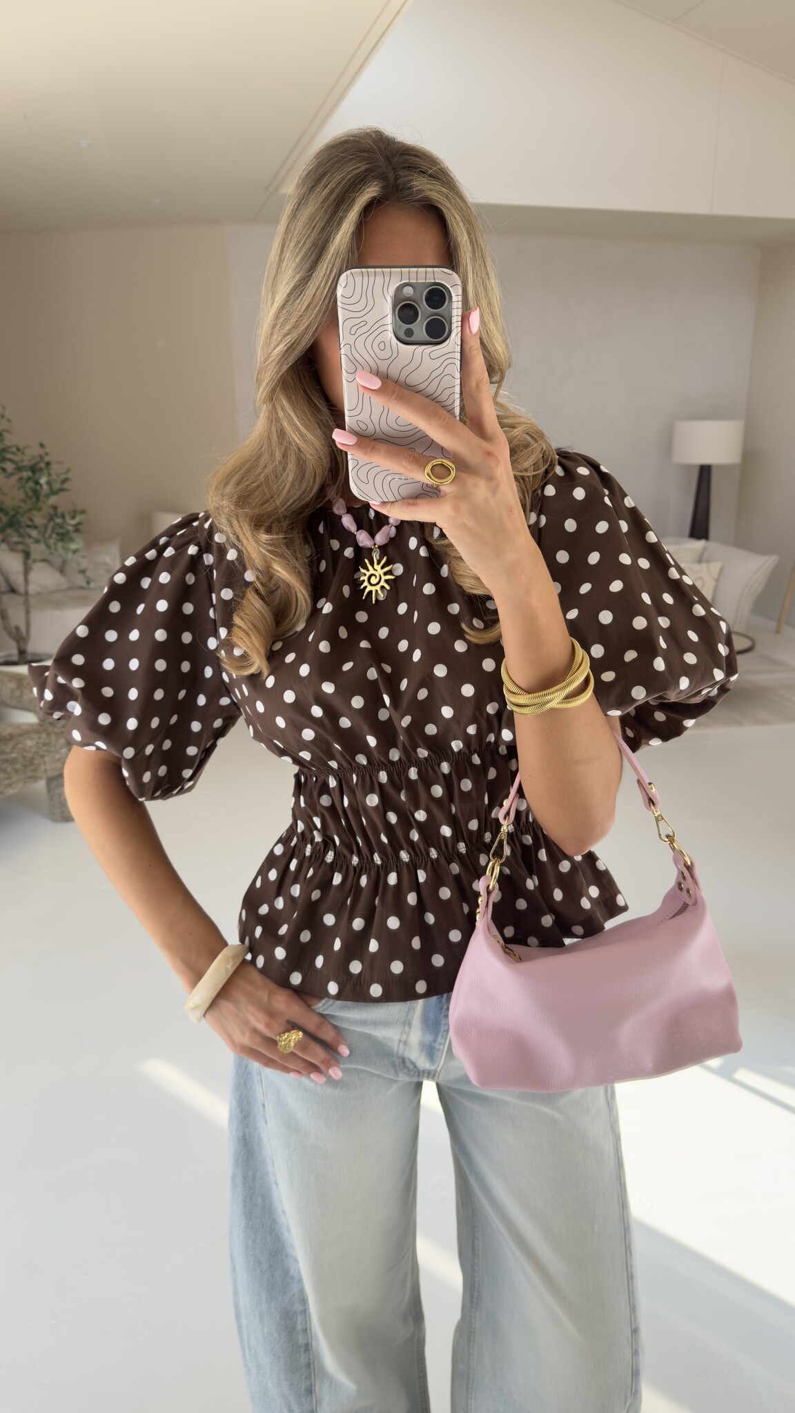 Deze top heeft een speels polkadot patroon en een flatterend peplum model met pofmouwen. Dankzij de elastische band in de taille ontstaat een mooie, vrouwelijke pasvorm.