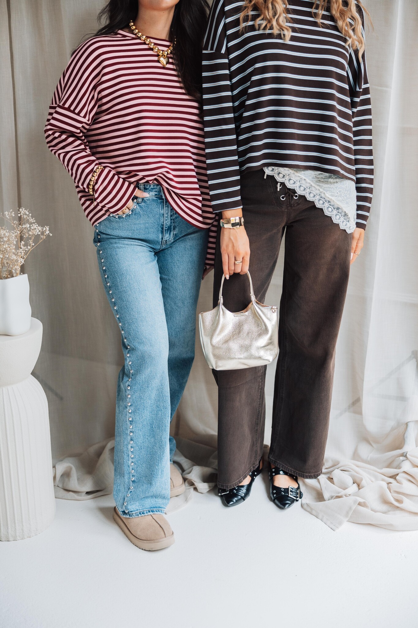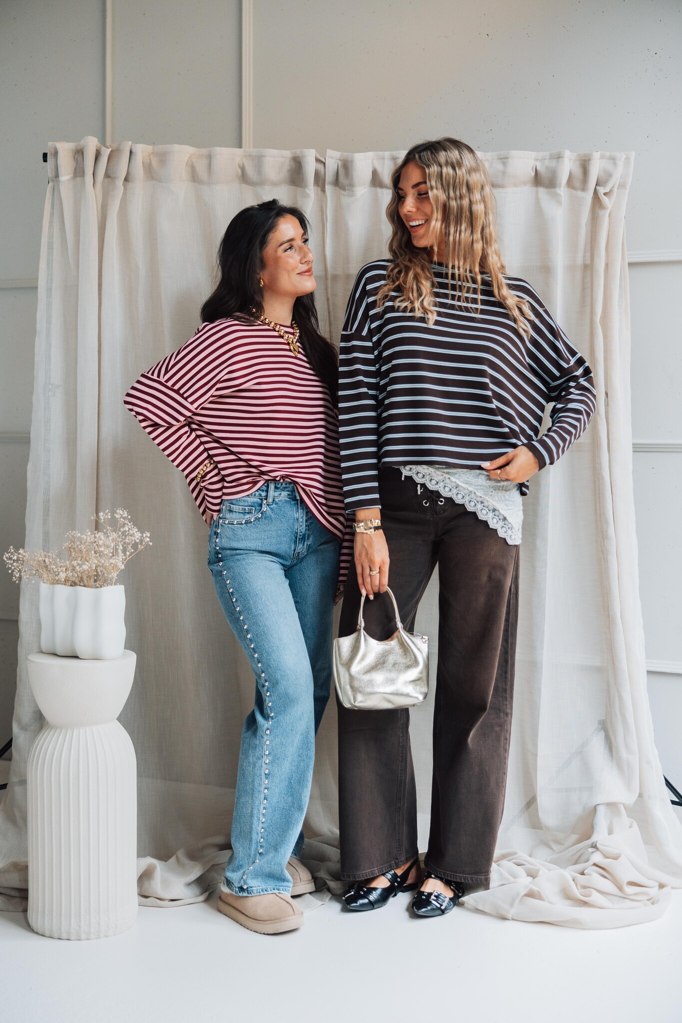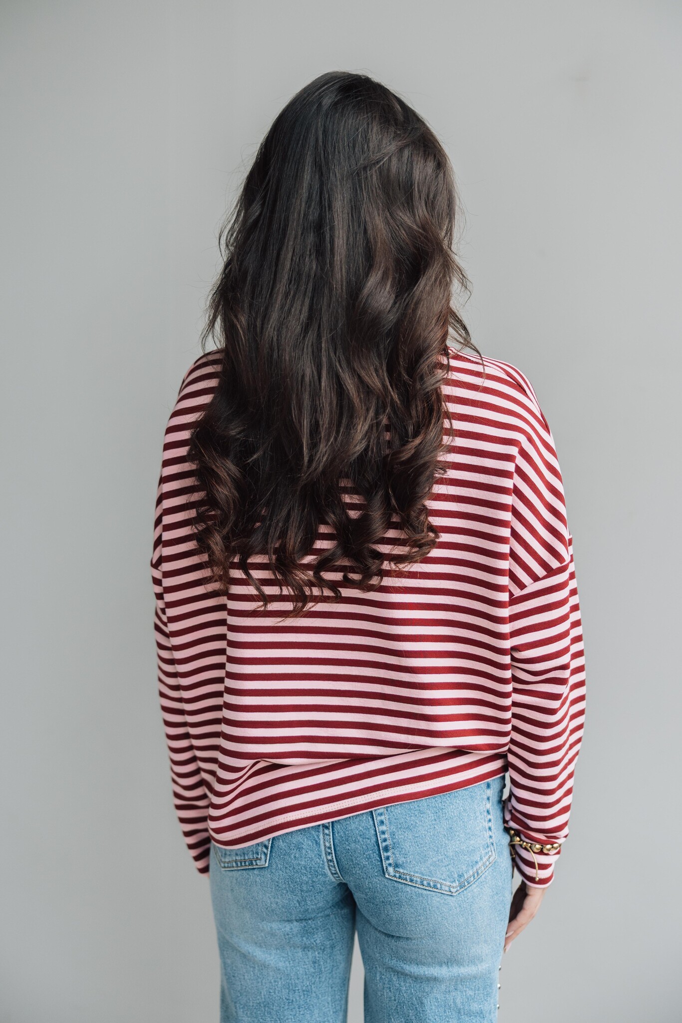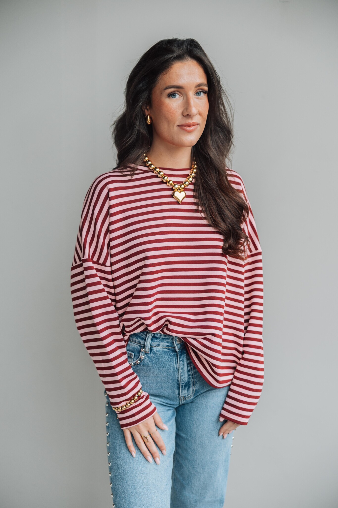 Deze longsleeve heeft een oversized fit en een trendy streeppatroon in lichtroze en bordeaux. De combinatie van deze kleuren is helemaal on trend!