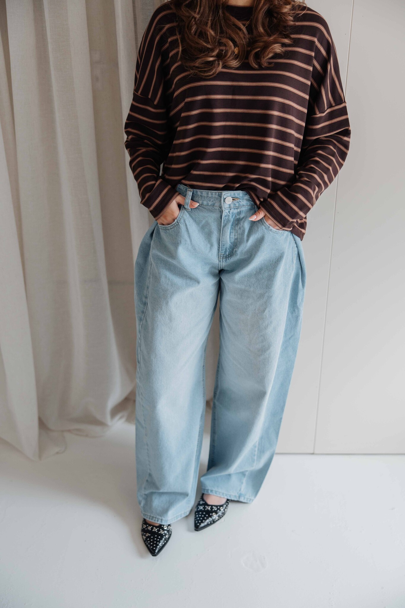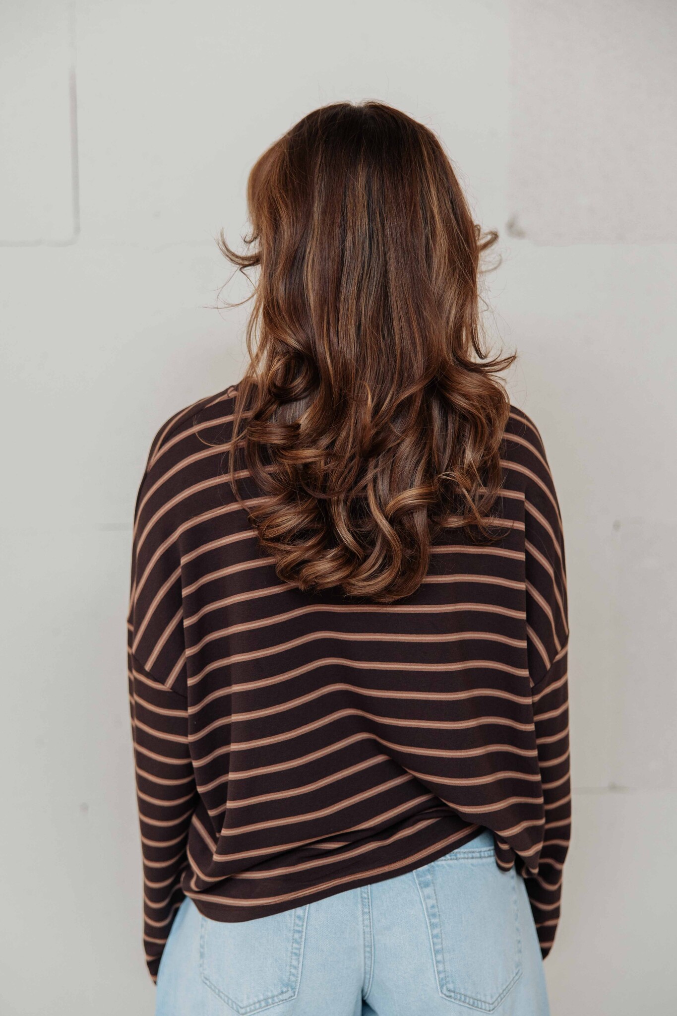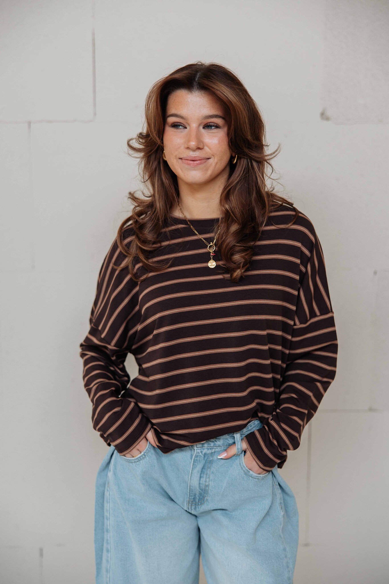 Deze longsleeve heeft een oversized fit en een trendy streeppatroon in bruin en beige. De combinatie van deze kleuren zorgt voor een mooie neutrale look!