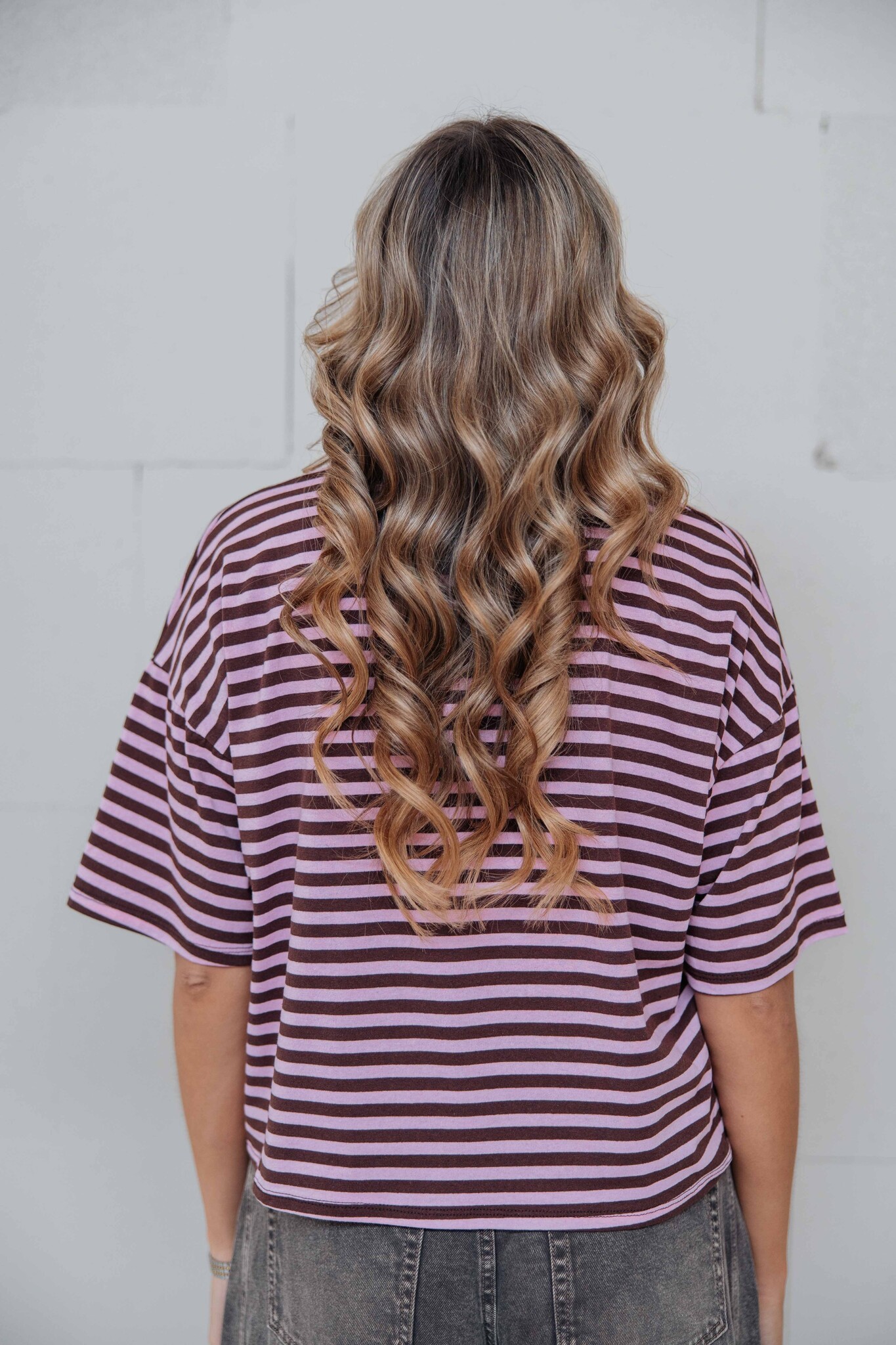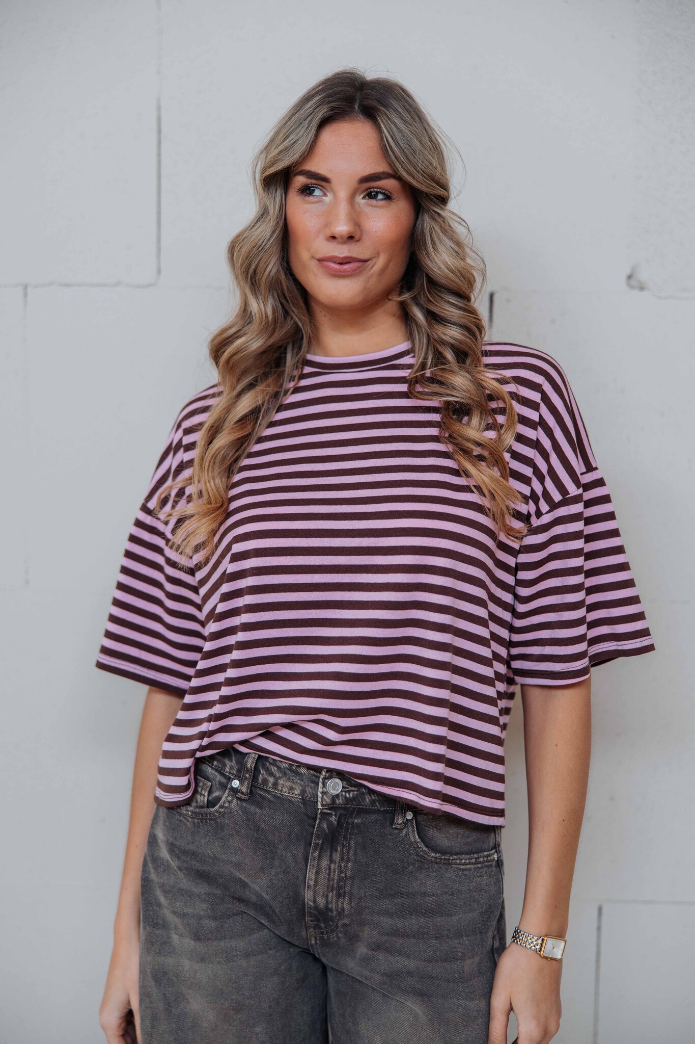 Deze gestreepte top heeft korte mouwen en een trendy kleurencombinatie van roze en bruin. Deze top is een handige basic en perfect om te dragen op een jeans!