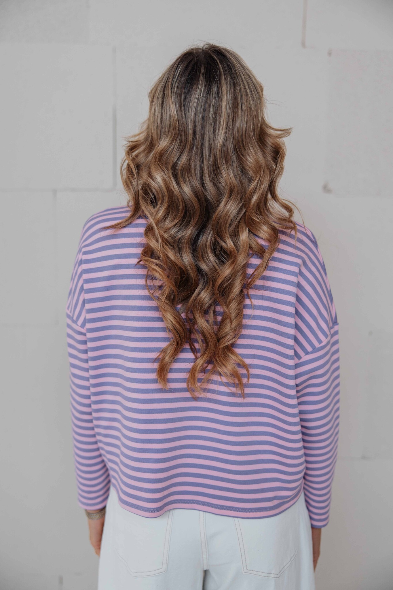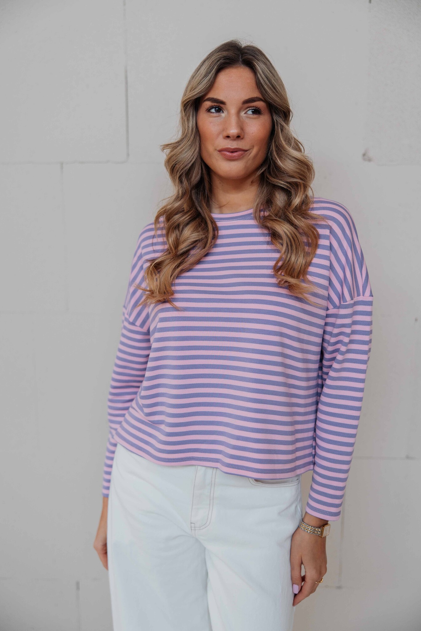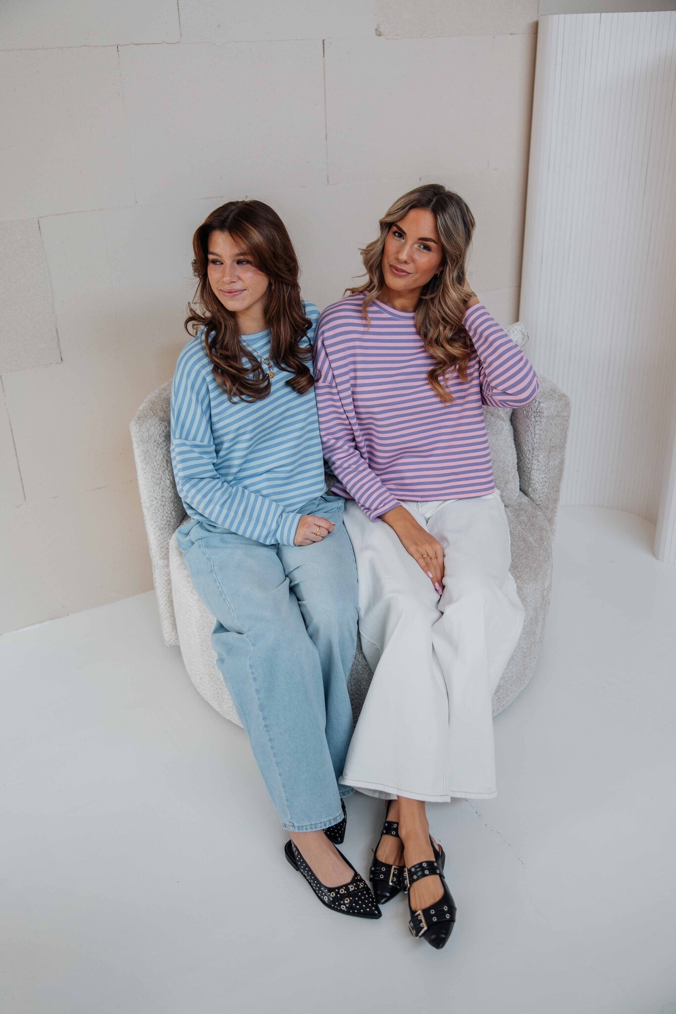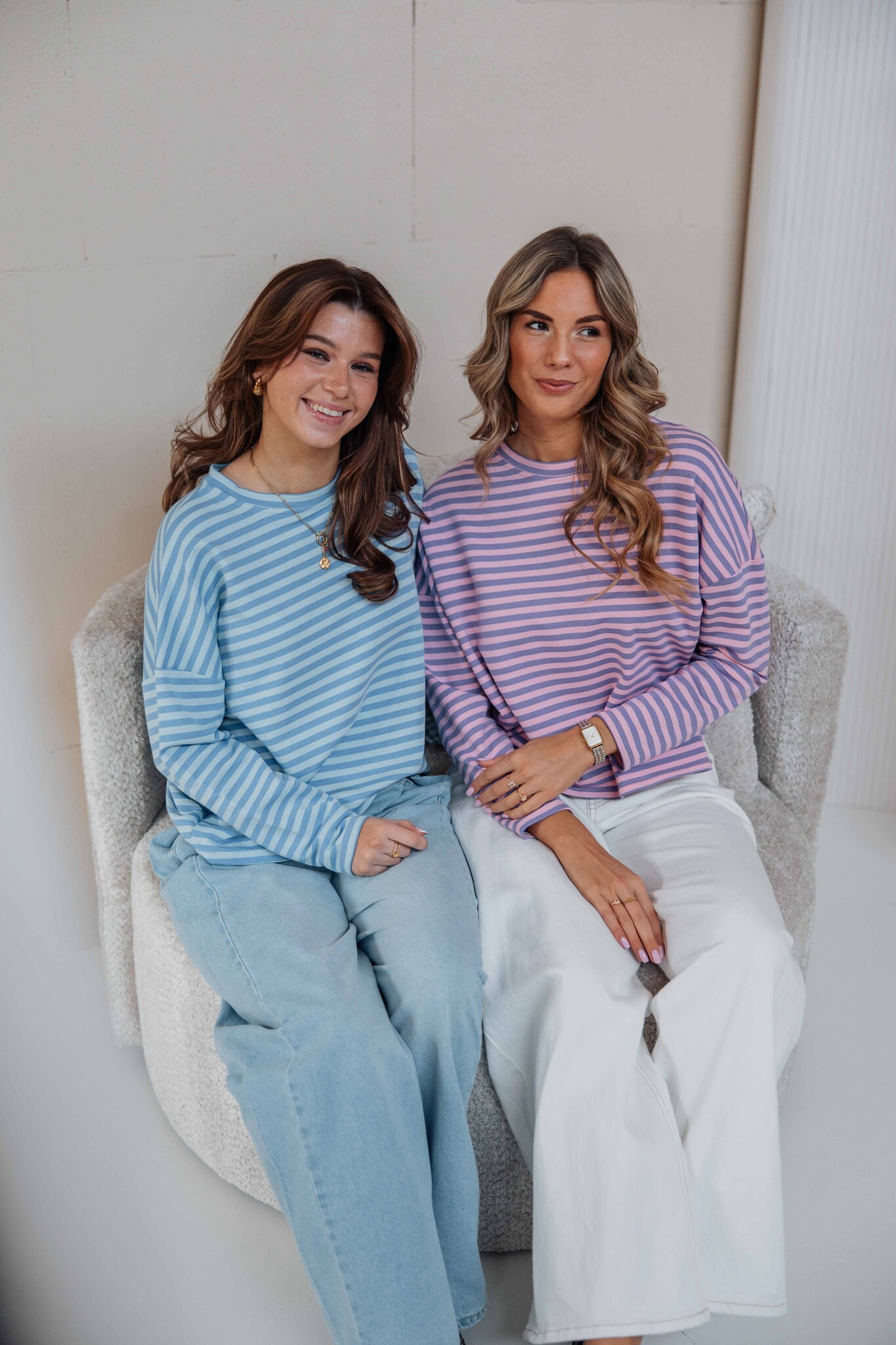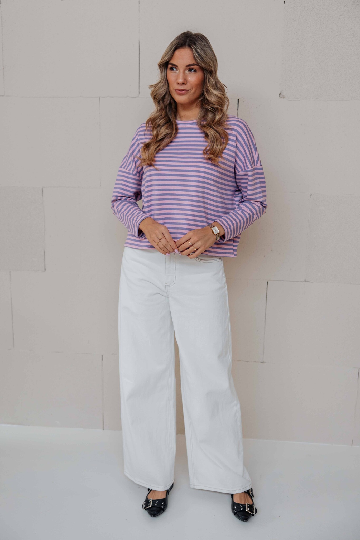 Deze longsleeve heeft een oversized fit en een trendy streeppatroon in lila en roze. De perfecte kleurencombinatie alvast voor het voorjaar. We love it!