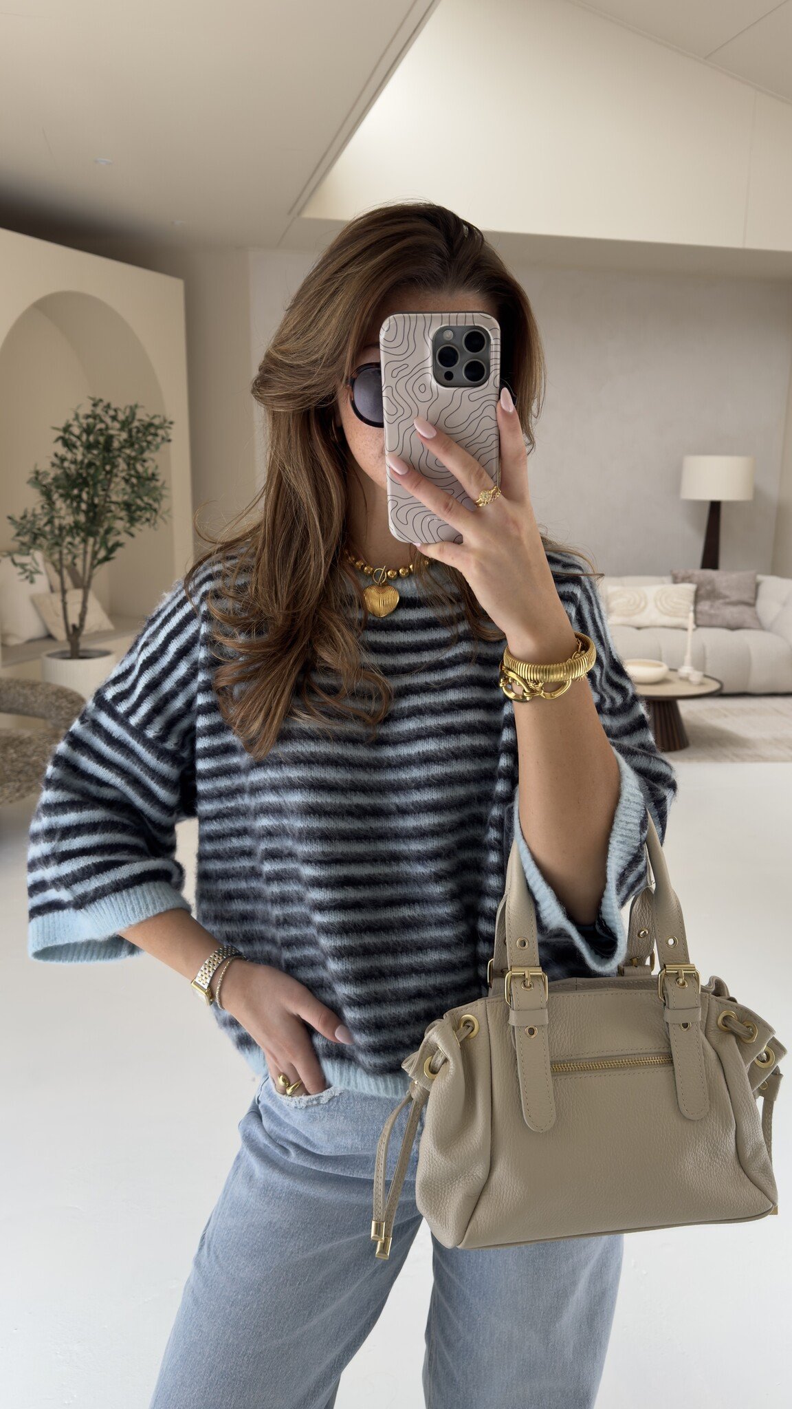 Deze top komt in een gebreide stof, heeft een trendy strepen patroon en kriebelt niet. Perfect voor het tussenweer van nu.