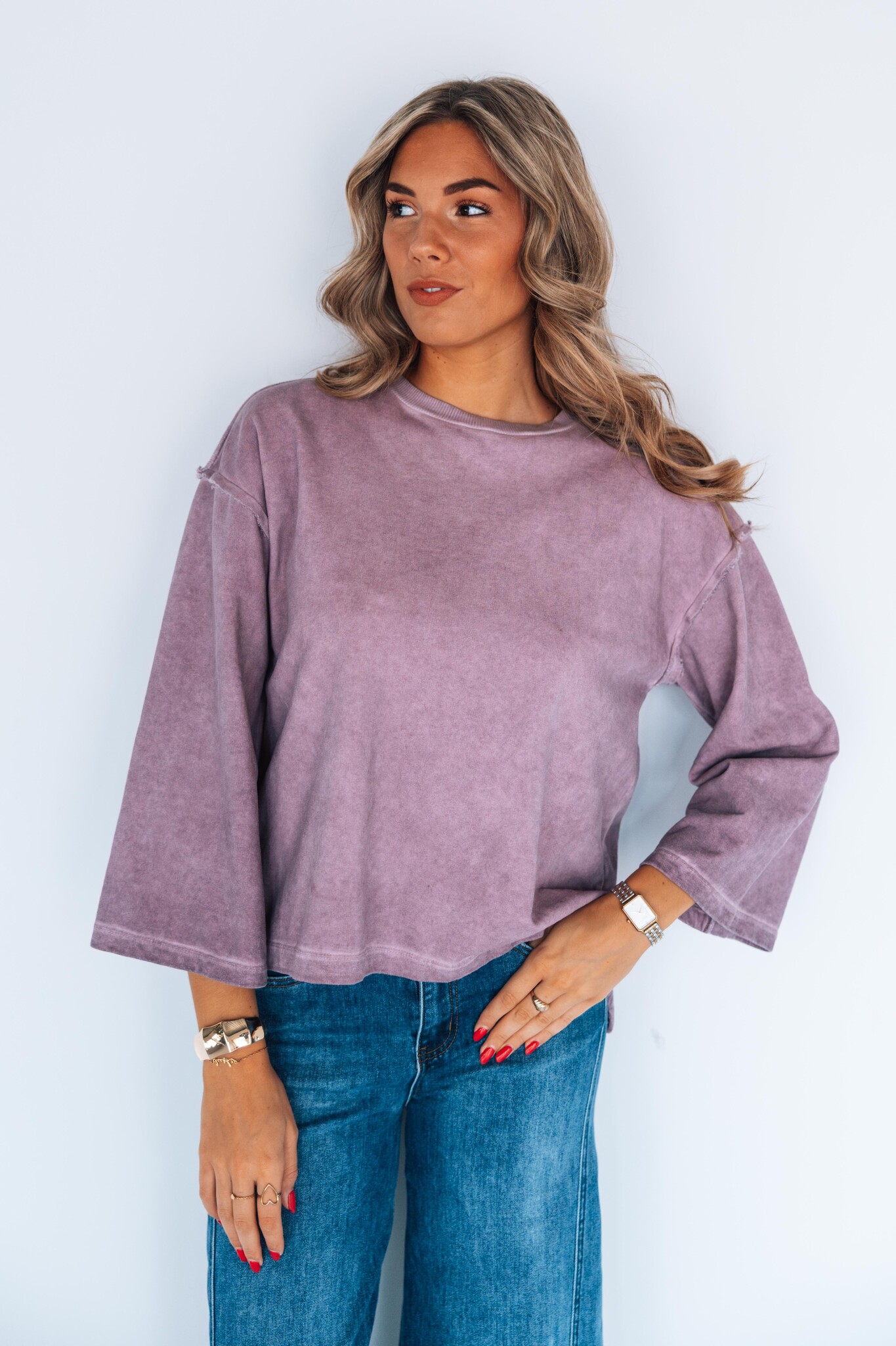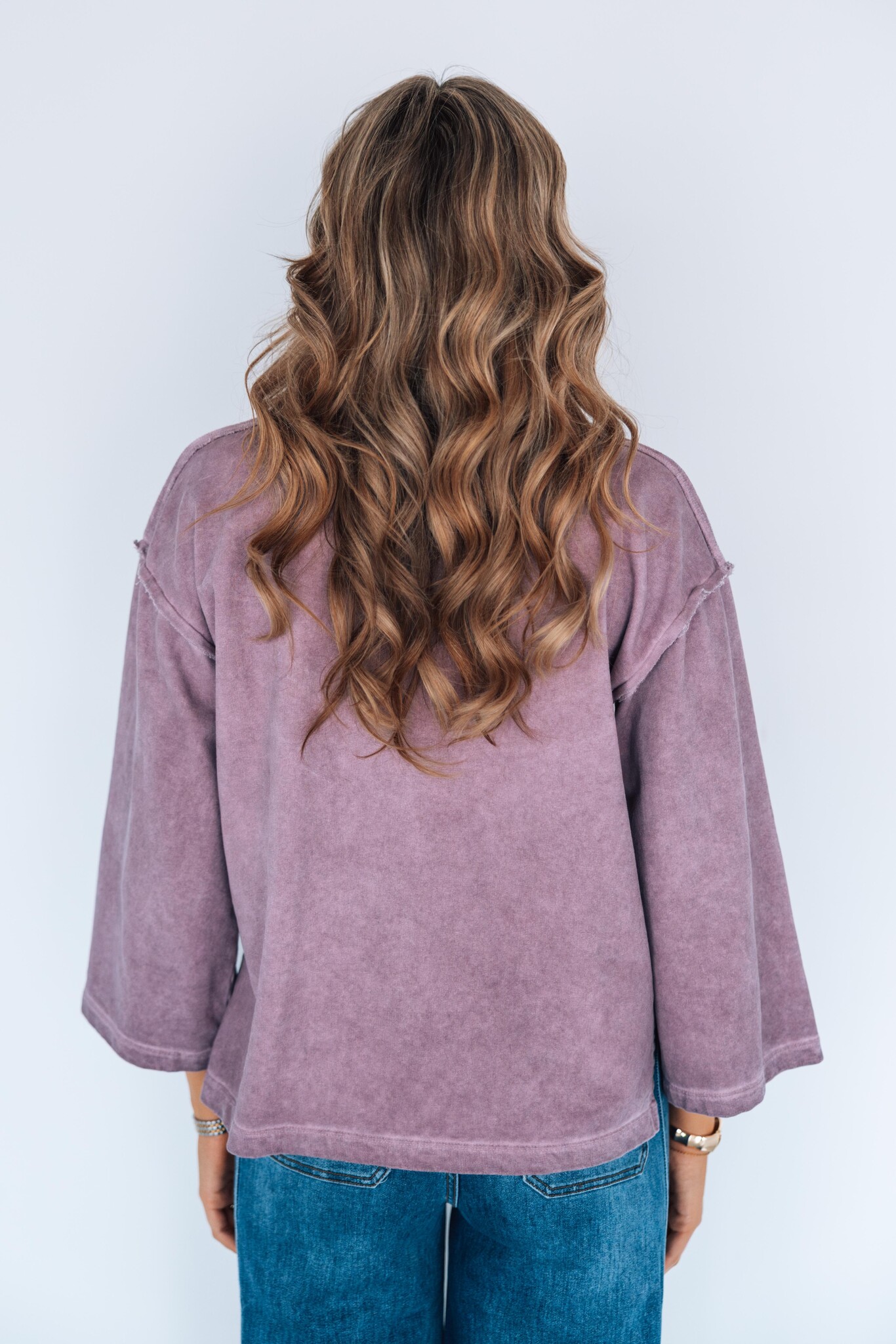 Deze sweater top heeft een leuke vintage wassing en een split detail aan de zijkant. De top komt in één maat en heeft een losse fit.