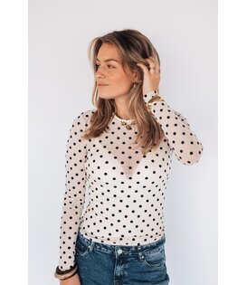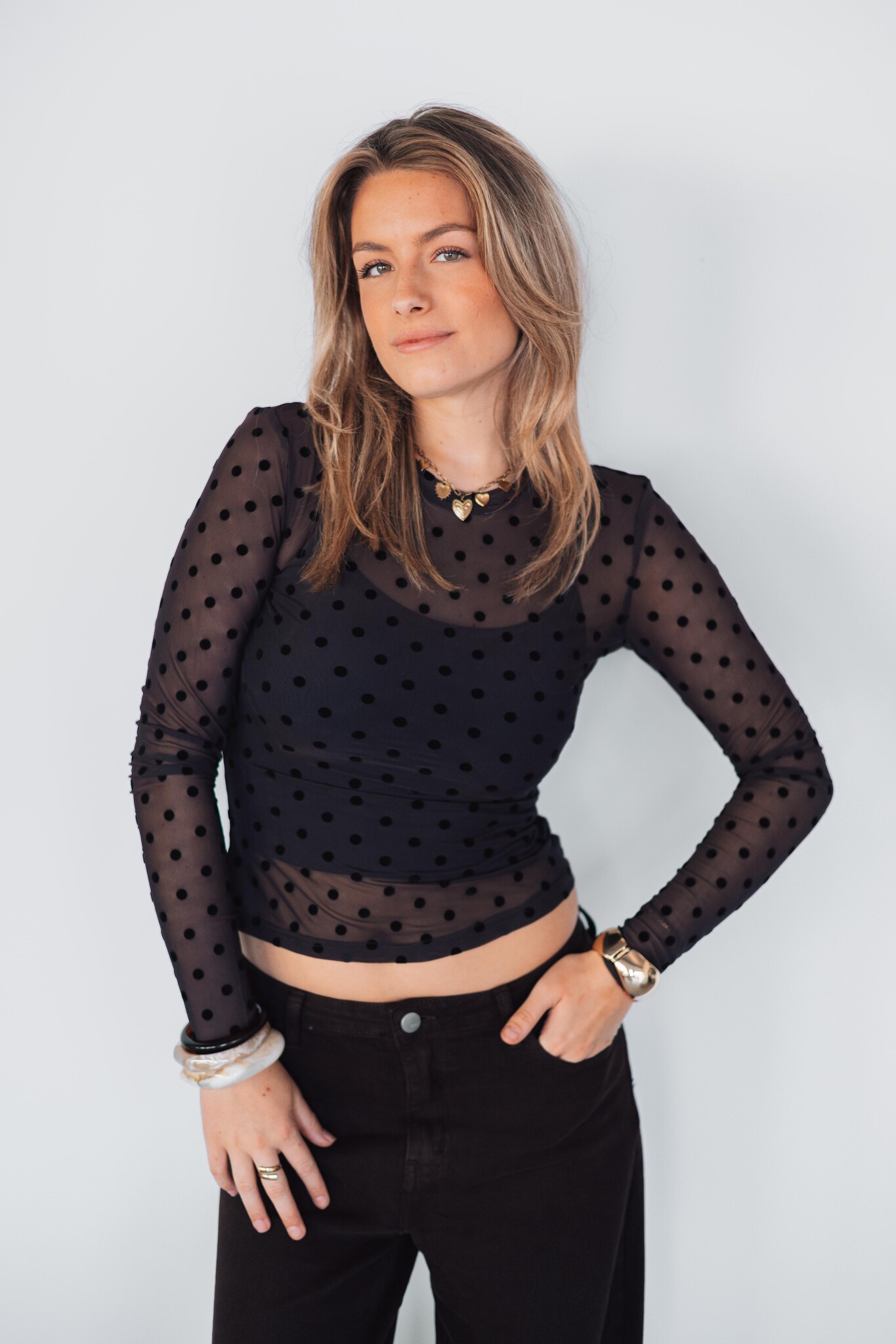 Polkadot is on trend! Deze top is doorschijnend, heeft een ronde hals en een leuke polkadot print.