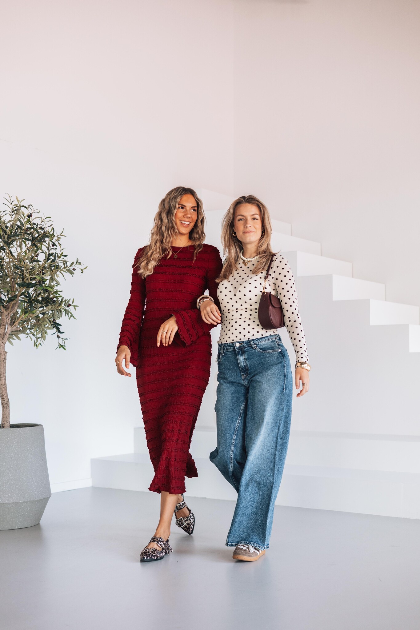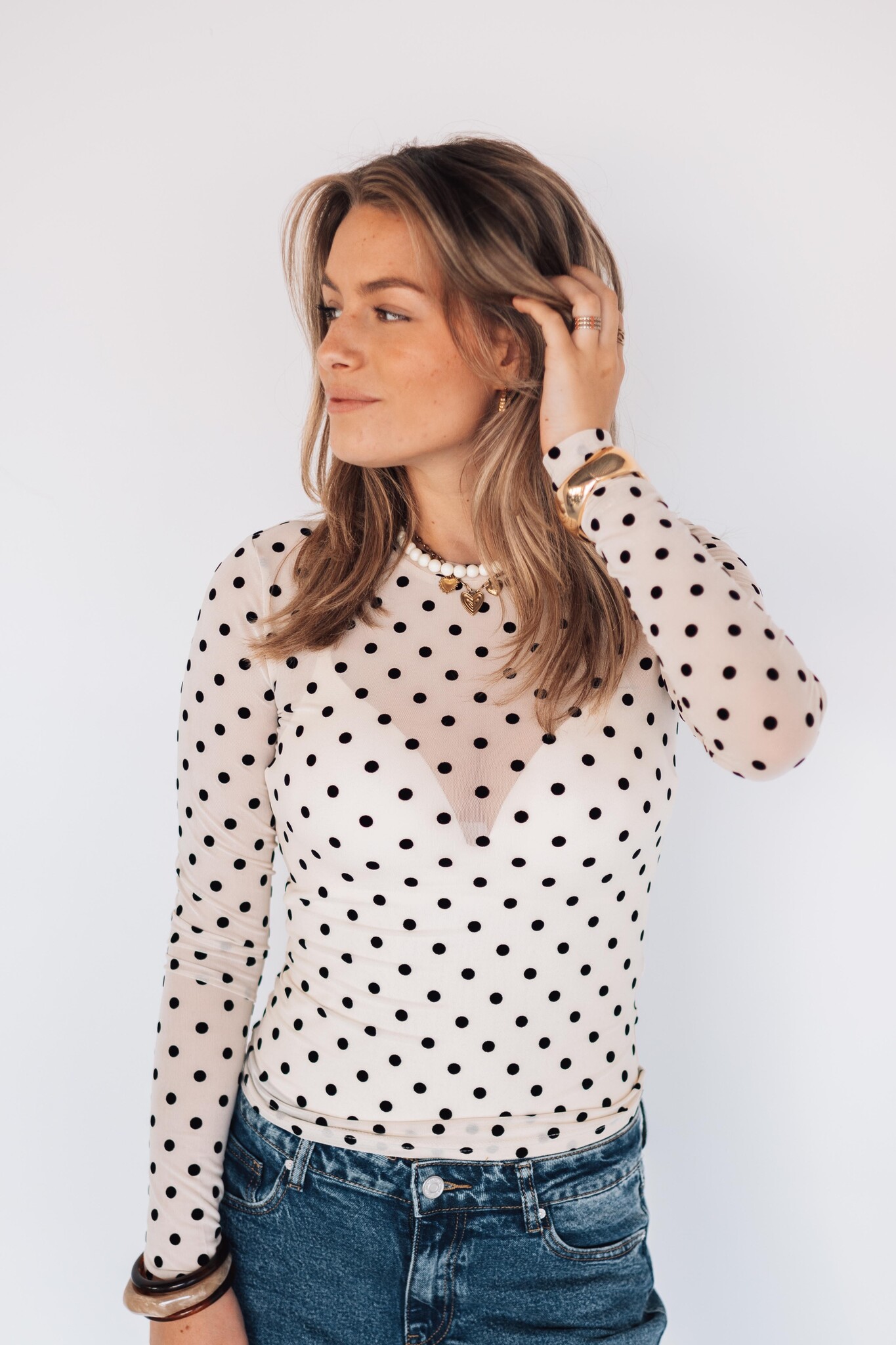 Polkadot is on trend! Deze top is doorschijnend, heeft een ronde hals en een leuke polkadot print.