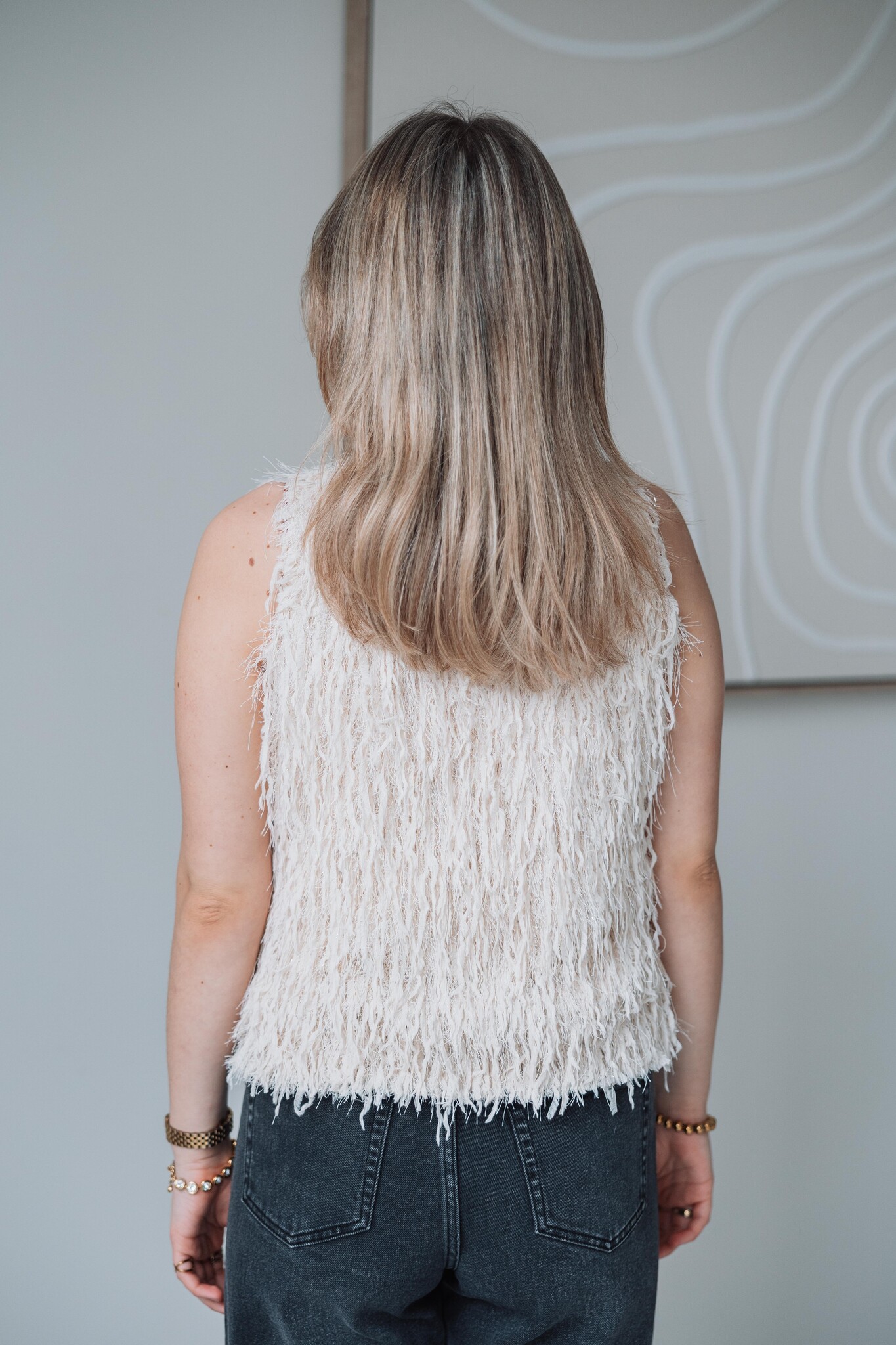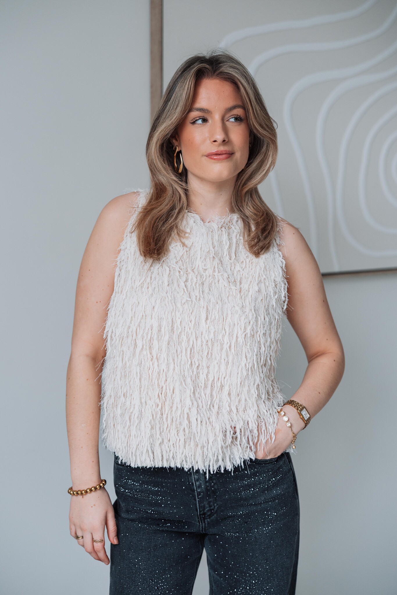 Deze beige, mouwloze veren top heeft een chique uitstraling, ideaal voor een trendy party look. Perfect om je outfit extra glamour te geven!
