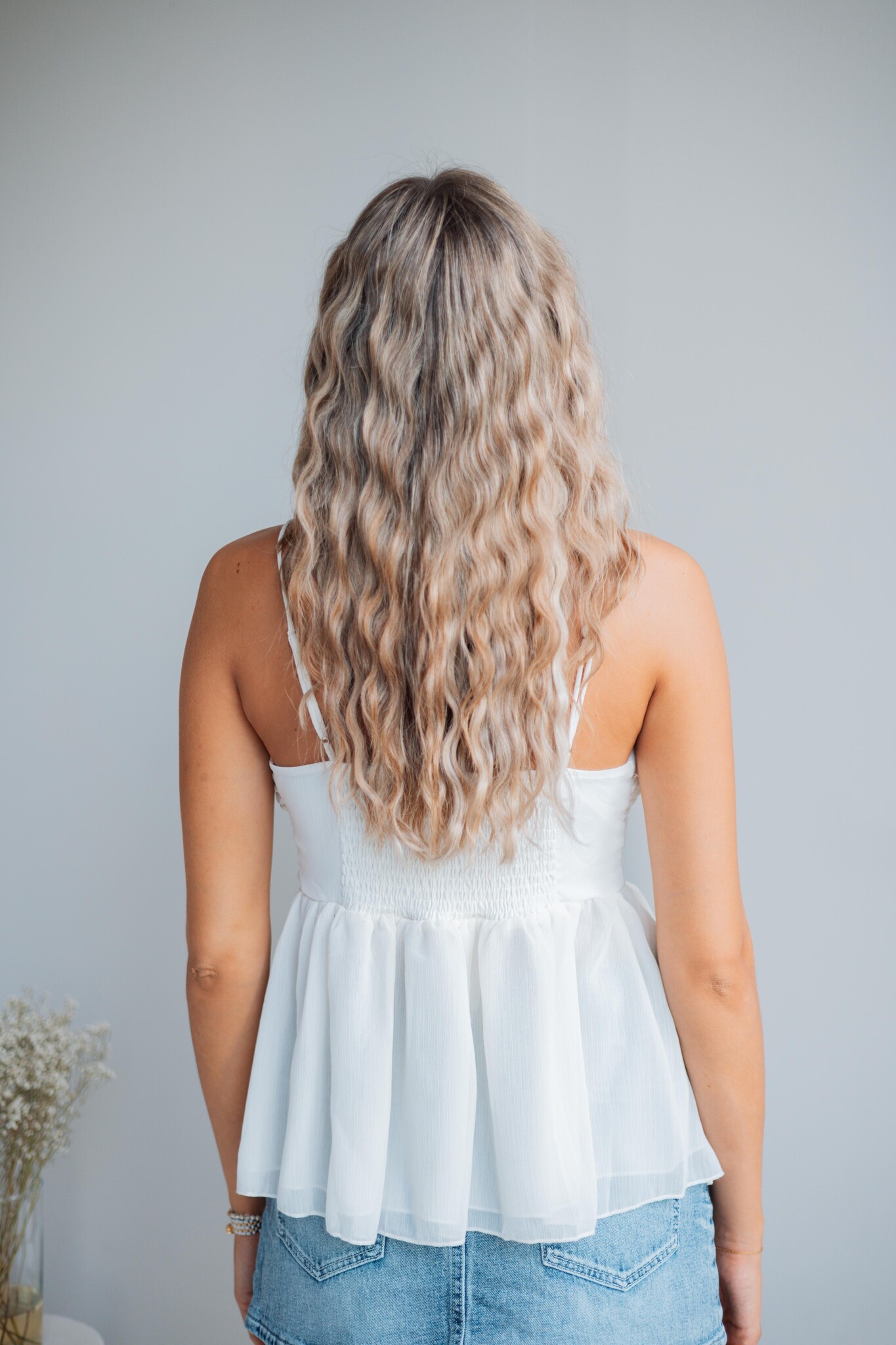 Deze flowy top is lekker luchtig, heeft verstelbare spaghetti bandjes, is gevoerd en heeft een diepe v-hals.