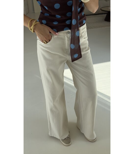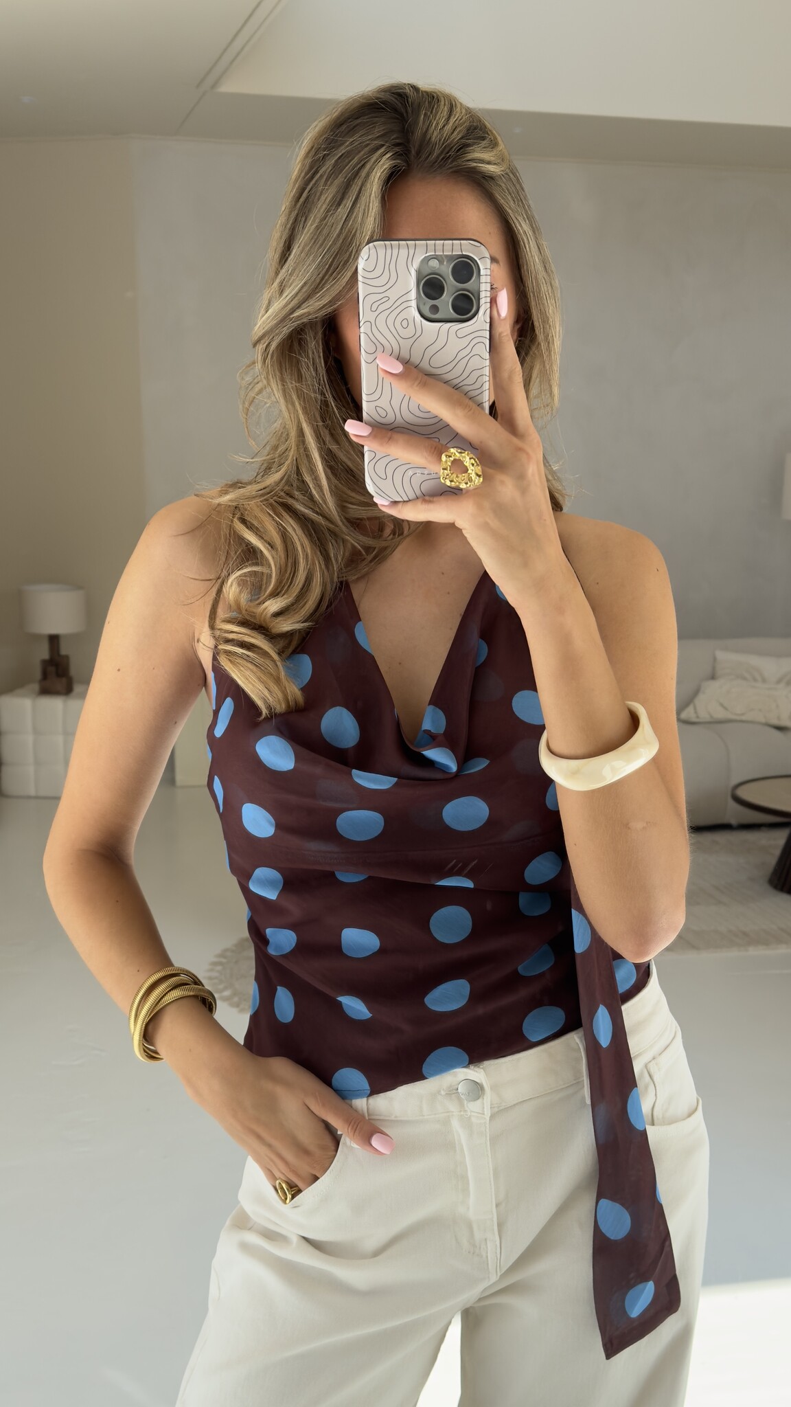 Deze top heeft een polkadot patroon, een waterval hals en een trendy scarf detail. De perfecte top voor op vakantie!