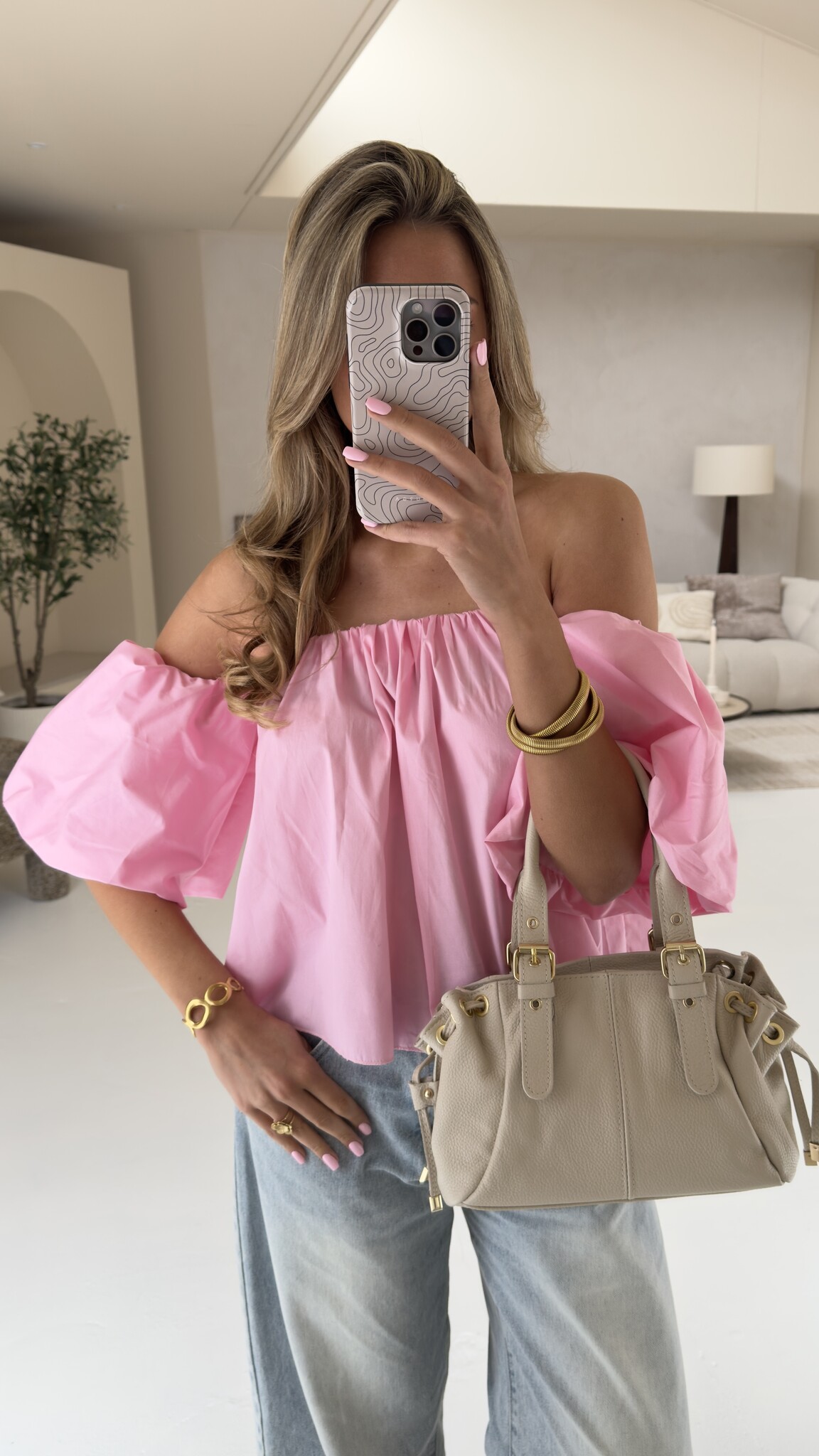 Deze off-shoulder top in een roze kleur heeft een speels pofmodel en een luchtige pasvorm voor een zomerse uitstraling. Perfect te combineren met je favoriete jeans!