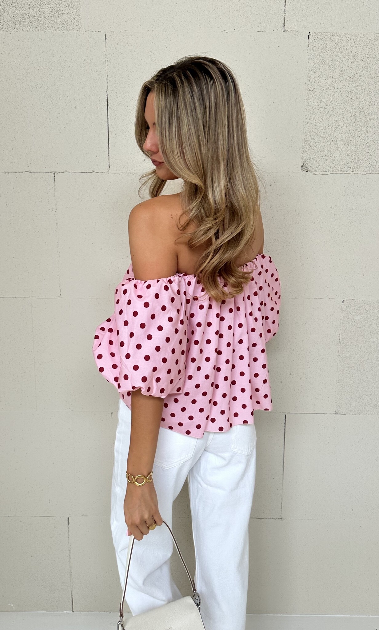 Deze off-shoulder top in een roze kleur heeft een speels pofmodel en is uitgevoerd in een trendy polkadot print. De luchtige pasvorm zorgt voor een zomerse uitstraling. Perfect te combineren met je favoriete jeans!