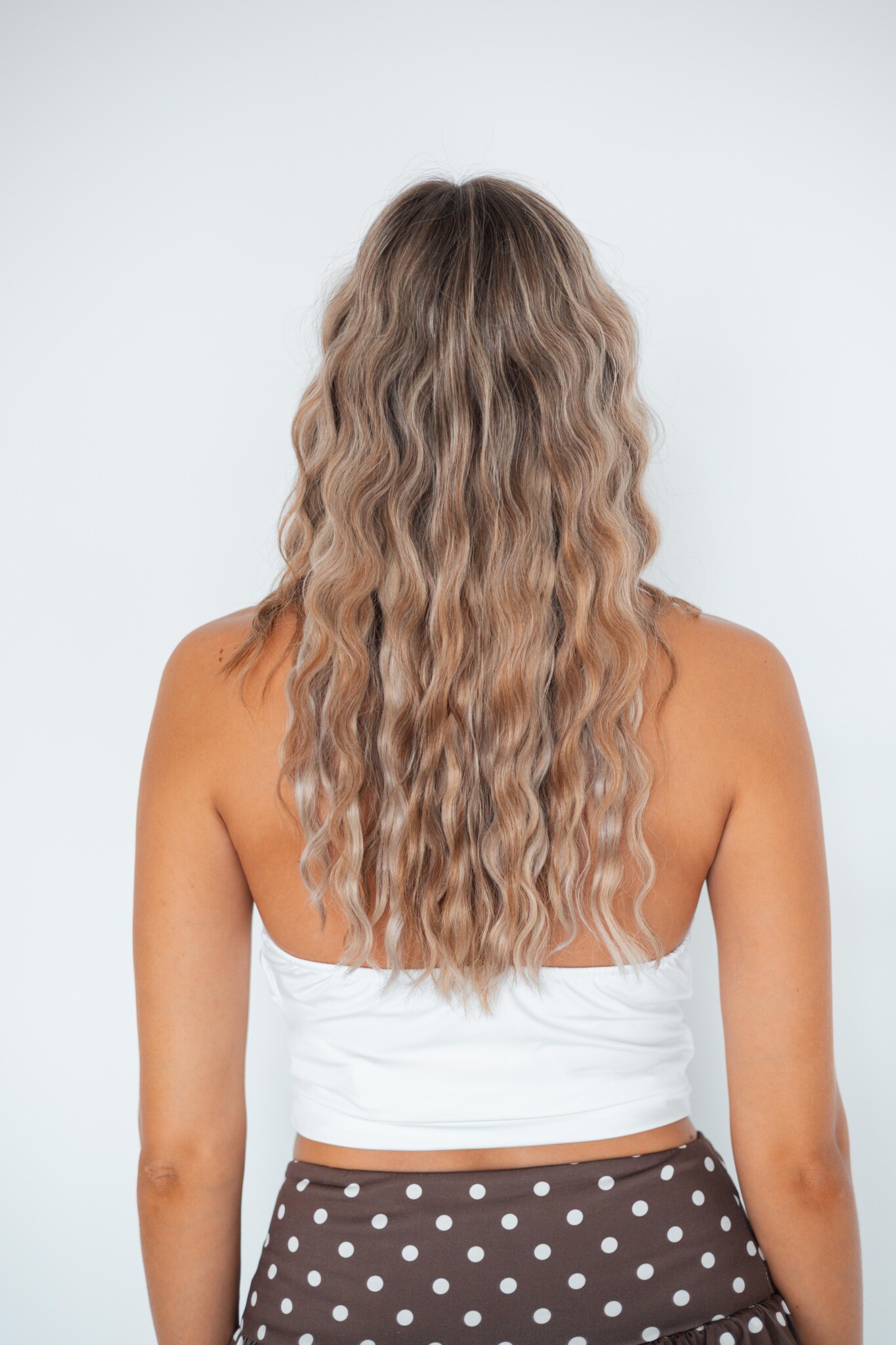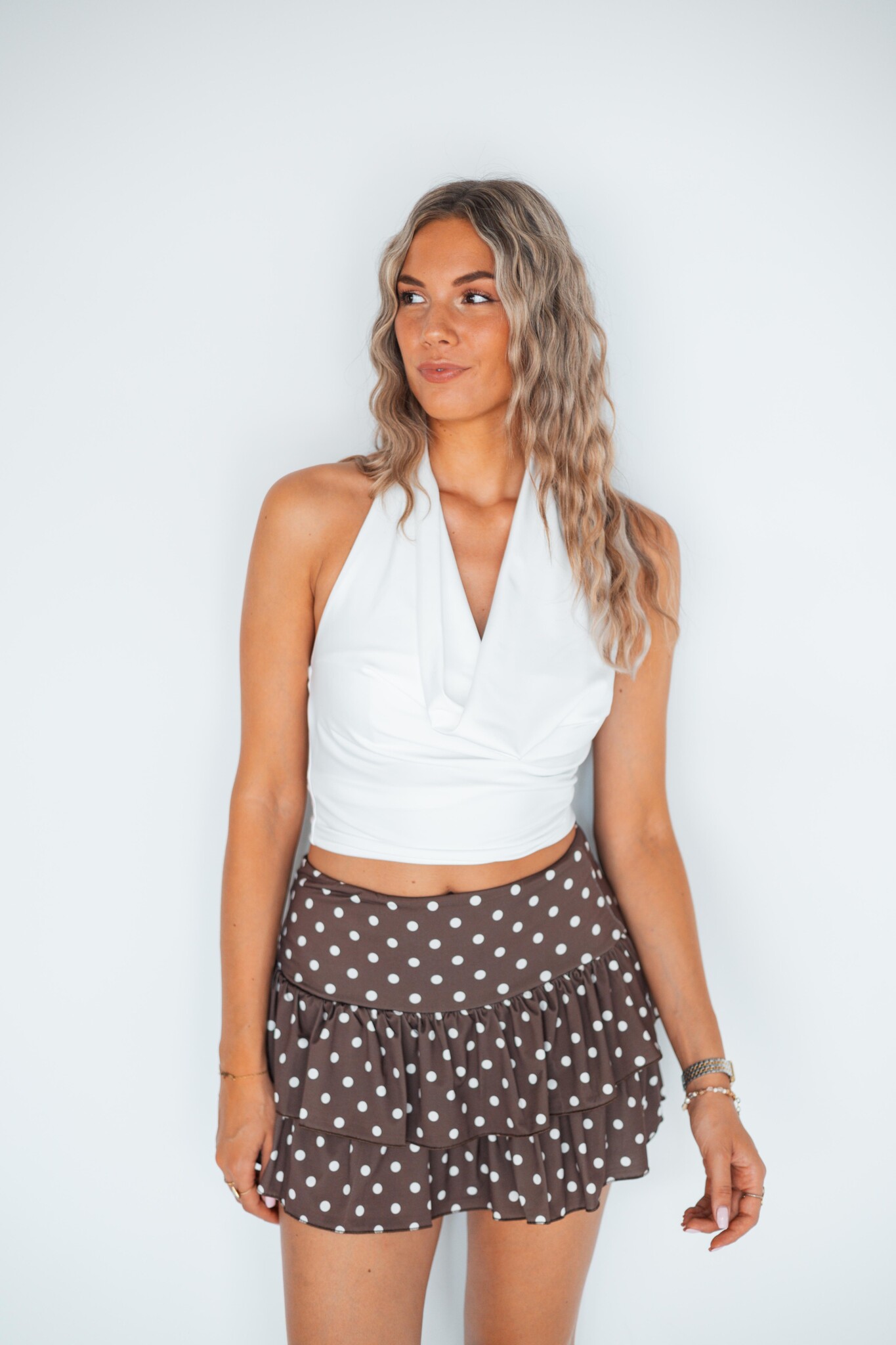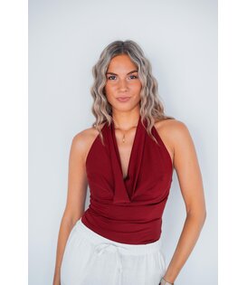 Deze top heeft een leuke waterval-hals en valt aangesloten.