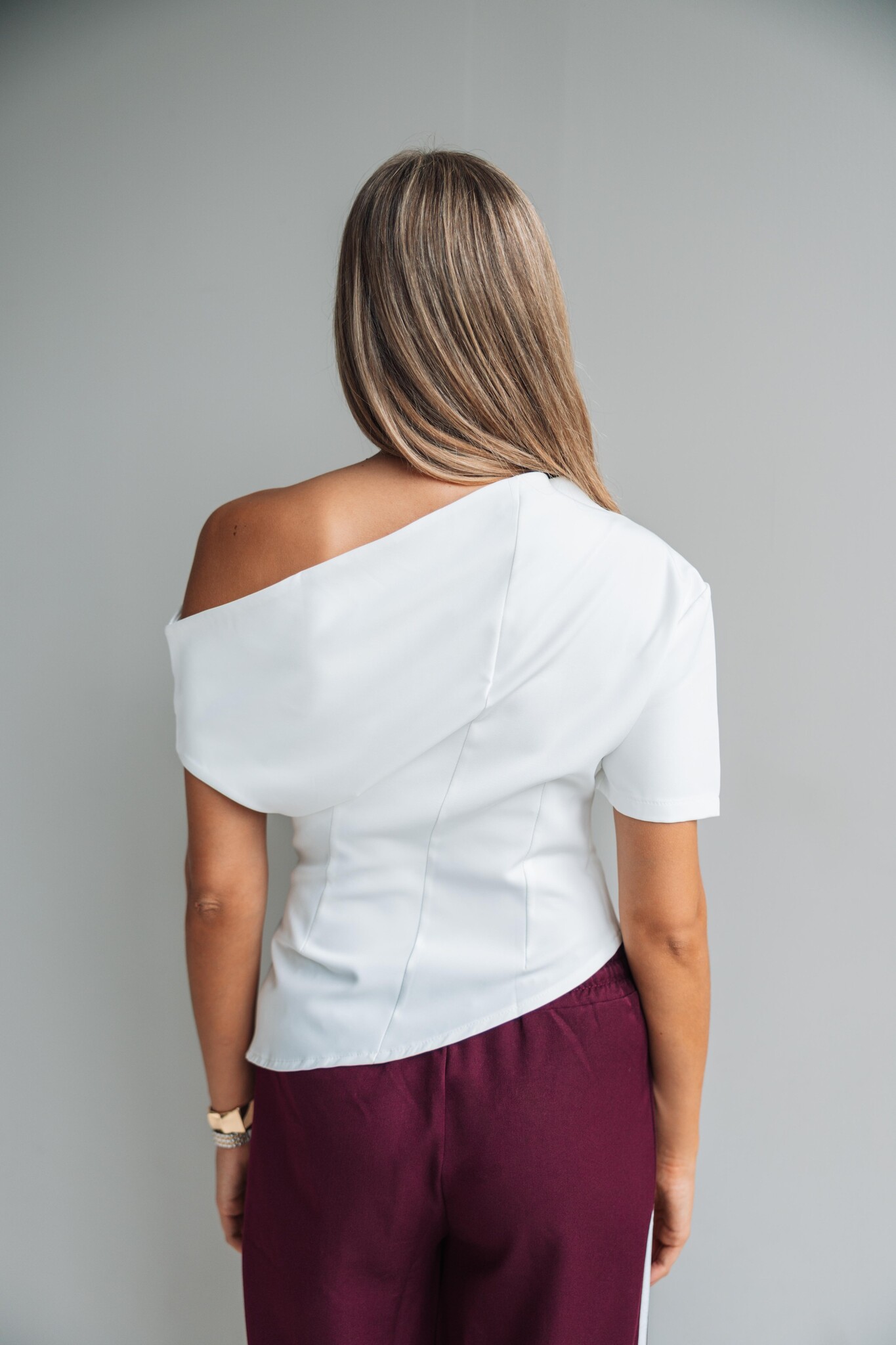 Deze top heeft een chique uitstraling en een off-shoulder pasvorm. Perfect om te combineren met een pantalon of casual met een jeans!