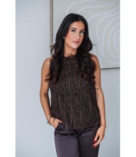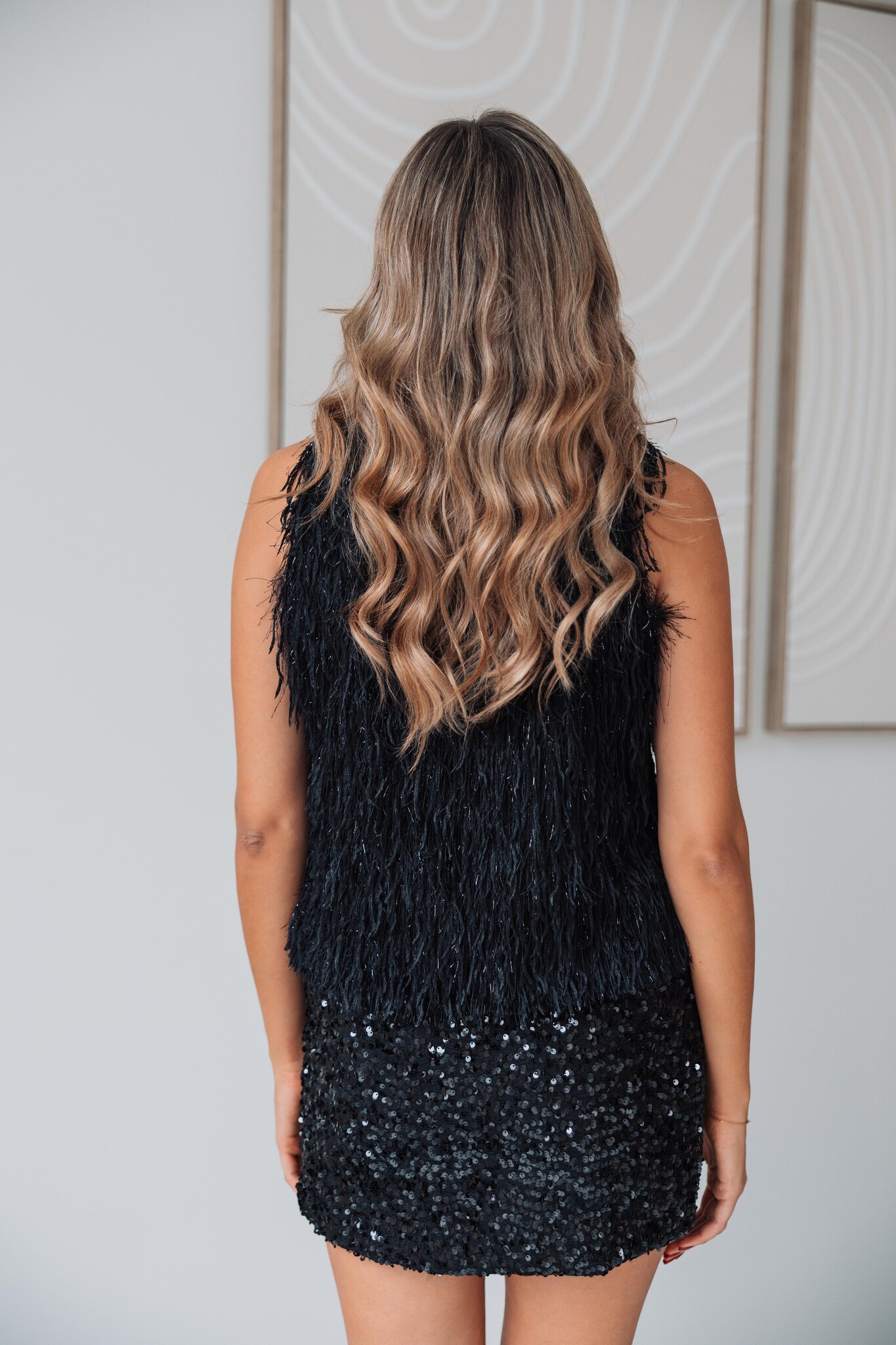 Deze zwarte, mouwloze veren top heeft een chique uitstraling, ideaal voor een trendy party look. Perfect om je outfit extra glamour te geven!