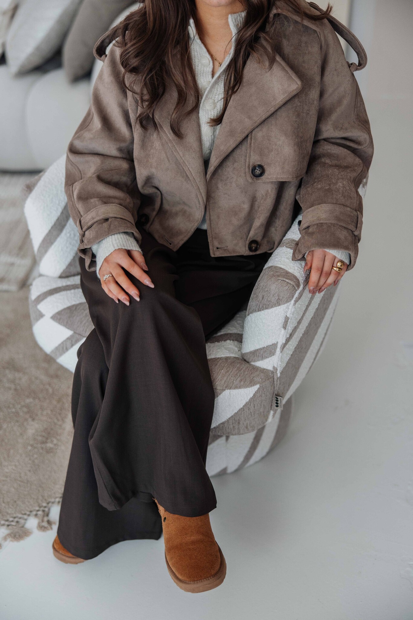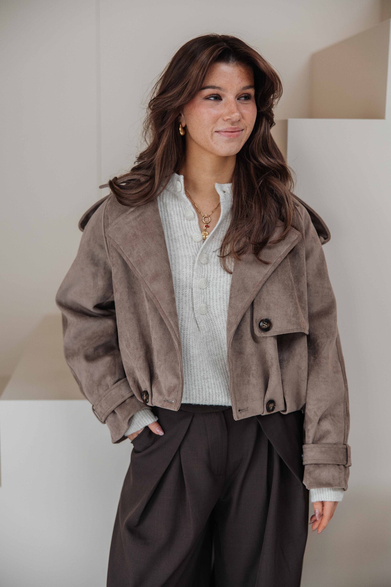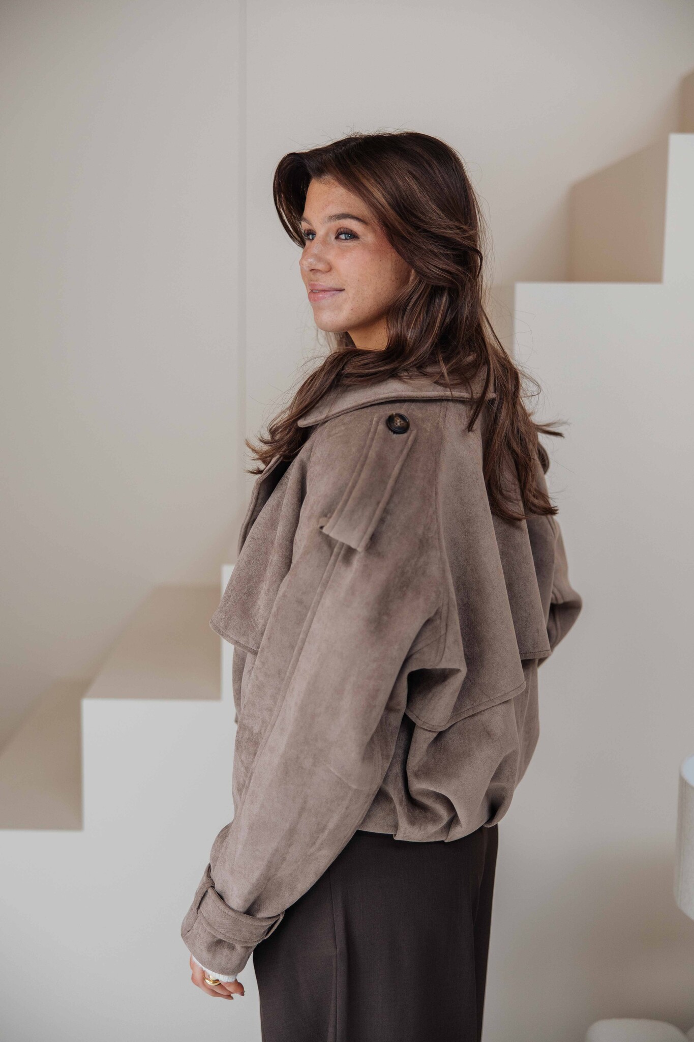 Deze korte trenchcoat heeft een mooie taupe kleur en een zachte suède look. De knoopdetails aan de voorkant geven ’m een extra stijlvolle touch. Makkelijk te combineren voor elke gelegenheid.