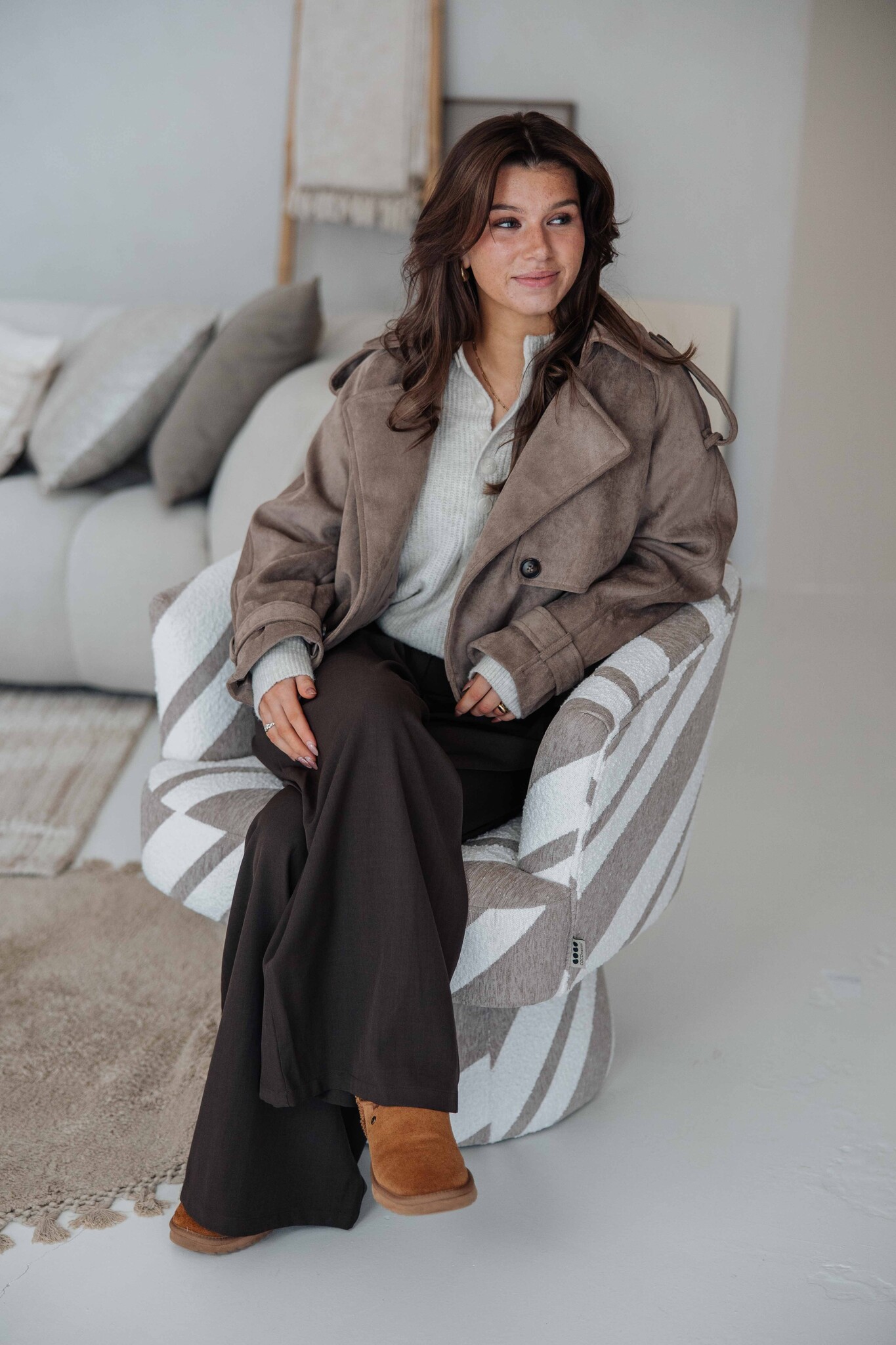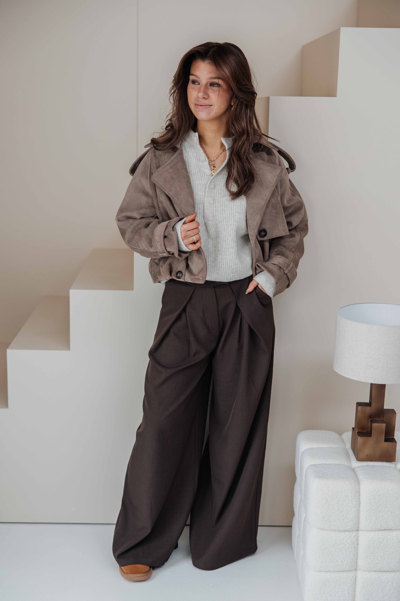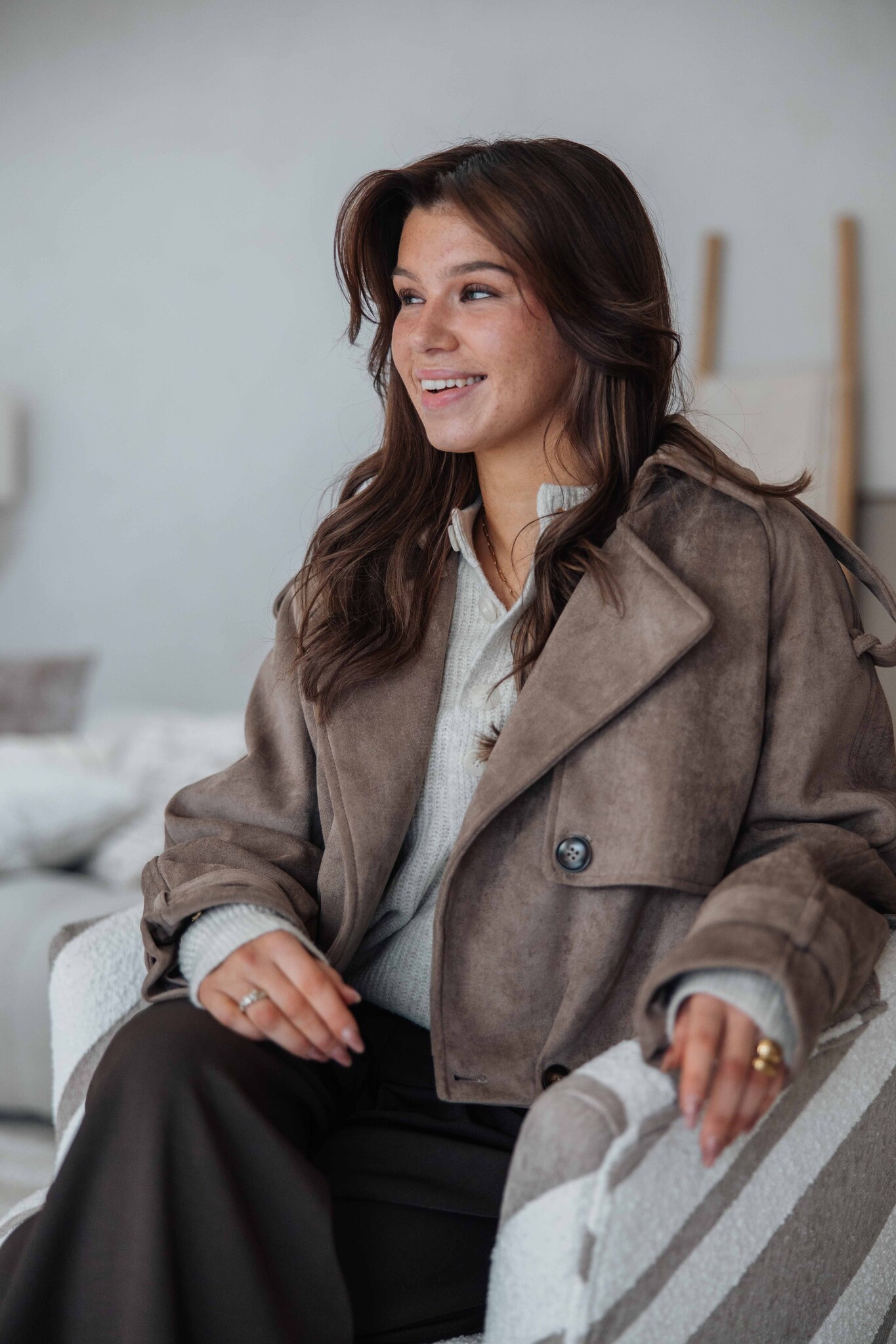 Deze korte trenchcoat heeft een mooie taupe kleur en een zachte suède look. De knoopdetails aan de voorkant geven ’m een extra stijlvolle touch. Makkelijk te combineren voor elke gelegenheid.
