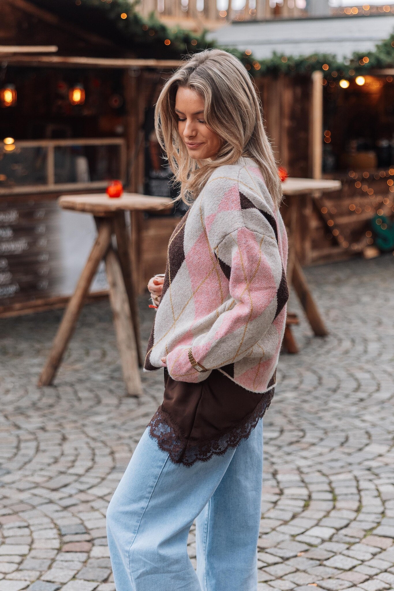 Deze geruite trui in bruin, beige en roze geeft je look direct een warme touch. Combineer ’m met een satin lace top voor een extra detail , het kanten randje staat superleuk onder de trui!