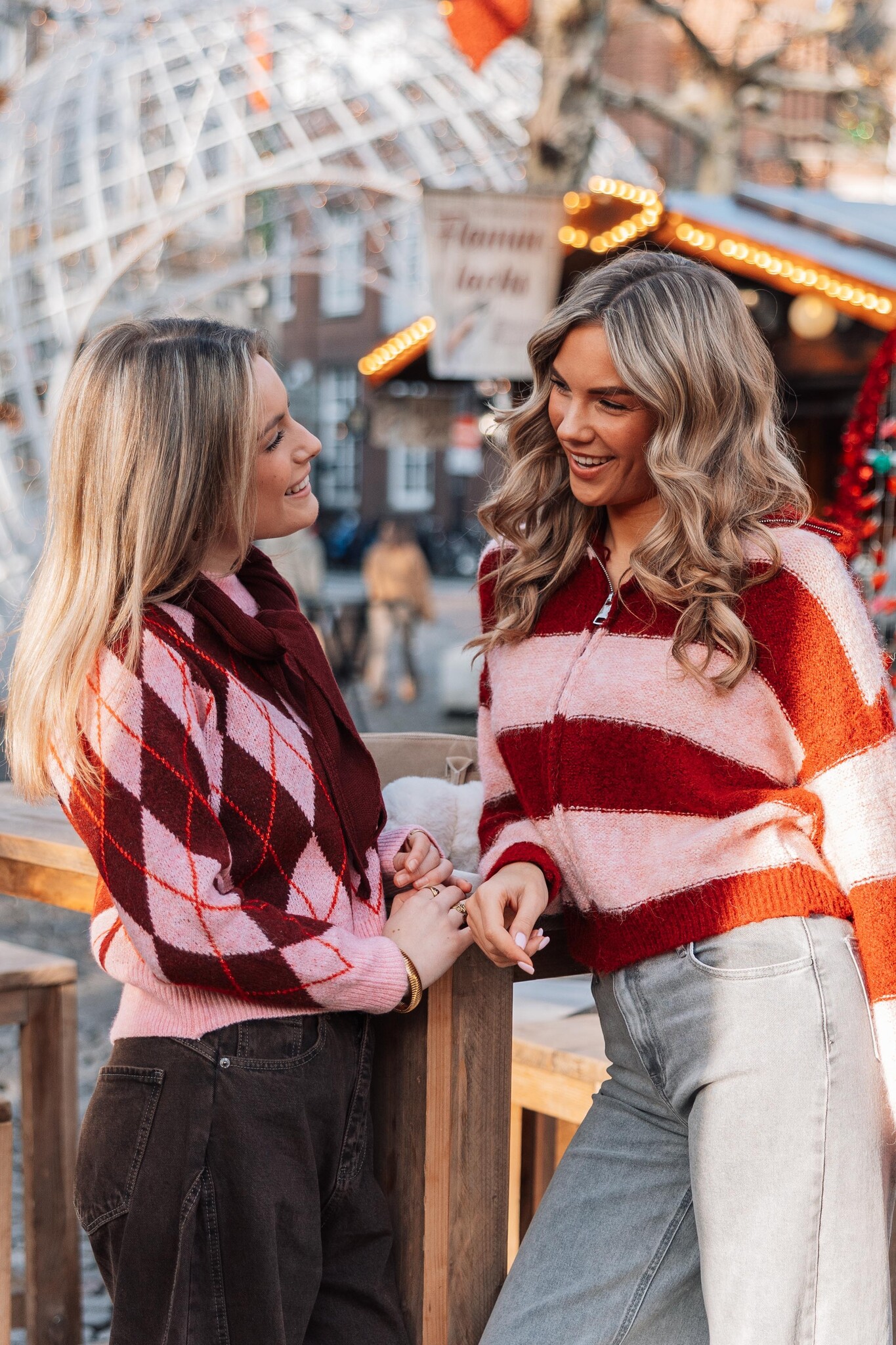Deze geruite trui in roze en bordeaux is stijlvol en cozy! Leuk om te combineren met een bruine jeans en een sjaaltje voor een must-have look.