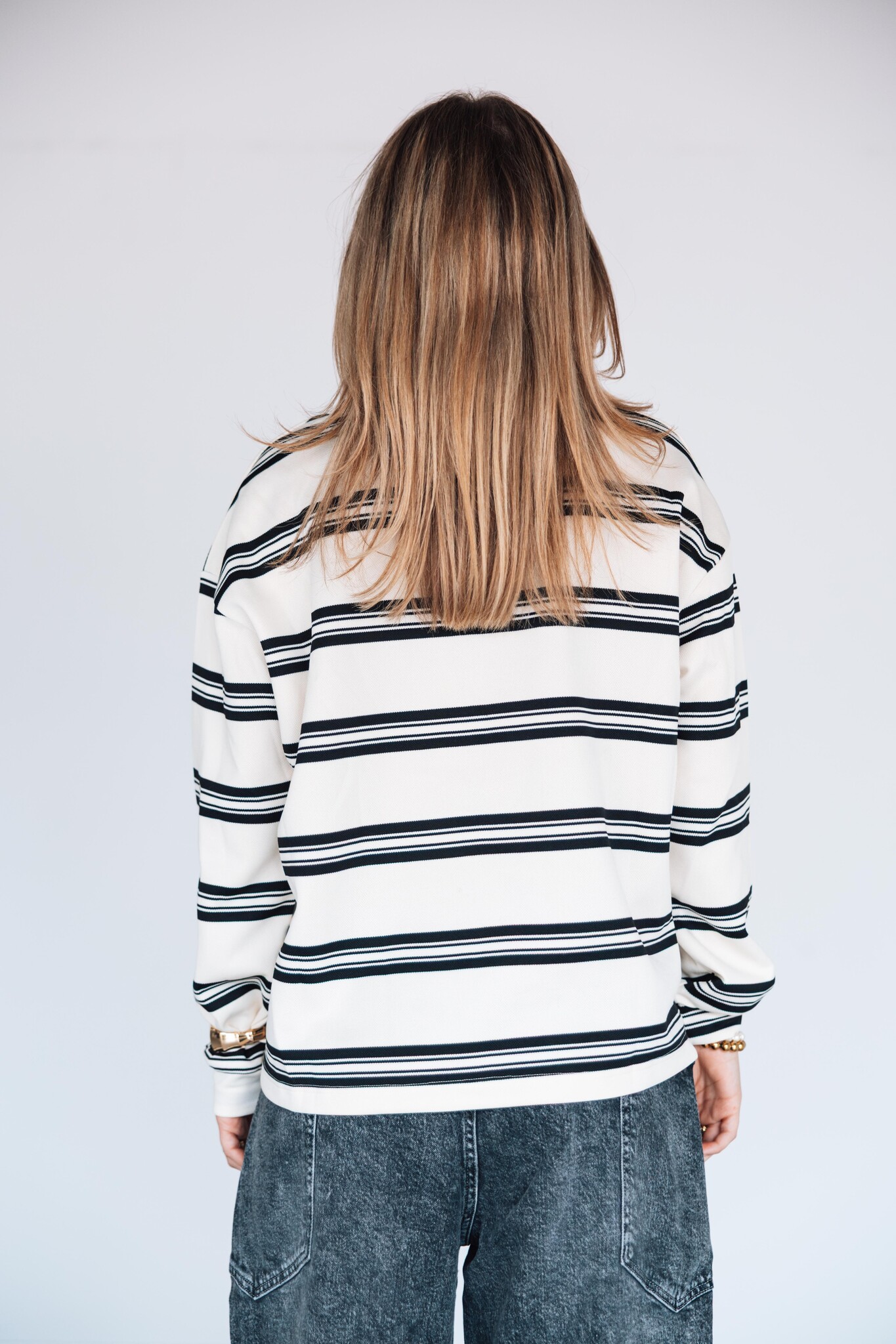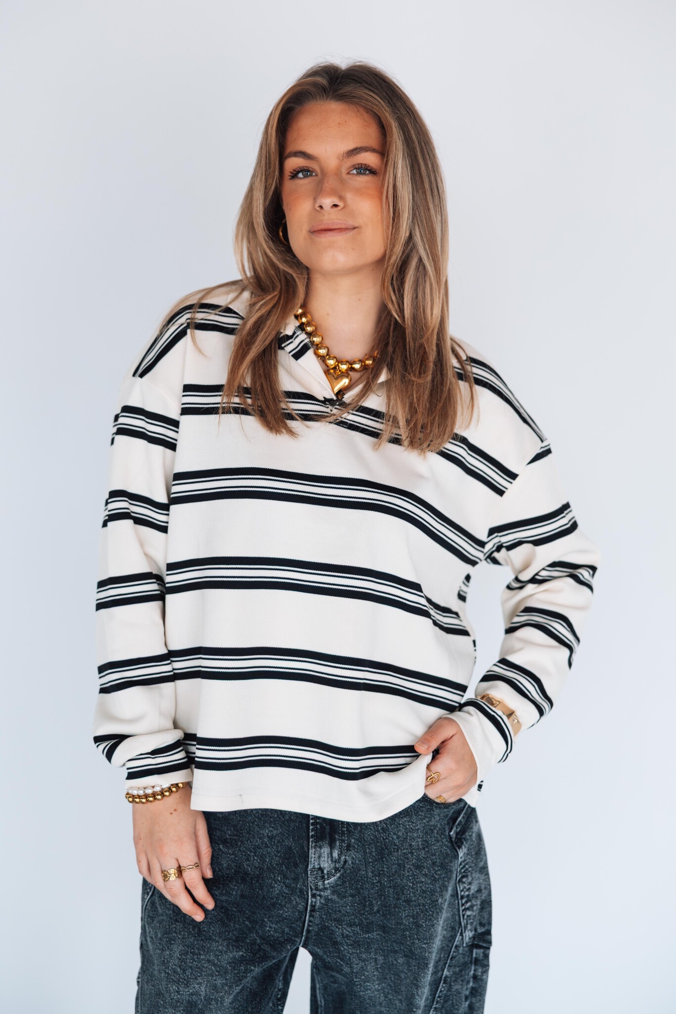 Deze top heeft een polomodel met een klassiek kraagje, twee knoopjes en een oversized pasvorm voor een moderne, relaxte look.