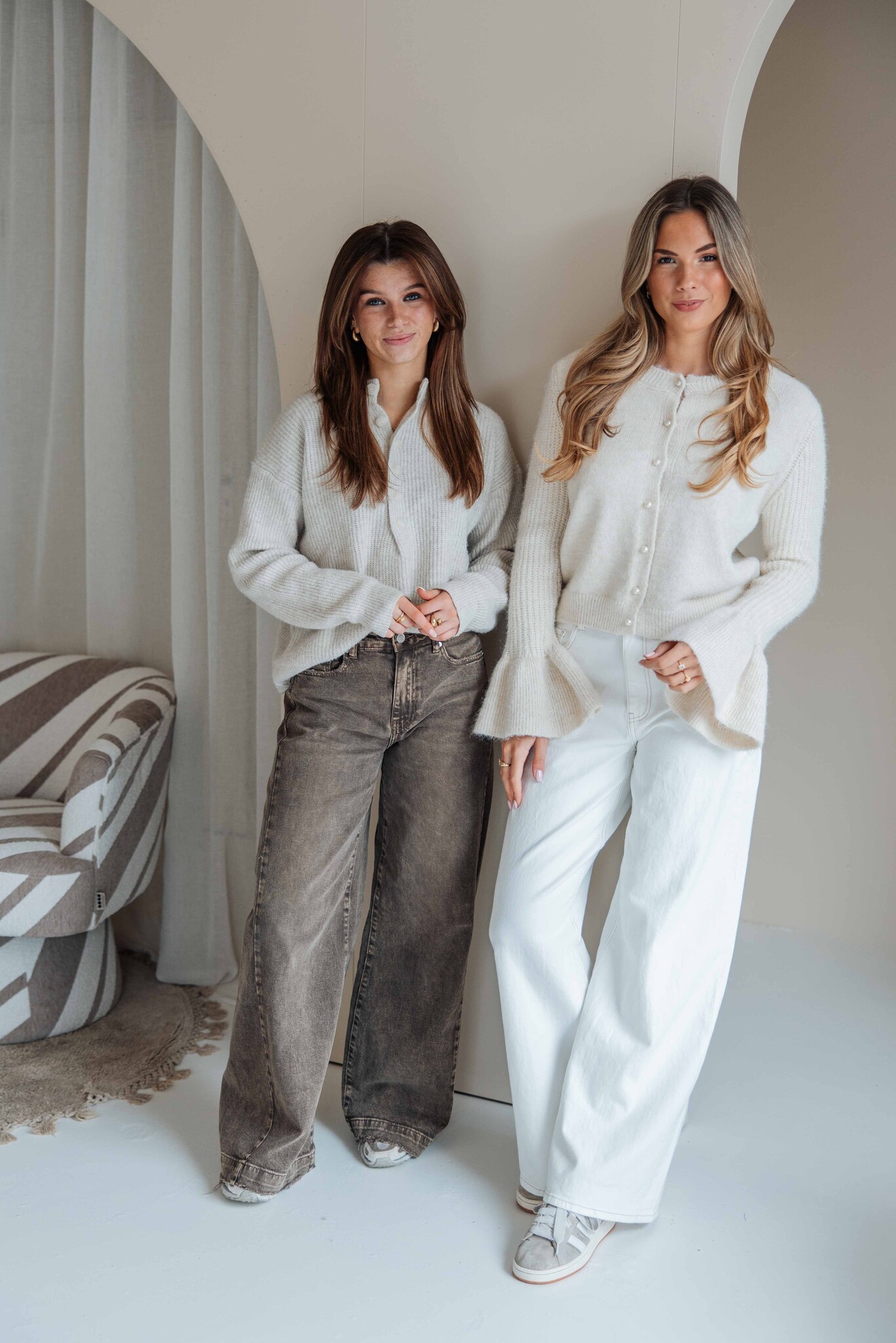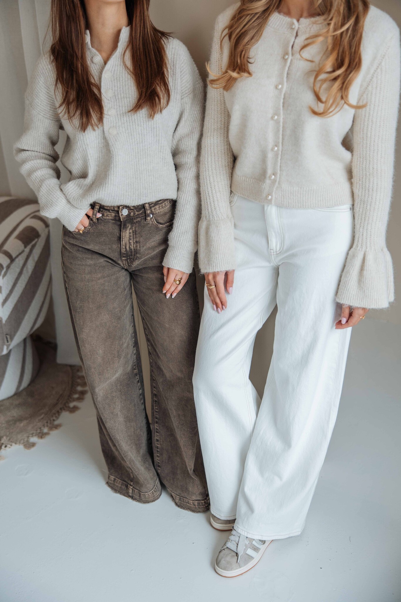 Dit beige vest heeft parelknoopjes van boven tot onder en leuke, wijd uitlopende mouwtjes. De zachte kleur en trendy details geven elke outfit een cozy touch.