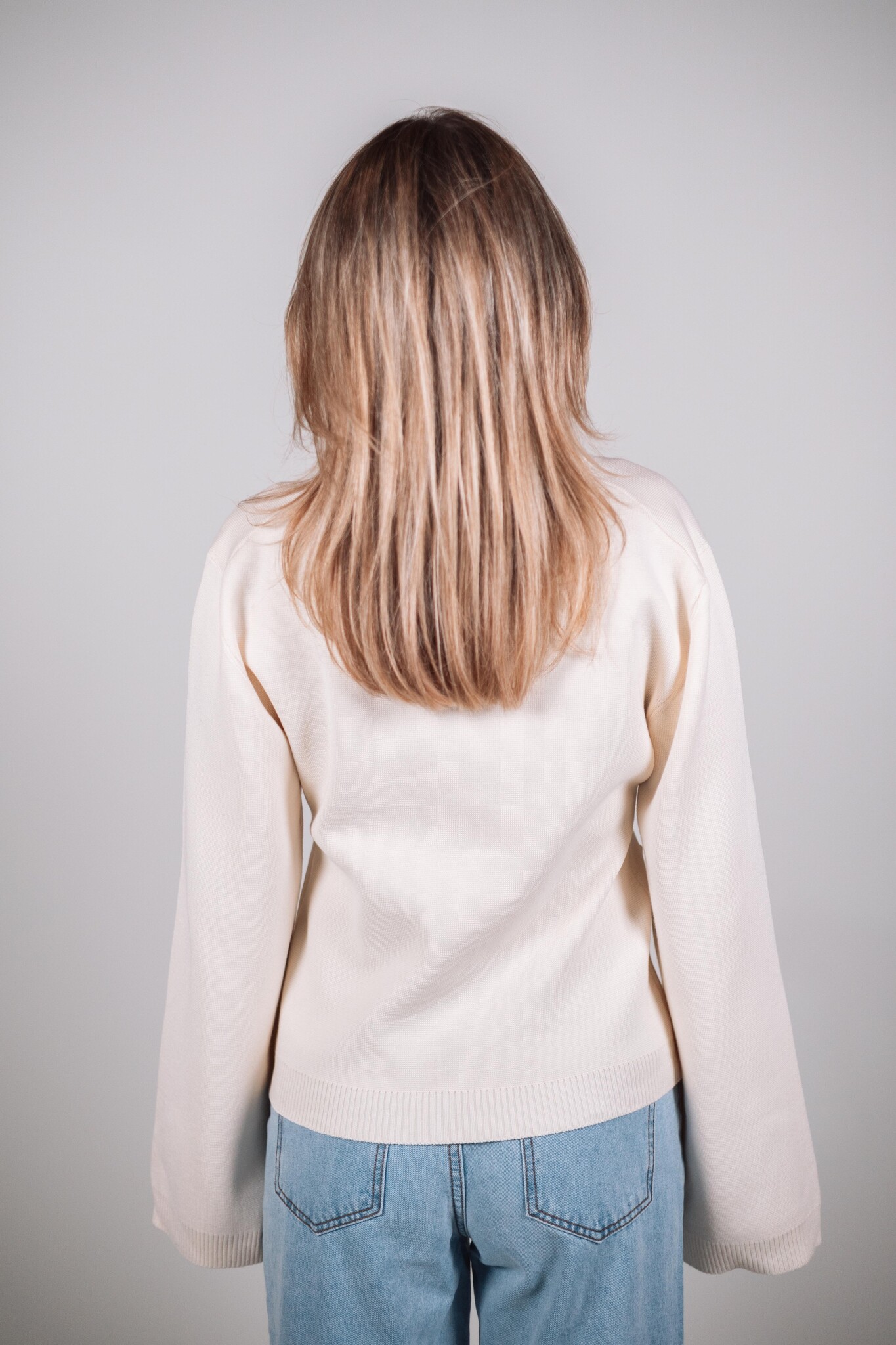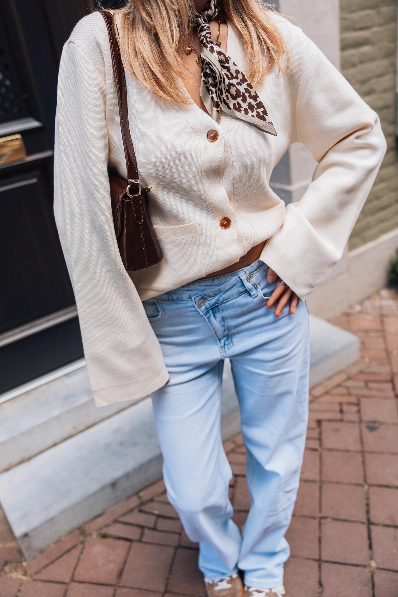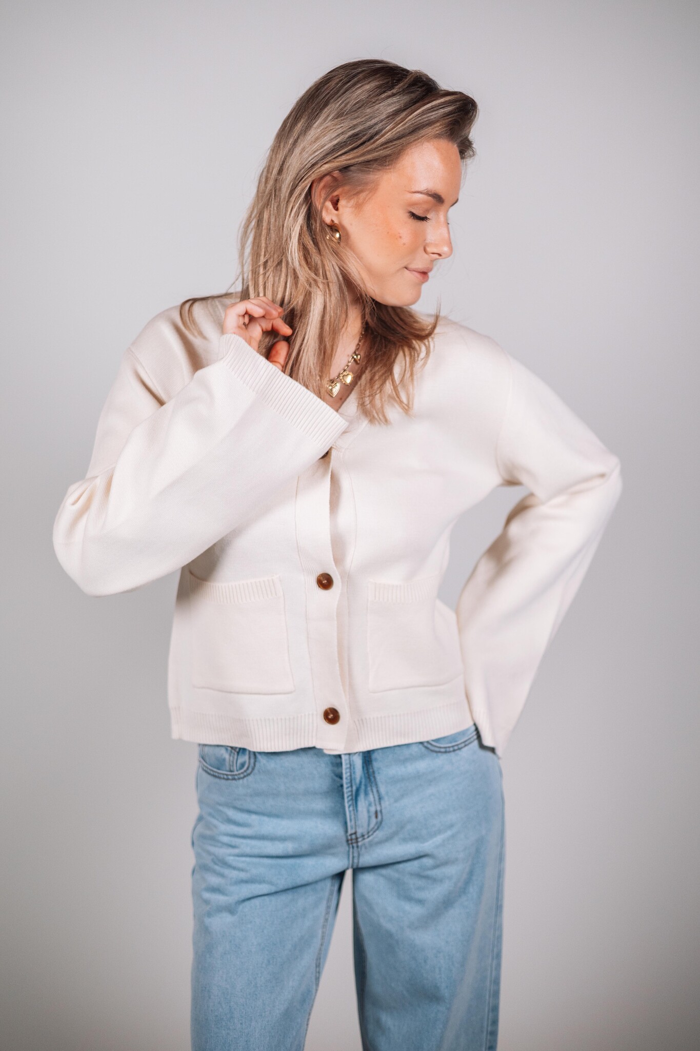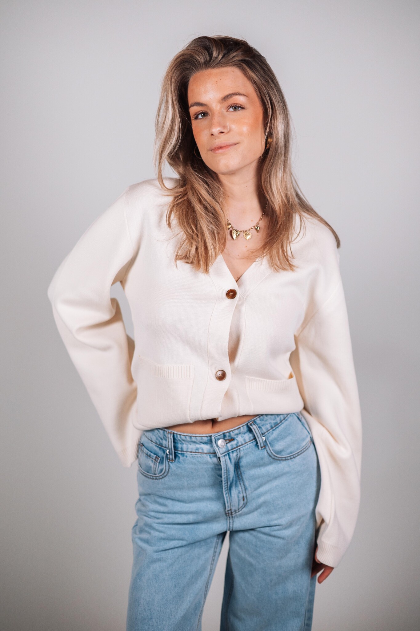 Dit vest heeft wijd uitlopende lange mouwen, is gemaakt van een iets dikker stofje, heeft knoopjes in het midden en twee leuke zakjes als detail.