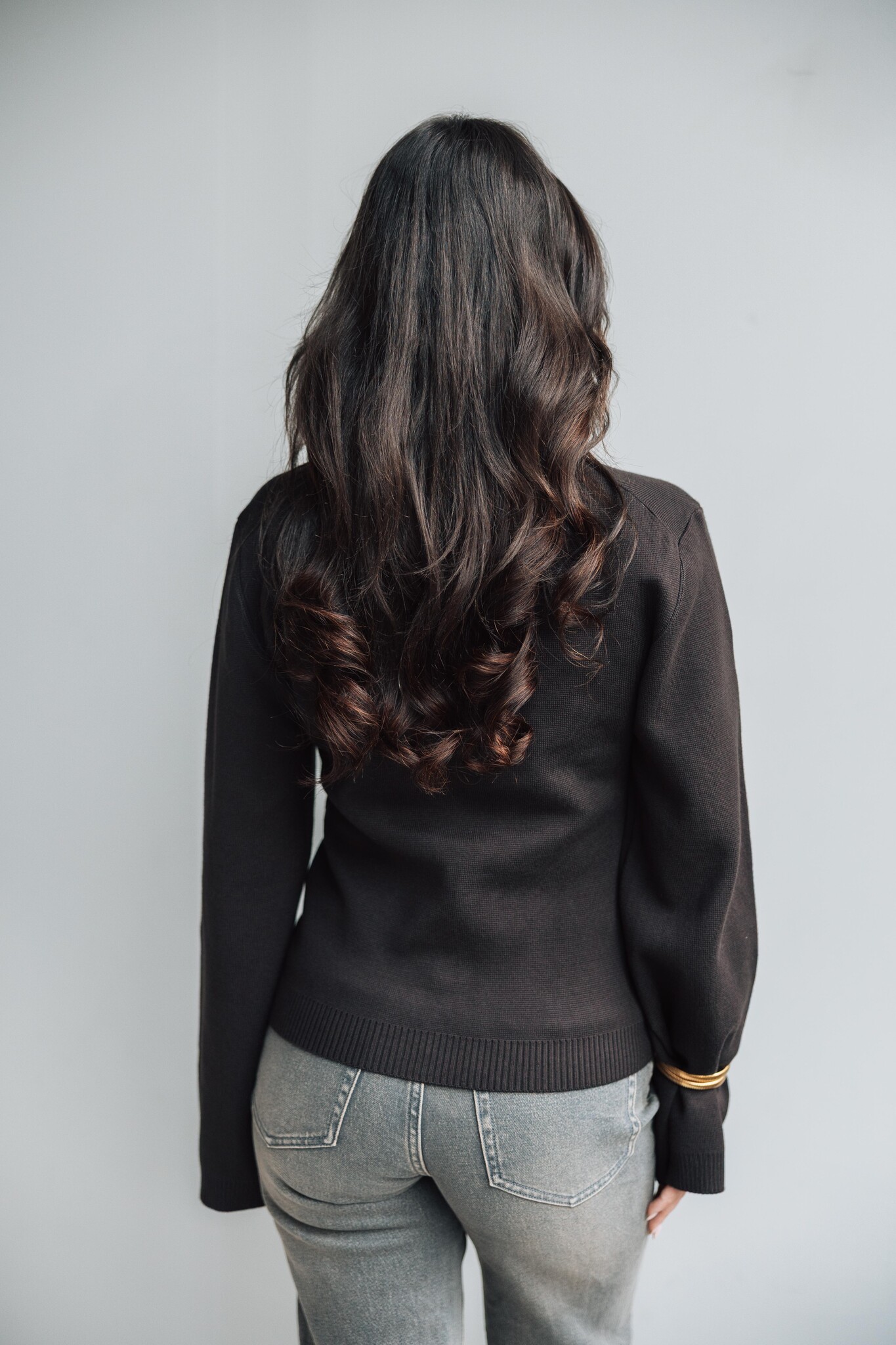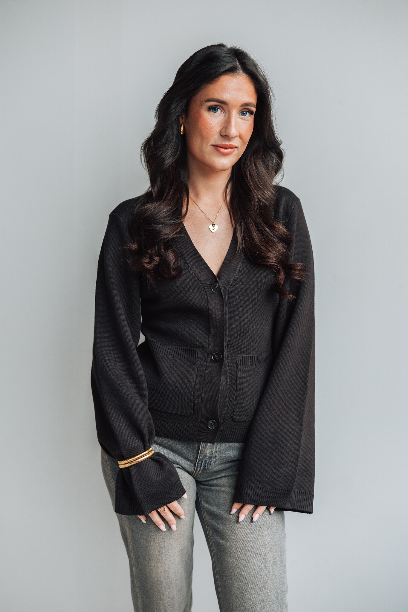 Dit vest heeft wijd uitlopende lange mouwen, is gemaakt van een iets dikker stofje, heeft knoopjes in het midden en twee leuke zakjes als detail.