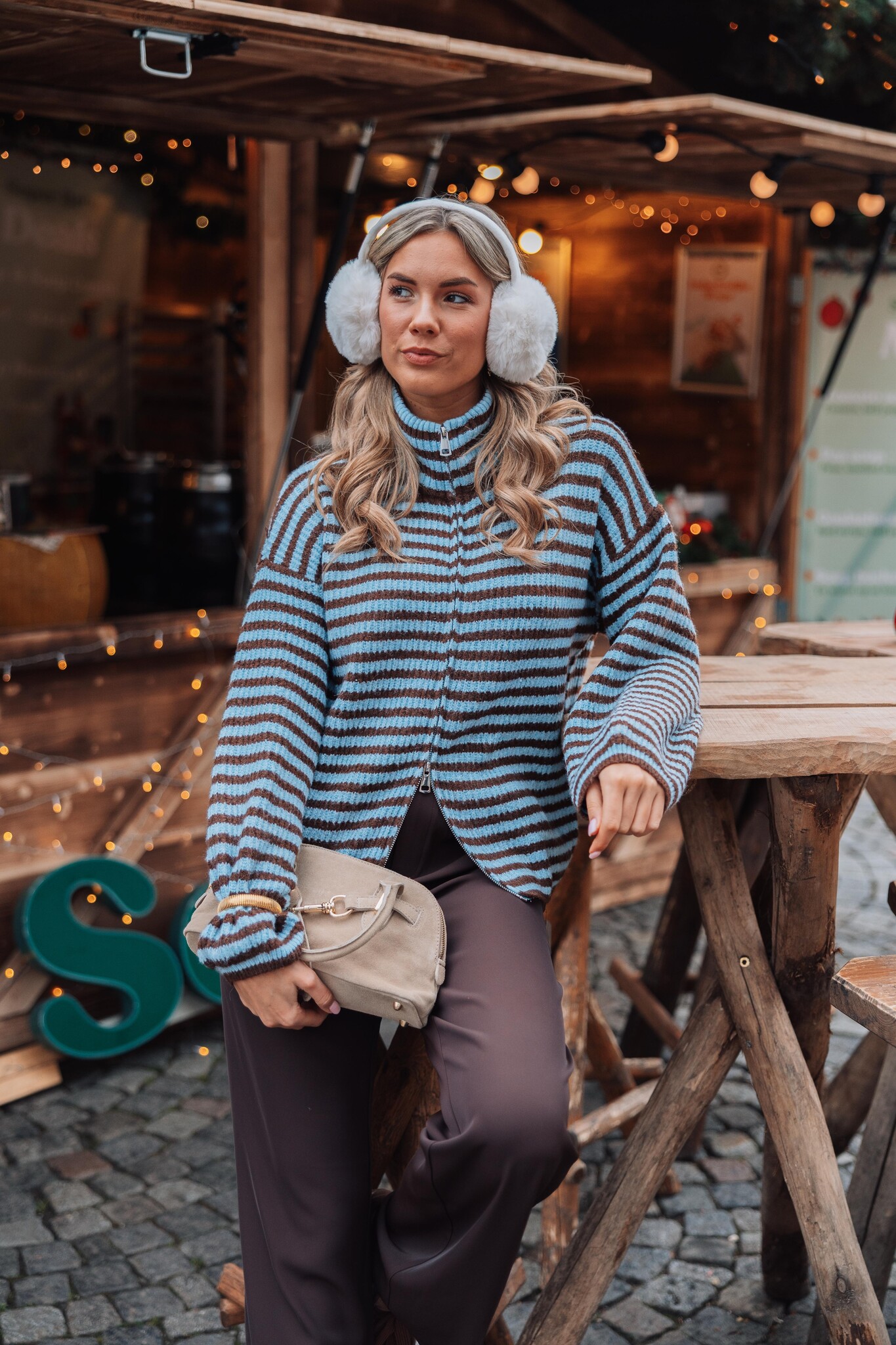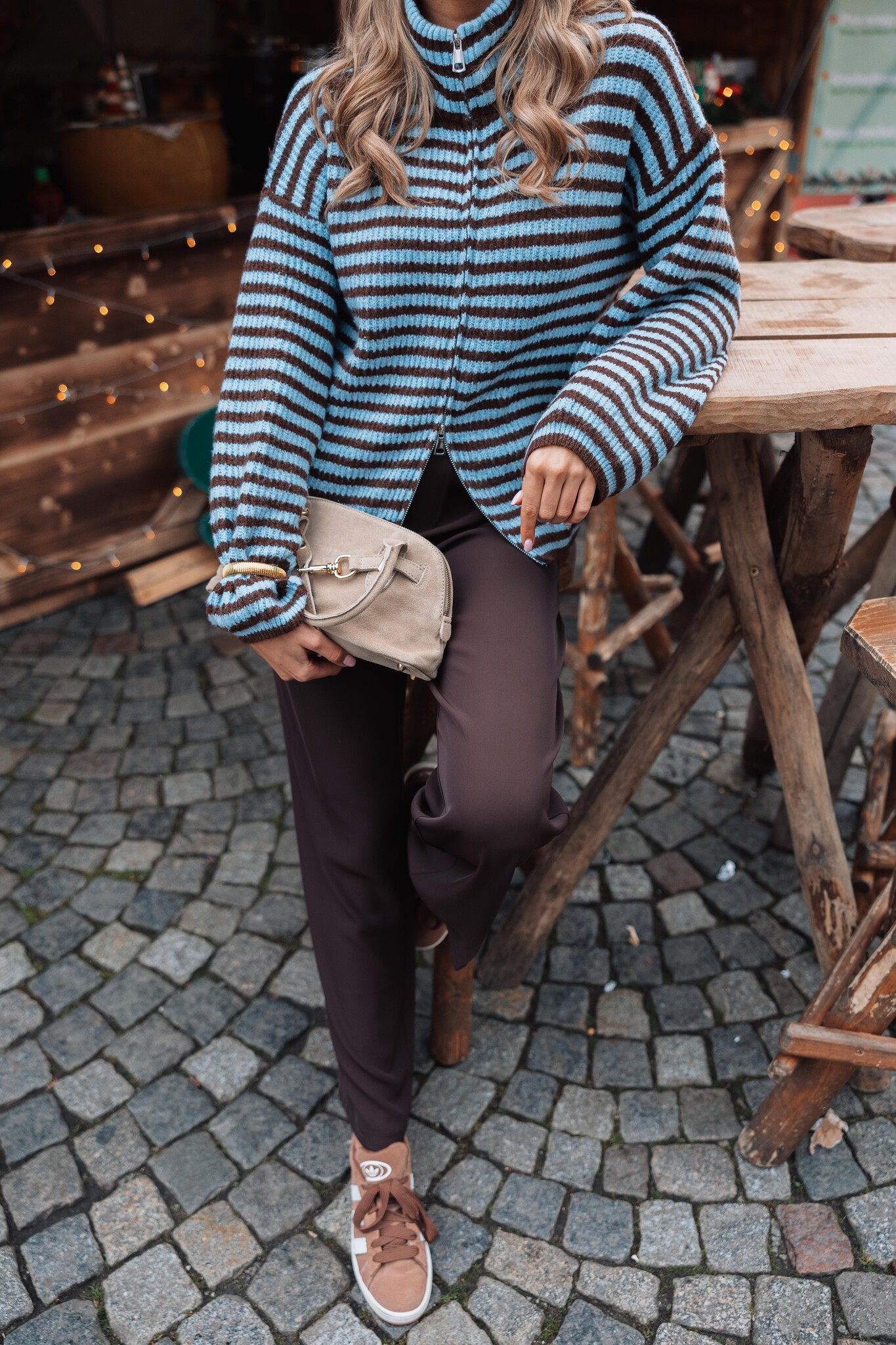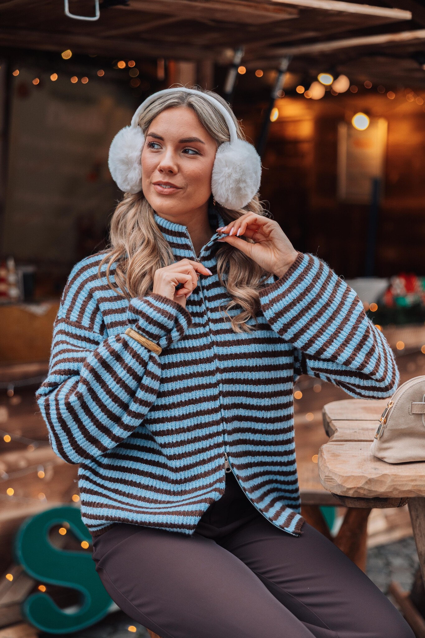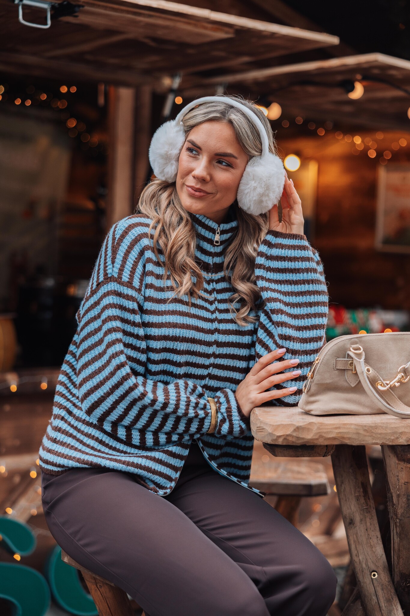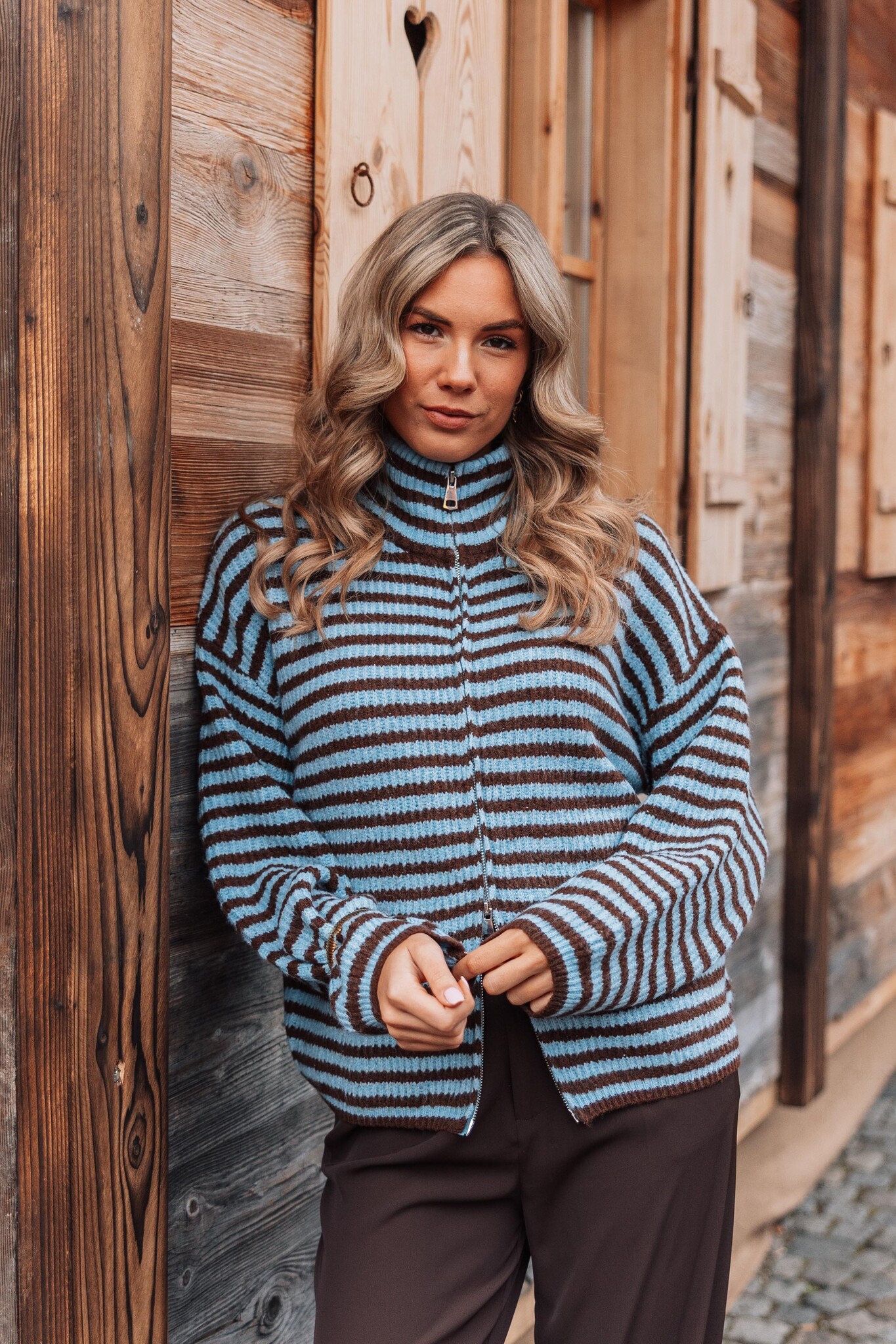 Dit blauwe vest met bruine strepen heeft een rits in het midden, wijde mouwen en een hoge kraag. Een trendy item dat je outfit meteen een comfy & stijlvolle uitstraling geeft!