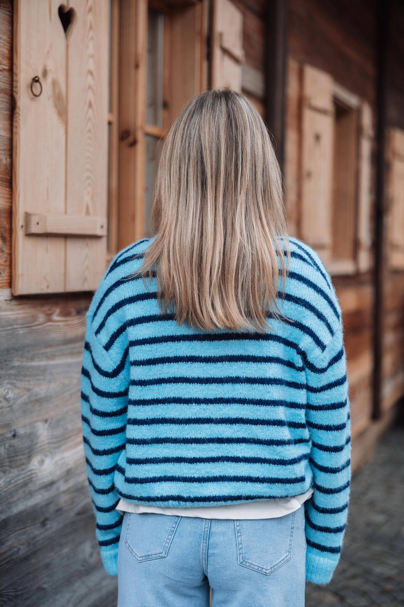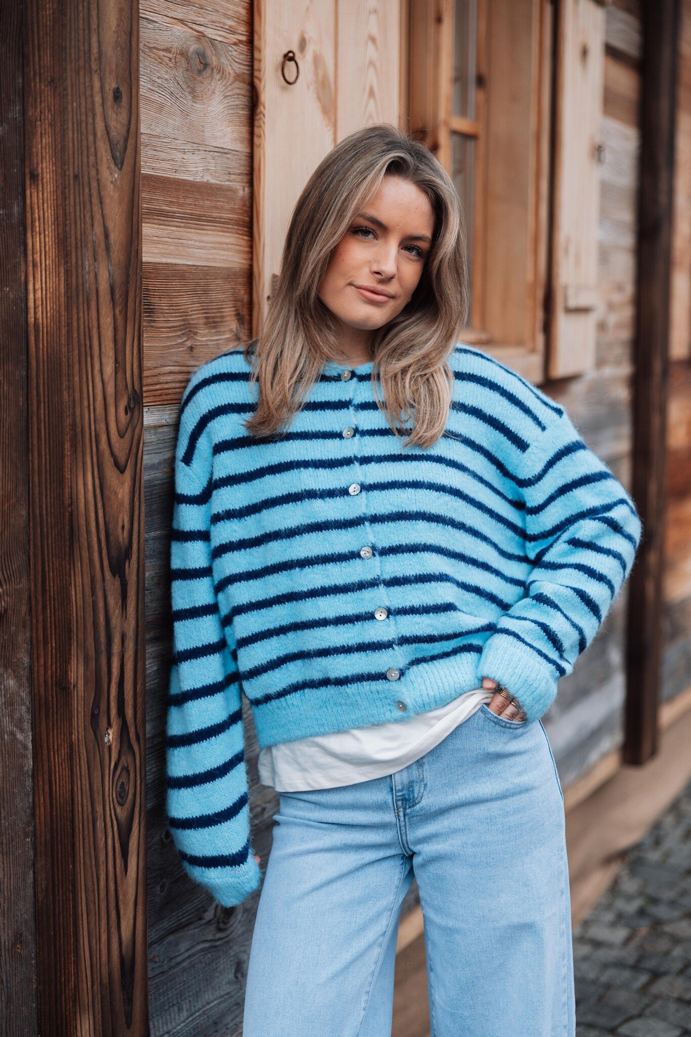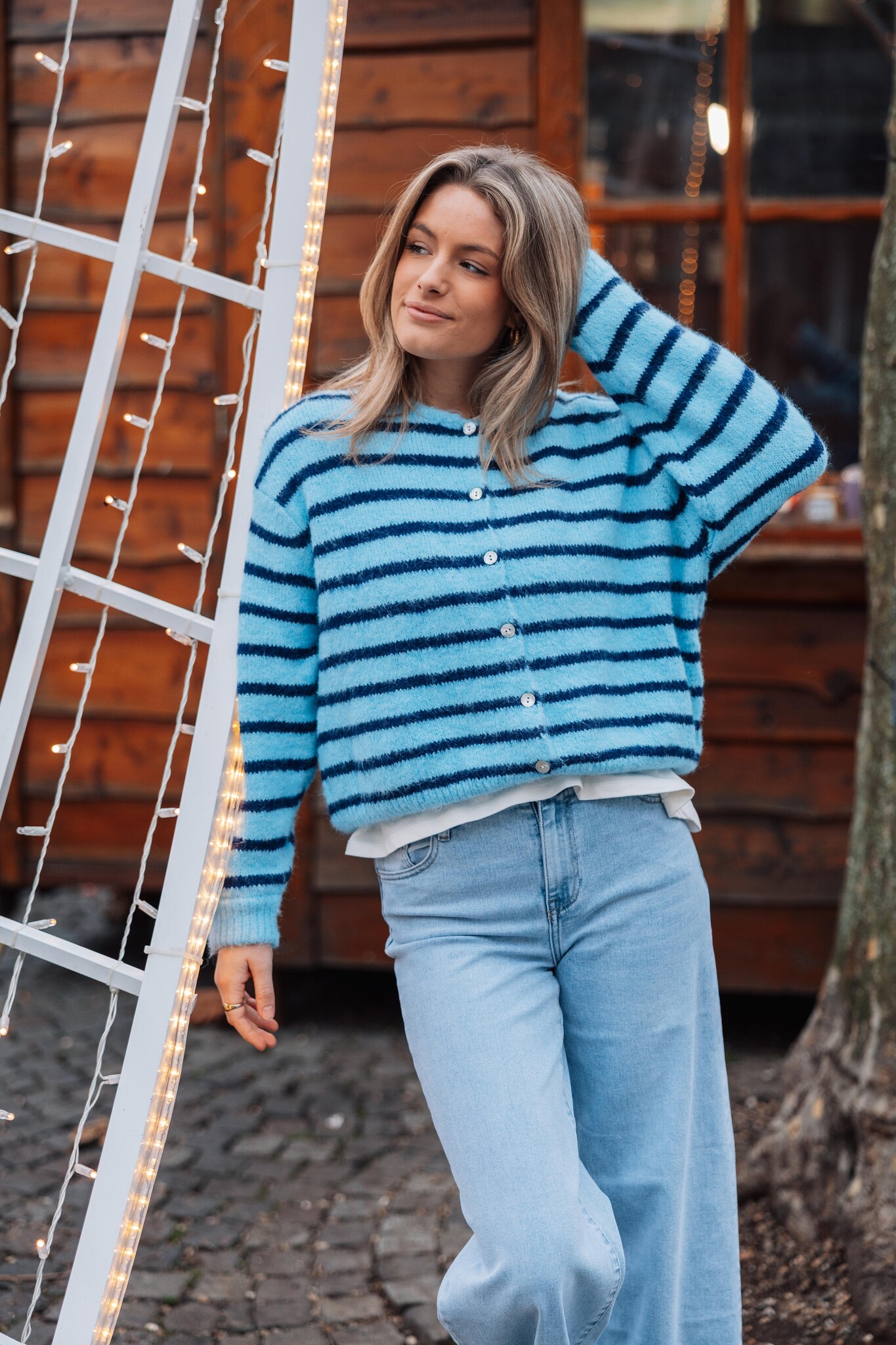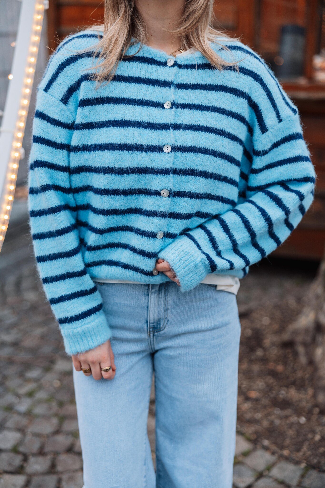Dit lichtblauwe vest met donkerblauwe strepen heeft knoopjes in het midden en is heerlijk comfy. Leuk om casual te dragen met een jeans voor een trendy look!