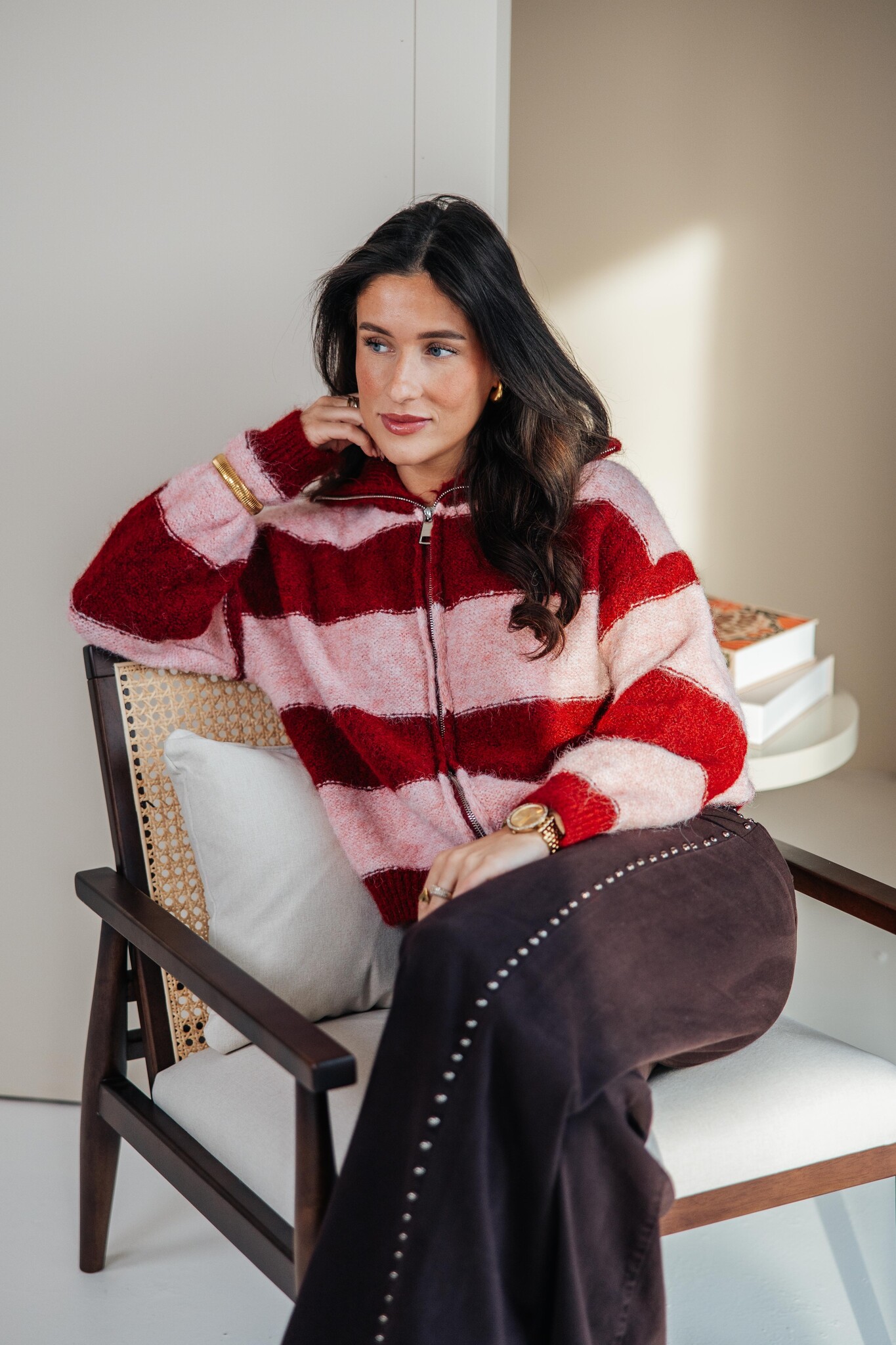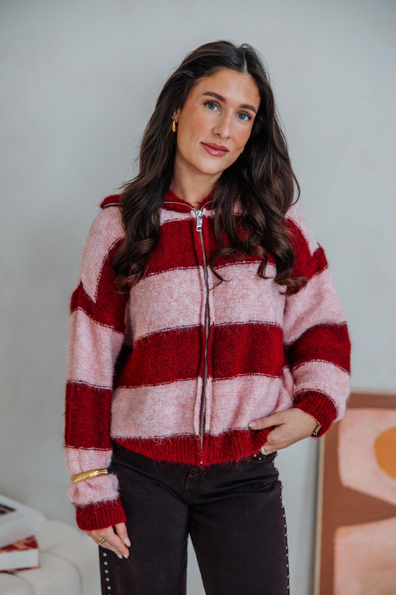 Dit vest heeft een comfy fit, een kraag en een rits van boven tot onder. Het brede streeppatroon in bordeaux en roze geeft ’m een trendy uitstraling, perfect voor elke dag.