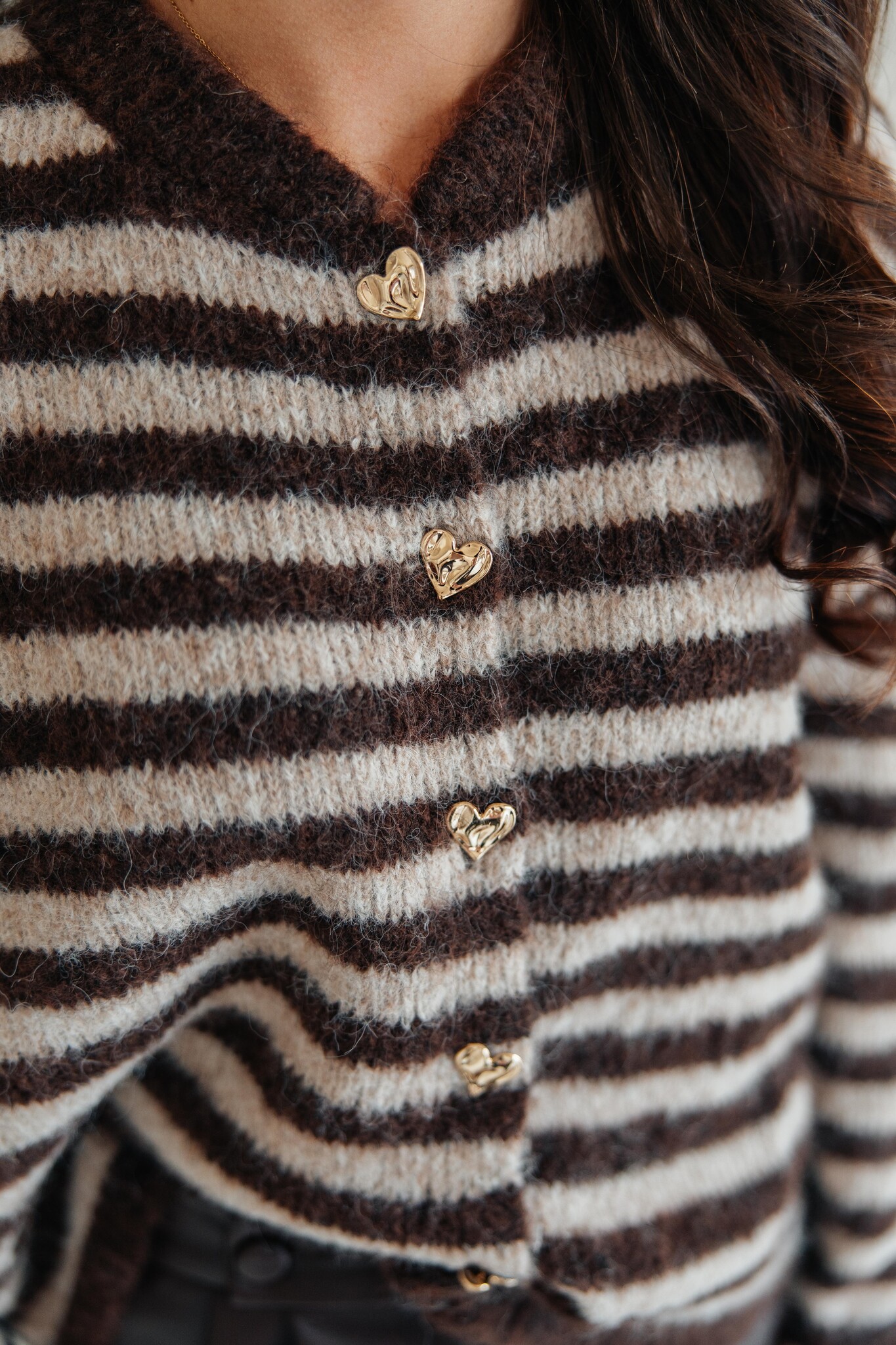 Dit gestreepte vest in bruin en beige tinten heeft gouden hartjesknopen van boven tot onder. Een schattig detail dat elke outfit een extra touch geeft!