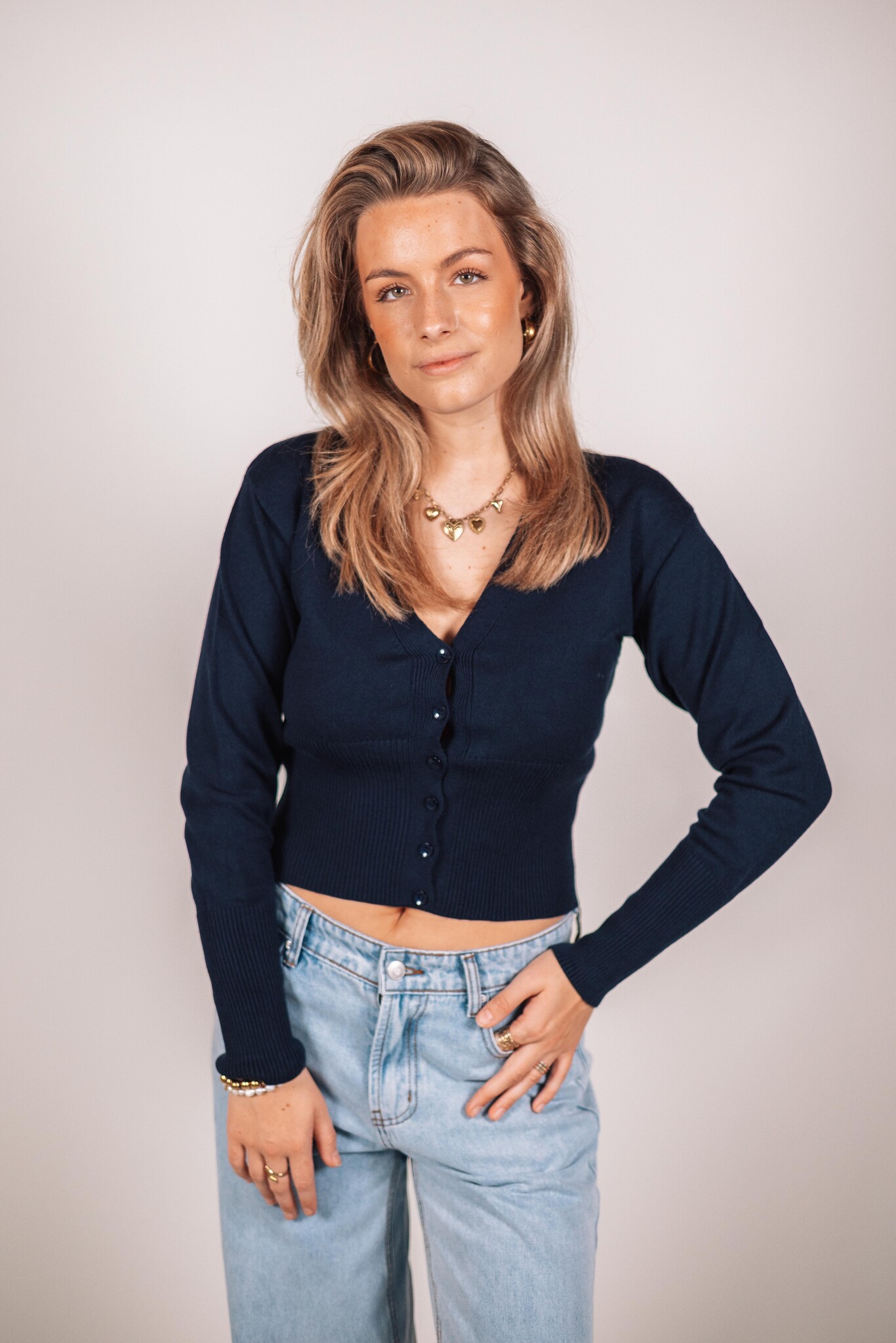 Dit vest heeft lange mouwen, een v-hals, getailleerde fit en knoopjes in het midden. Een tijdloze musthave!