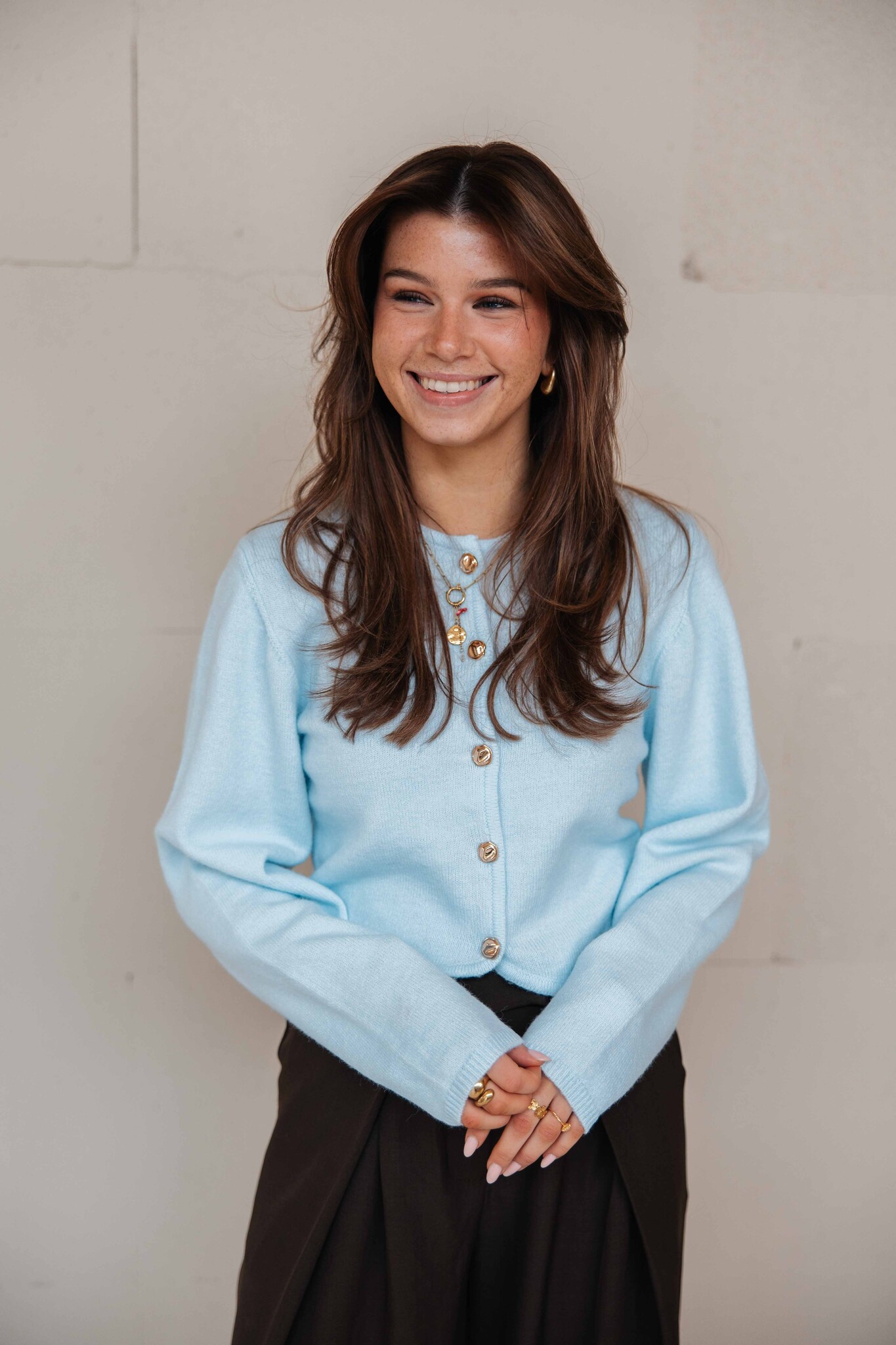 Dit lichtblauwe vestje heeft gouden knoopjes in het midden en een golvend detail aan de onderkant, wat een speels en stijlvol accent geeft. Perfect om te combineren met een pantalon!